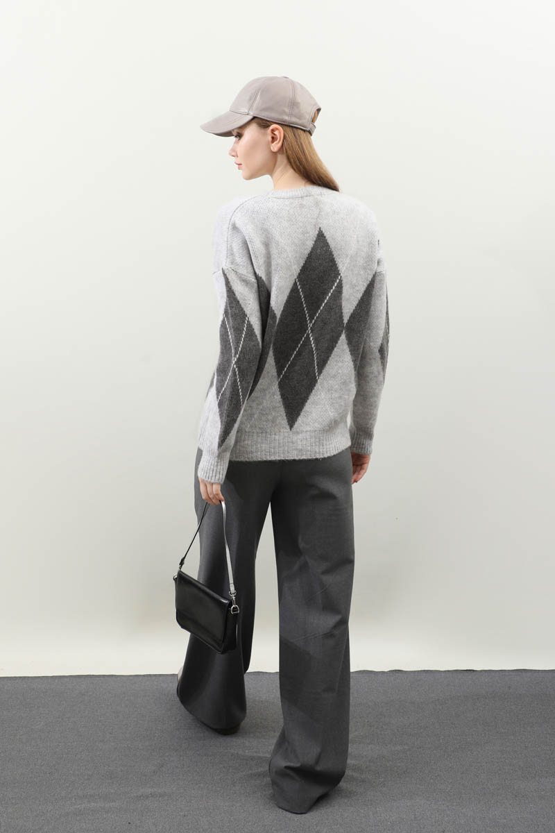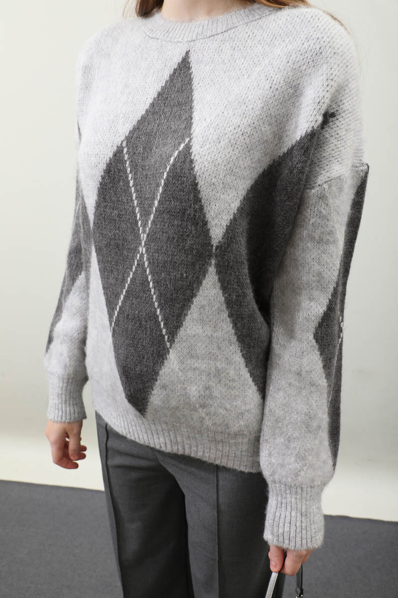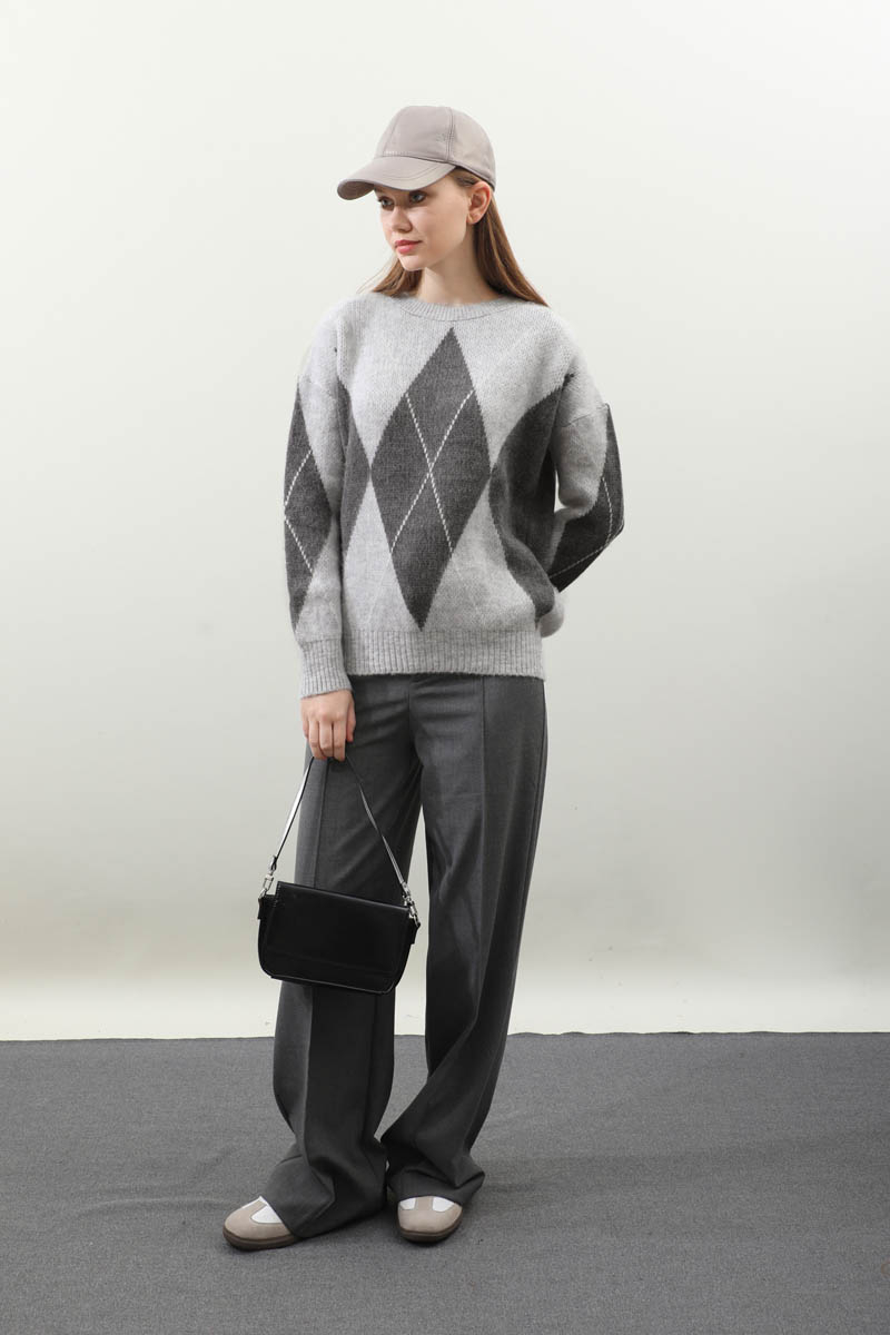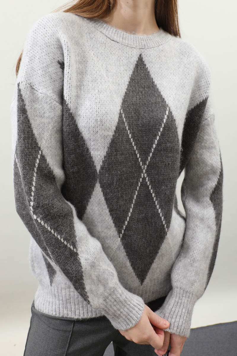 Büyük Baklava Desenli Kazak Gri. Bisiklet düşük omuzludur, yaka, manşet ve etek ucu ribanalıdır, kendiliğinden büyük baklava desenlidir. Günlük kullanım ve özel günlerinizde tercih edebilirsiniz.