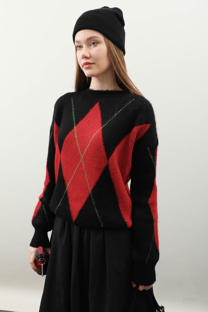Büyük Baklava Desenli Kazak Kırmızı. Bisiklet düşük omuzludur, yaka, manşet ve etek ucu ribanalıdır, kendiliğinden büyük baklava desenlidir. Günlük kullanım ve özel günlerinizde tercih edebilirsiniz.