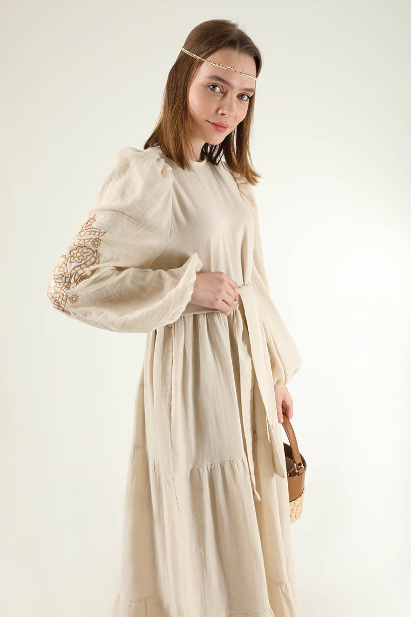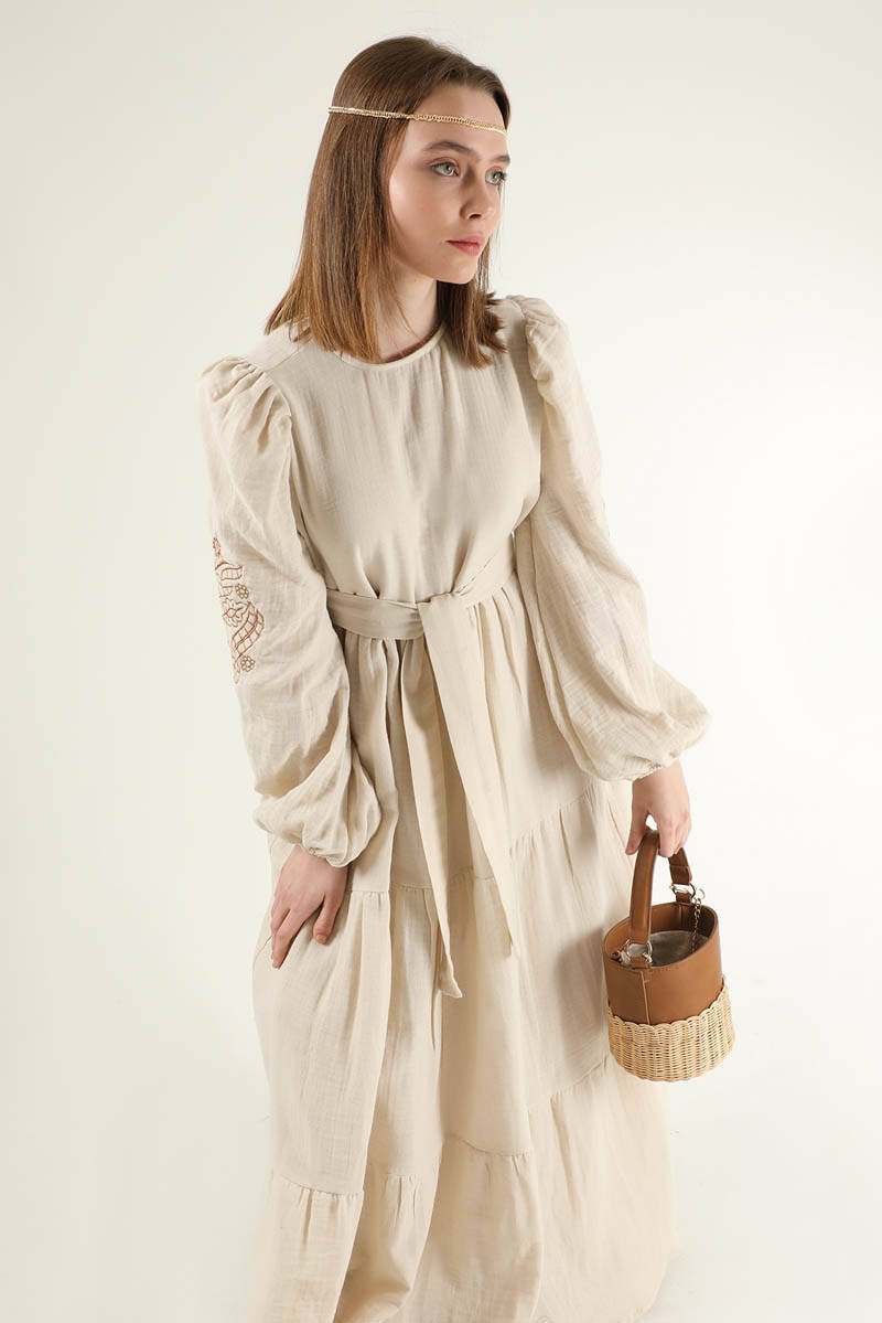 Büzgü Detaylı Kuşaklı Elbise Taş