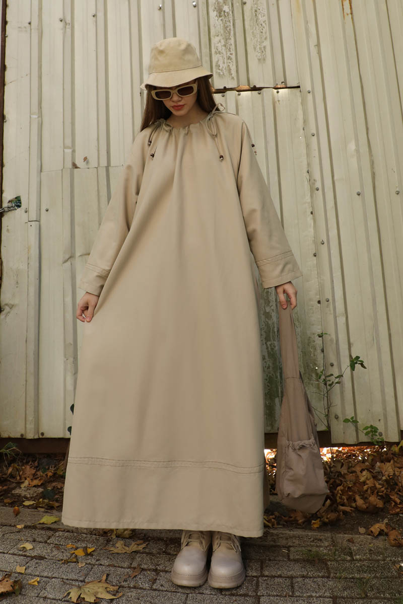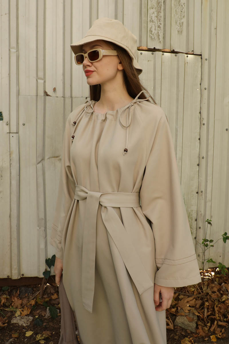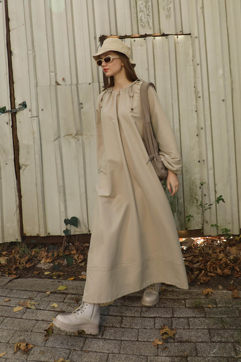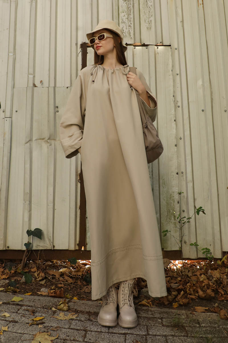 Büzgü Yaka Elbise Krem. Yakası ayarlanabilir büzgü detaylıdır, reglan kolludur, kol kalın manşetlidir, kuşaklıdır, yandan gizli ceplidir, astarsızdır, Günlük kullanım ve özel günlerinizde tercih edebilirsiniz.