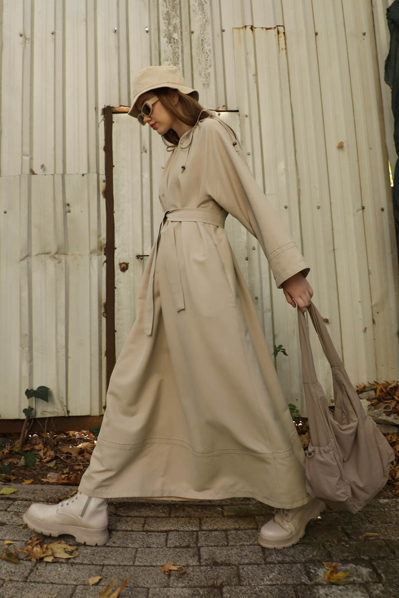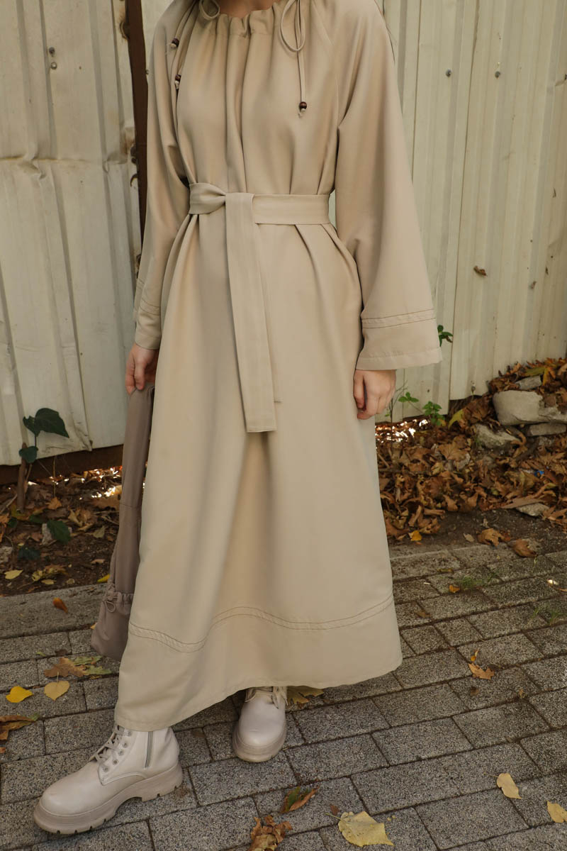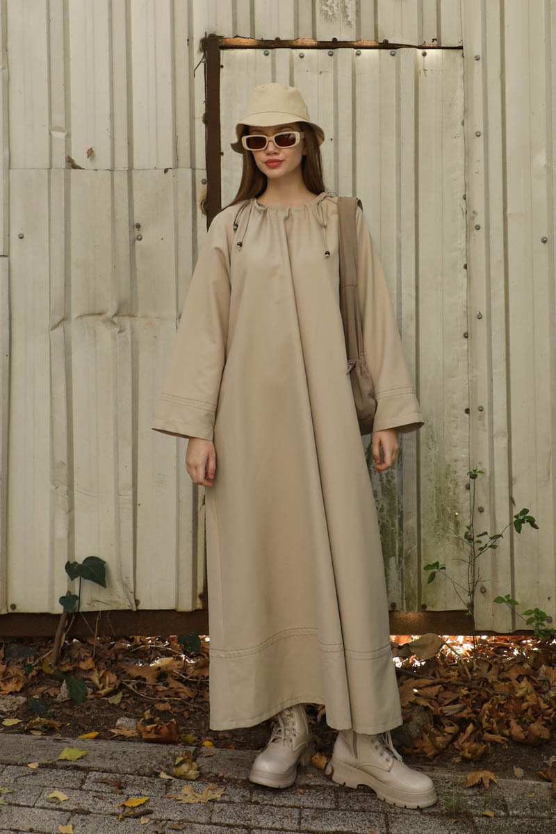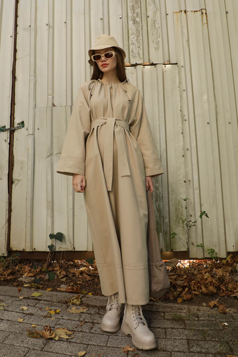 Büzgü Yaka Elbise Krem. Yakası ayarlanabilir büzgü detaylıdır, reglan kolludur, kol kalın manşetlidir, kuşaklıdır, yandan gizli ceplidir, astarsızdır, Günlük kullanım ve özel günlerinizde tercih edebilirsiniz.