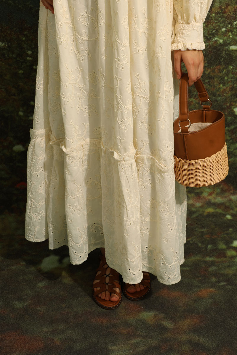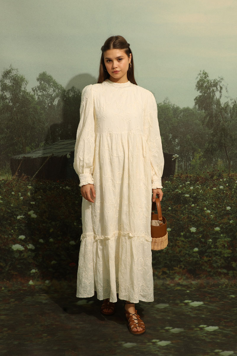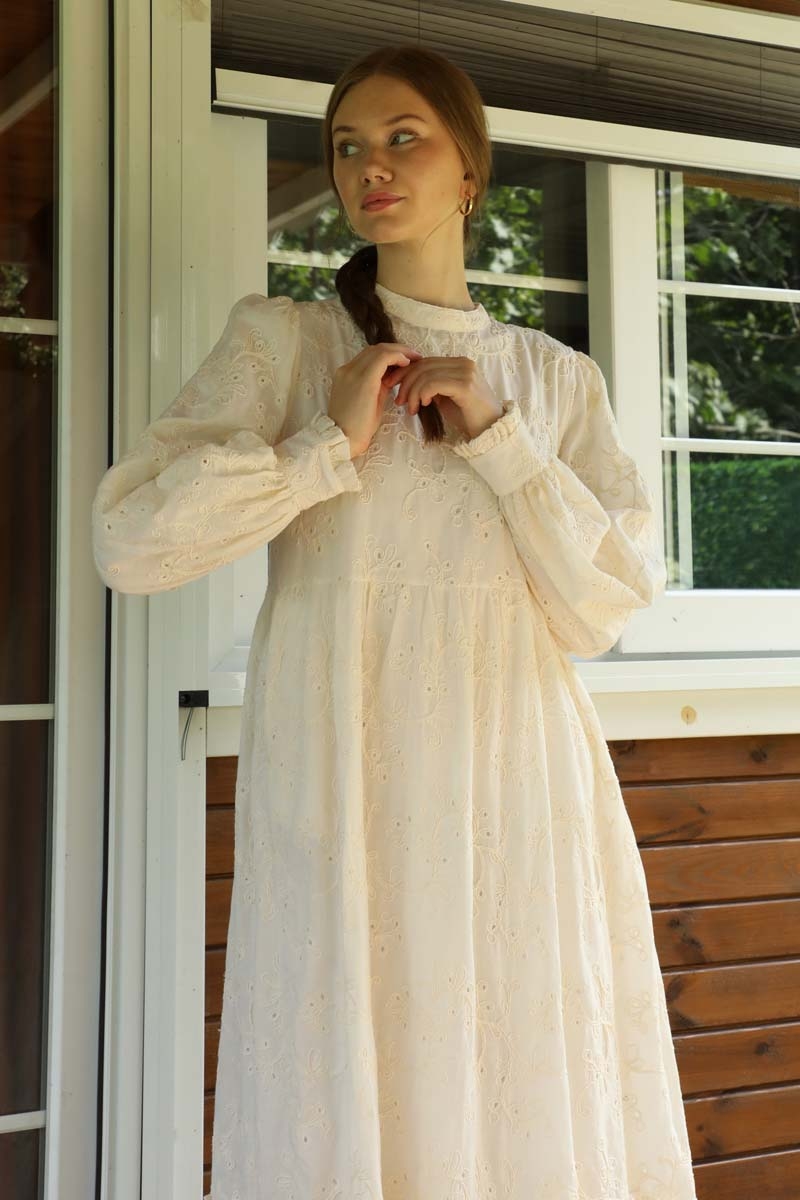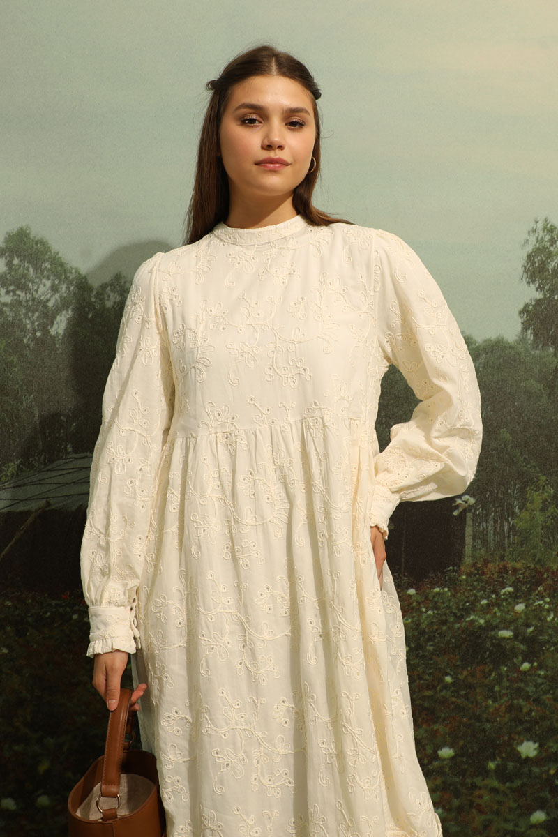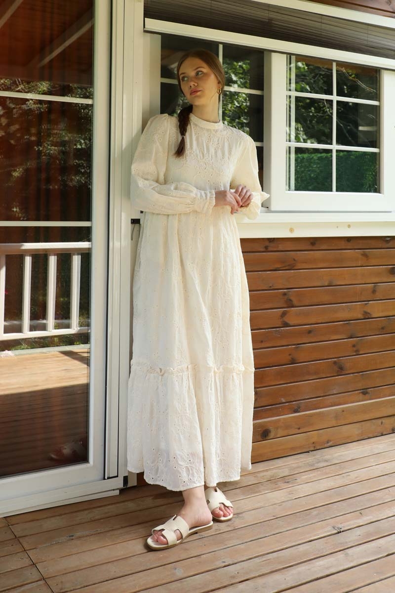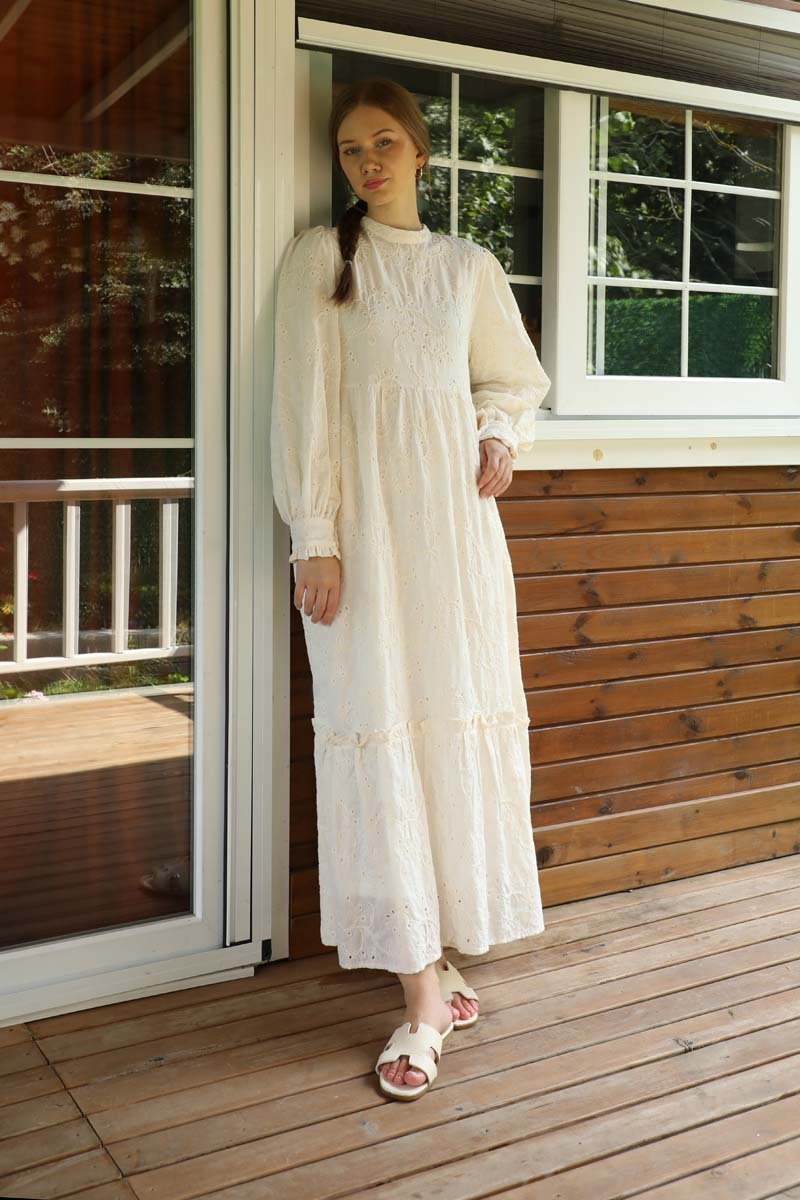 Büzgülü Brode Elbise Krem, hakim yakalıdır, manşetleri fırfırlıdır, omuzu büzgülüdür, arkadan fermuarlıdır, beli büzgülüdür, etek kısmında fırfır detayı vardır, astarlıdır, astarı ayrıdır sabit değildir, yandan gizli ceplidir.Ürün içliği son görselde mevcuttur.