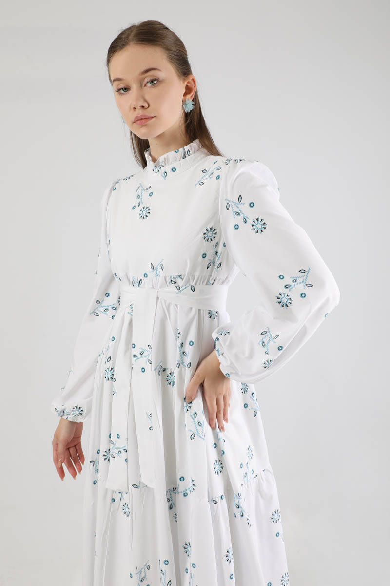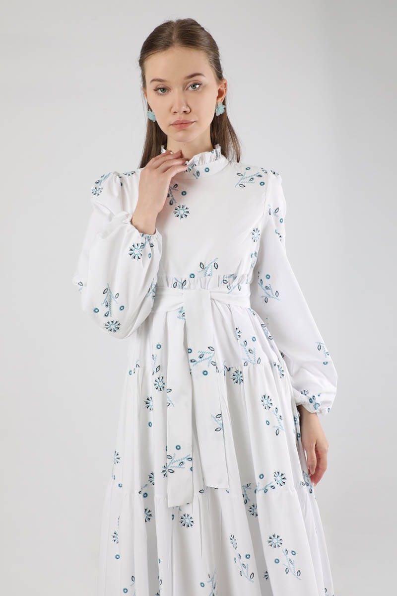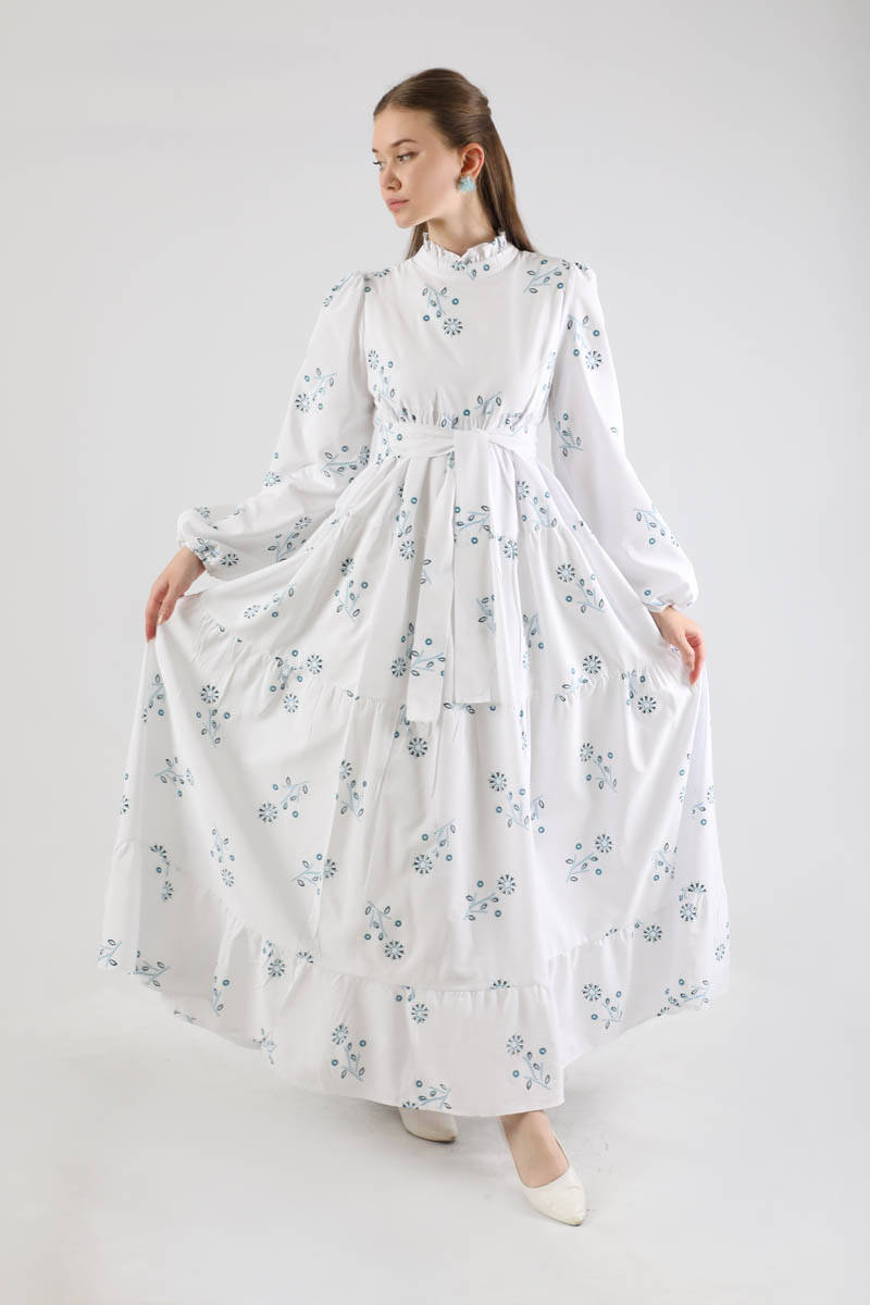 Büzgülü Desenli Poplin Elbise Beyaz. Fırfır yakalıdır. Omuz tepesi büzgülüdür. Belden kesik detaylıdır. Manşeti lastiklidir. Arkadan fermuarlıdır. Kuşaklıdır. Sadece beyaz renkte astar mevcuttur. Günlük kullanım ve özel günlerinizde tercih edebilirsiniz.