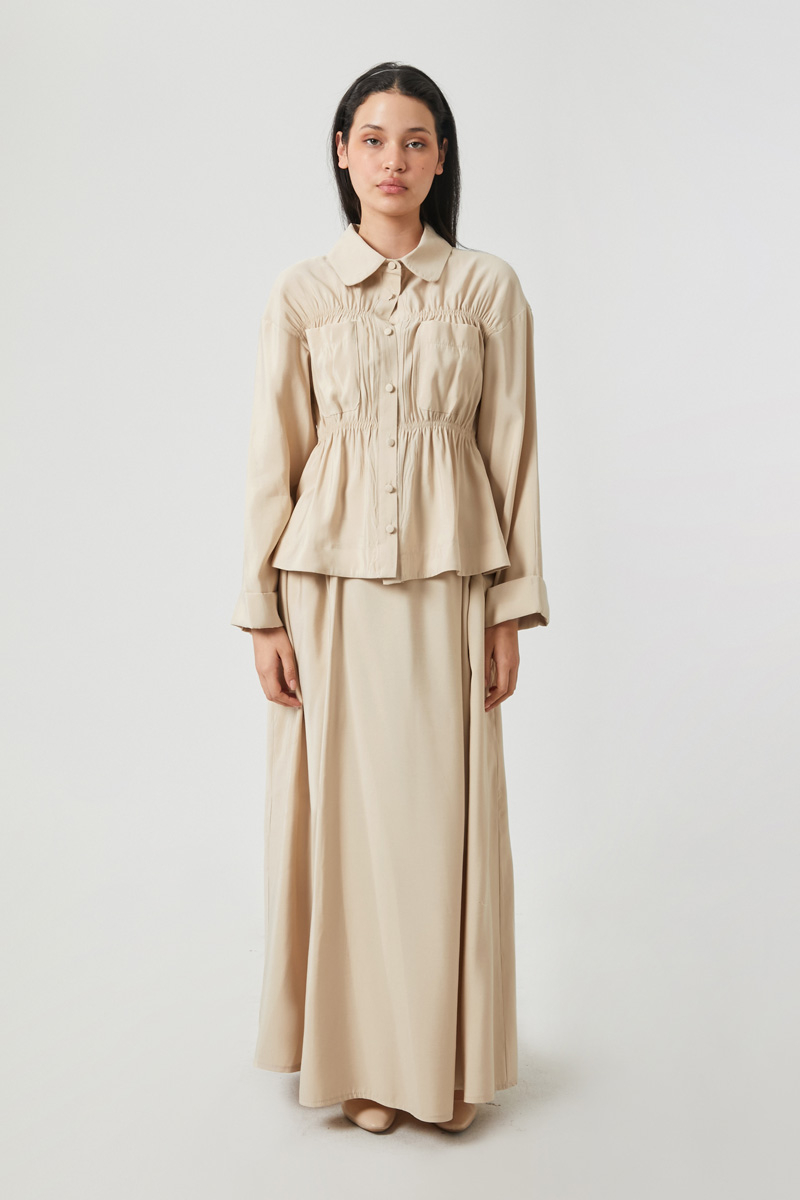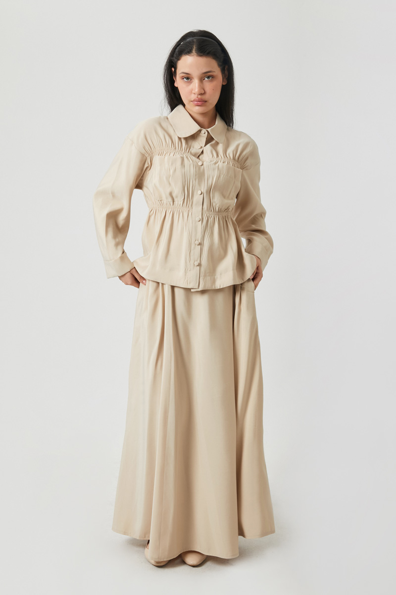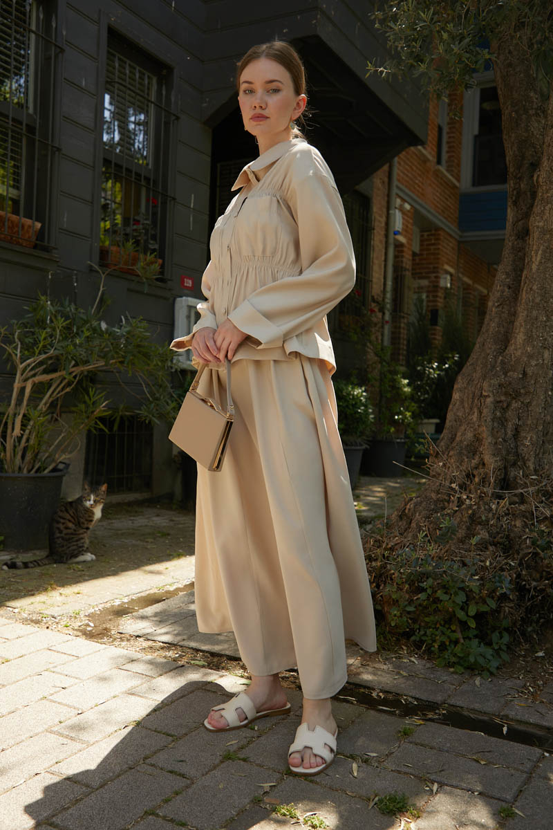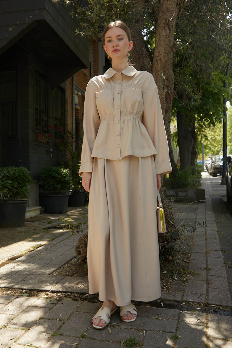 Büzgülü Etek Takım Taş. Bebe yakadır, düşük omuzludur, double kolludur, bedeni büzgü lastik detaylıdır, Önden ceplidir, düğmelidir. Etek: Belden cup dikiş detaylıdır, büzgülüdür, arka bel lastiklidir, yandan gizli fermuarlı olup ceplidir, astarsız.