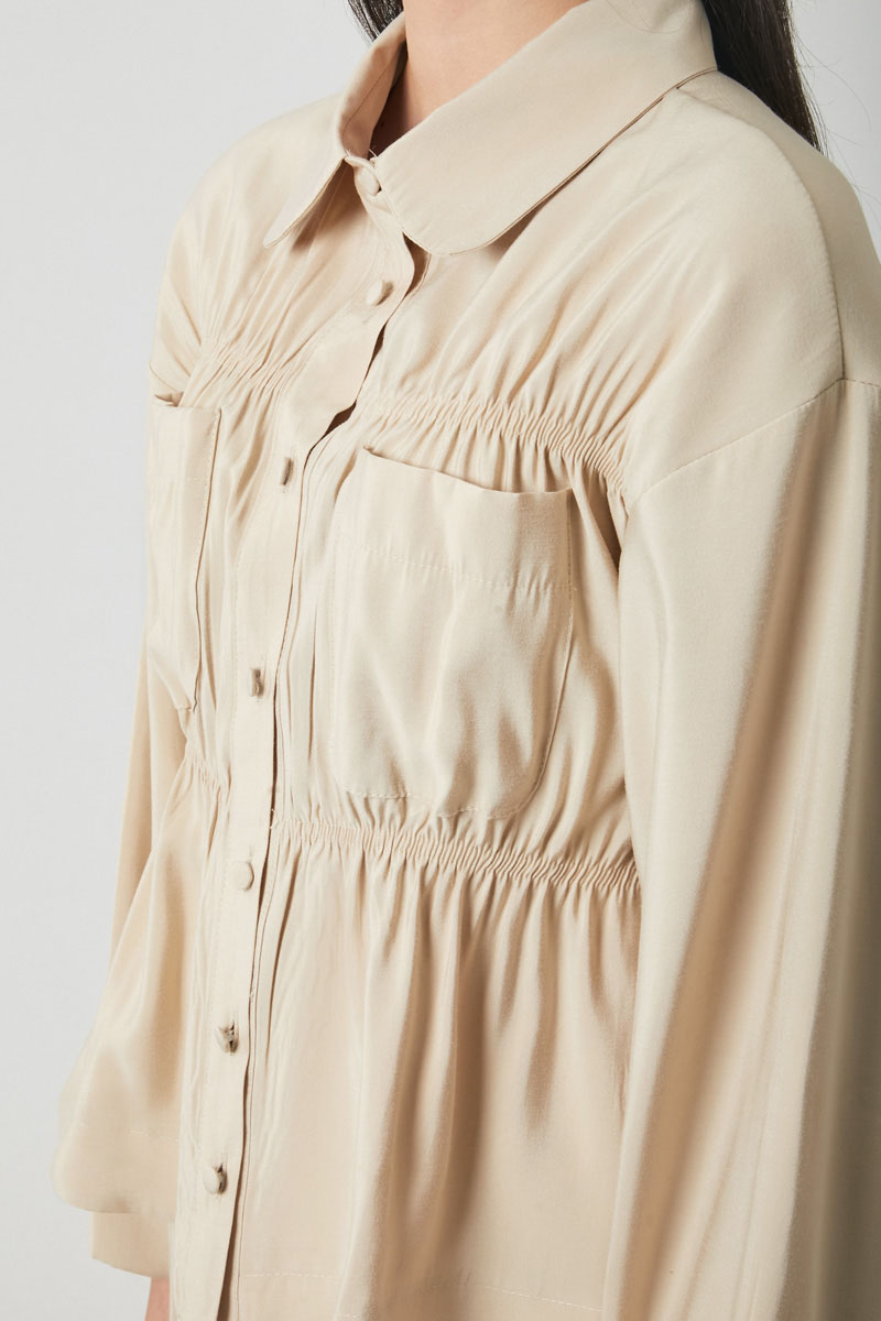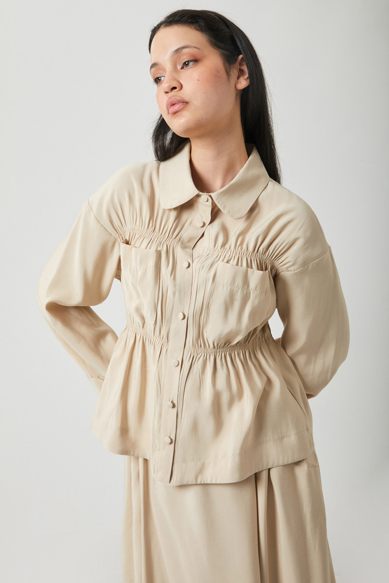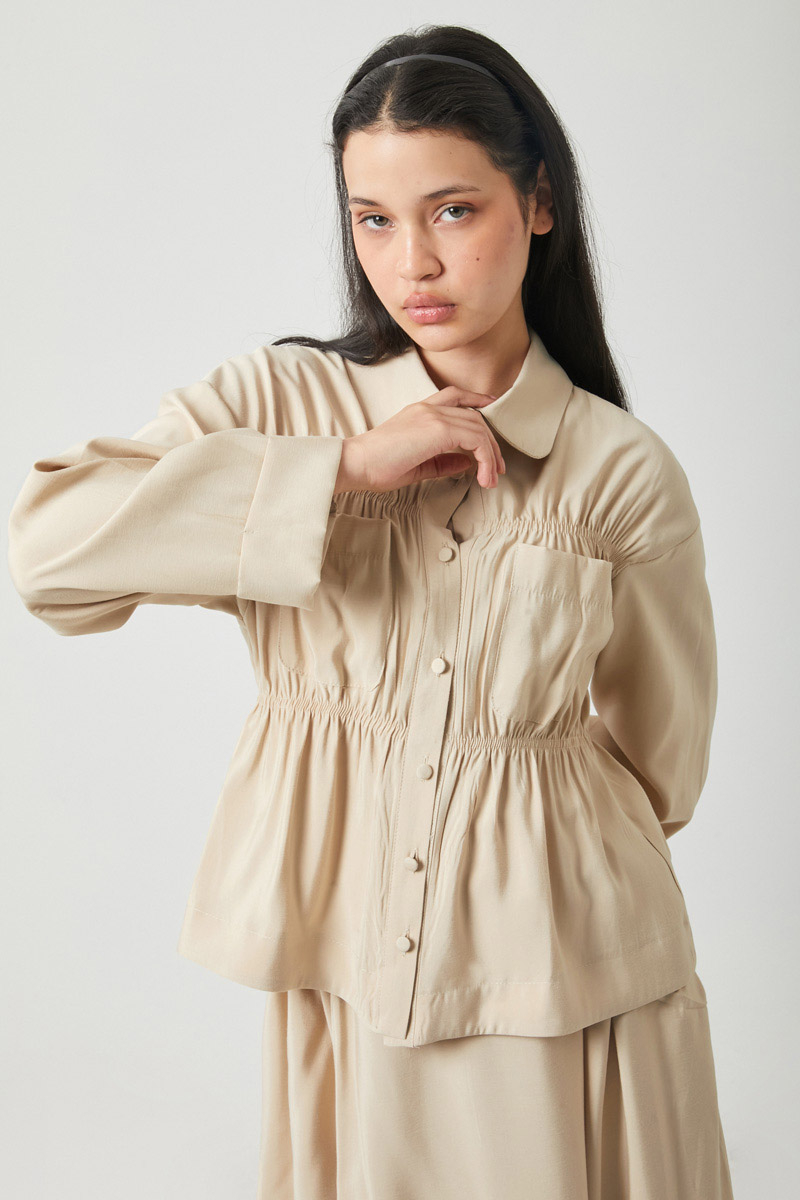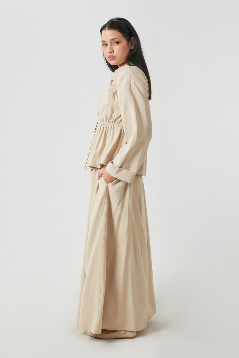 Büzgülü Etek Takım Taş. Bebe yakadır, düşük omuzludur, double kolludur, bedeni büzgü lastik detaylıdır, Önden ceplidir, düğmelidir. Etek: Belden cup dikiş detaylıdır, büzgülüdür, arka bel lastiklidir, yandan gizli fermuarlı olup ceplidir, astarsız.