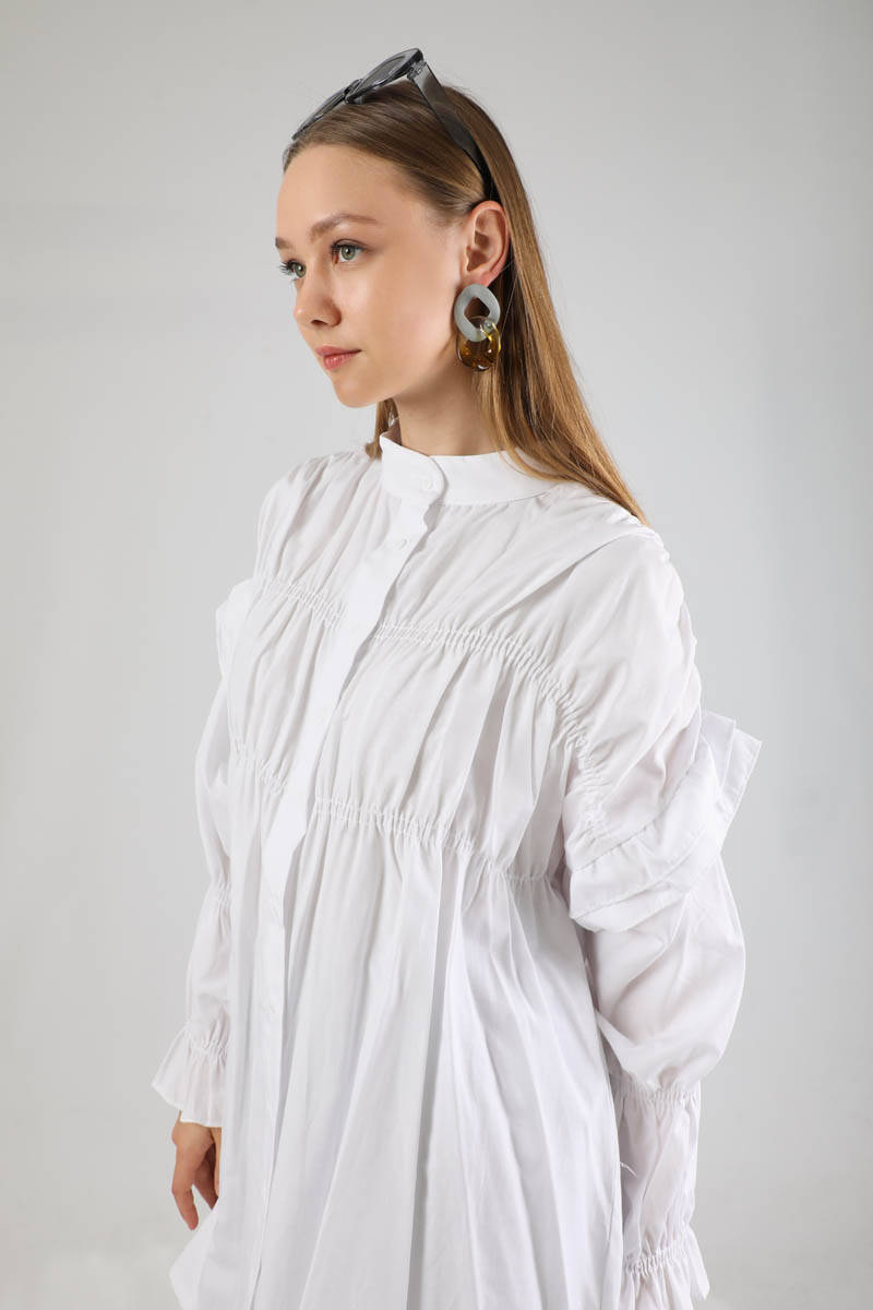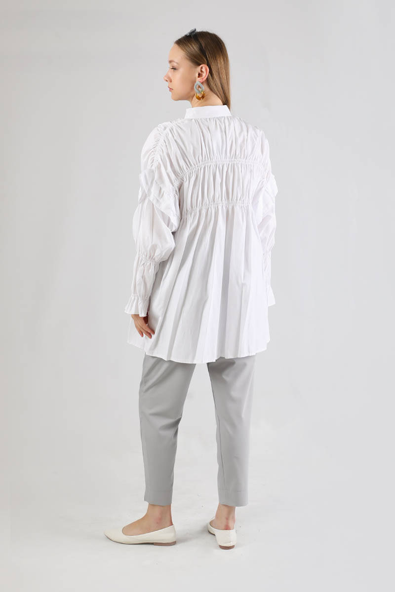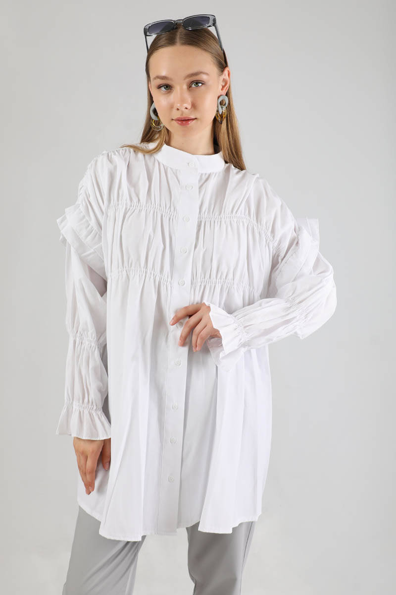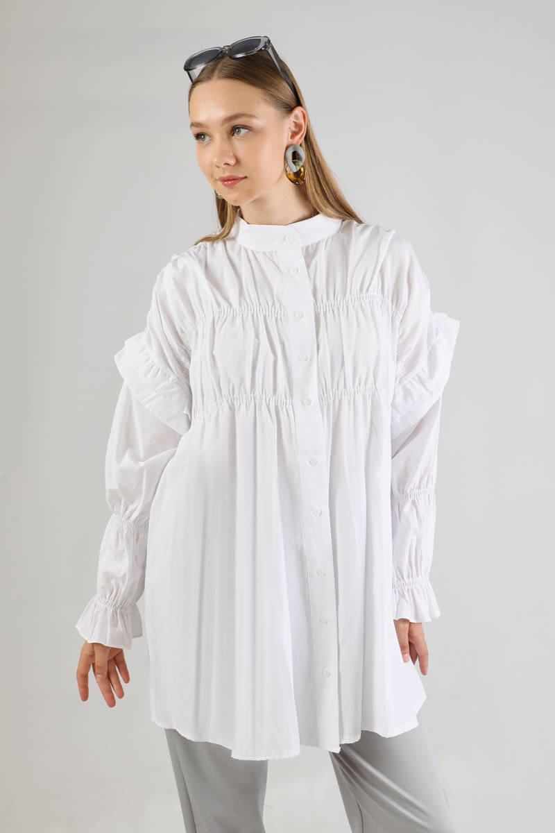 Büzgülü Gömlek Beyaz. Hakim yakalıdır. Önden yarım düğmelidir. Önden ve arkadan lastikli büzgü detaylıdır. Manşeti lastikli fırfır detaylıdır. Günlük kullanım ve Özel günlerinizde tercih edebilirsiniz.