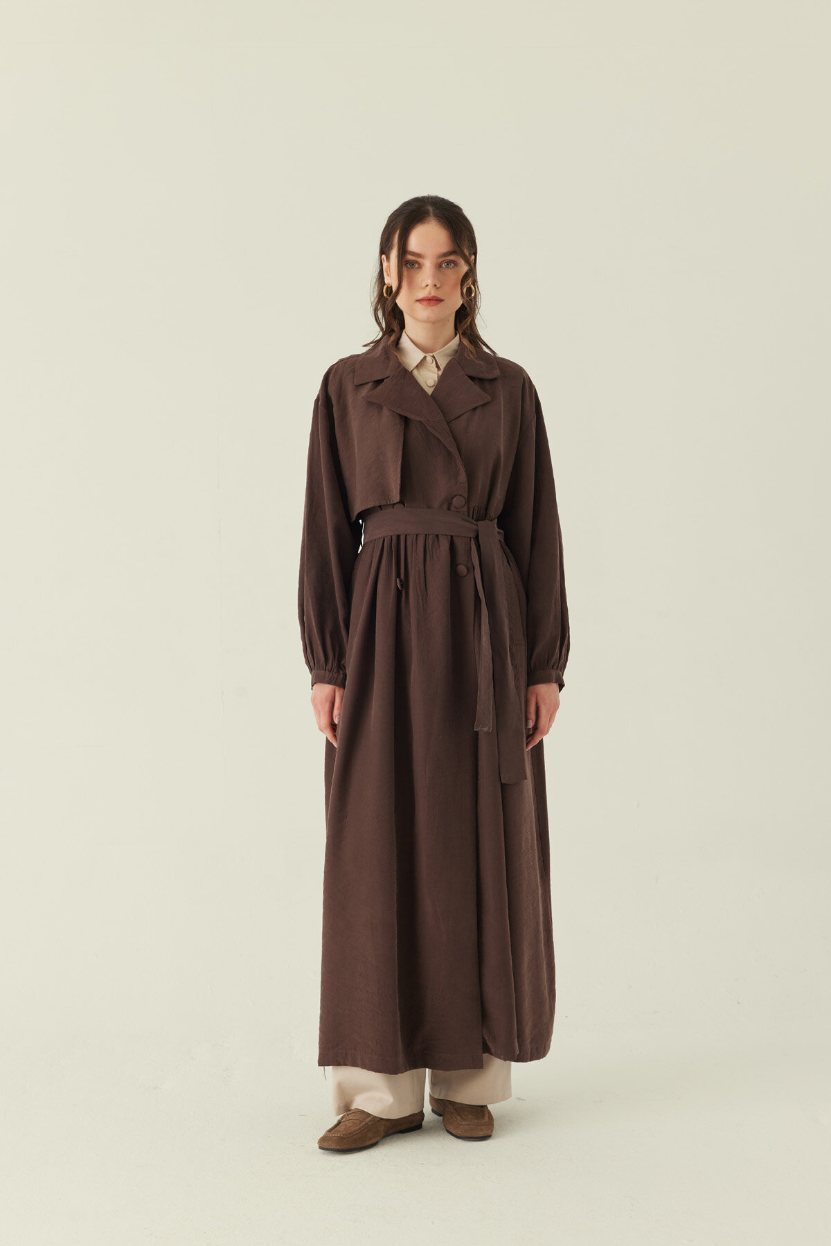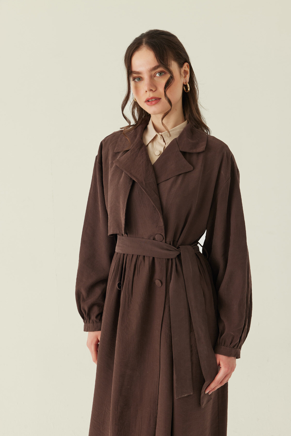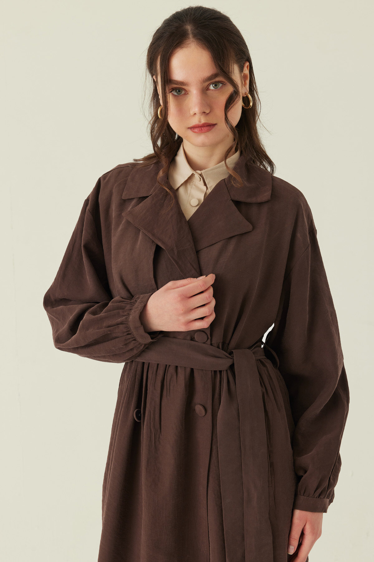 Büzgülü Modal Trençkot Kahverengi