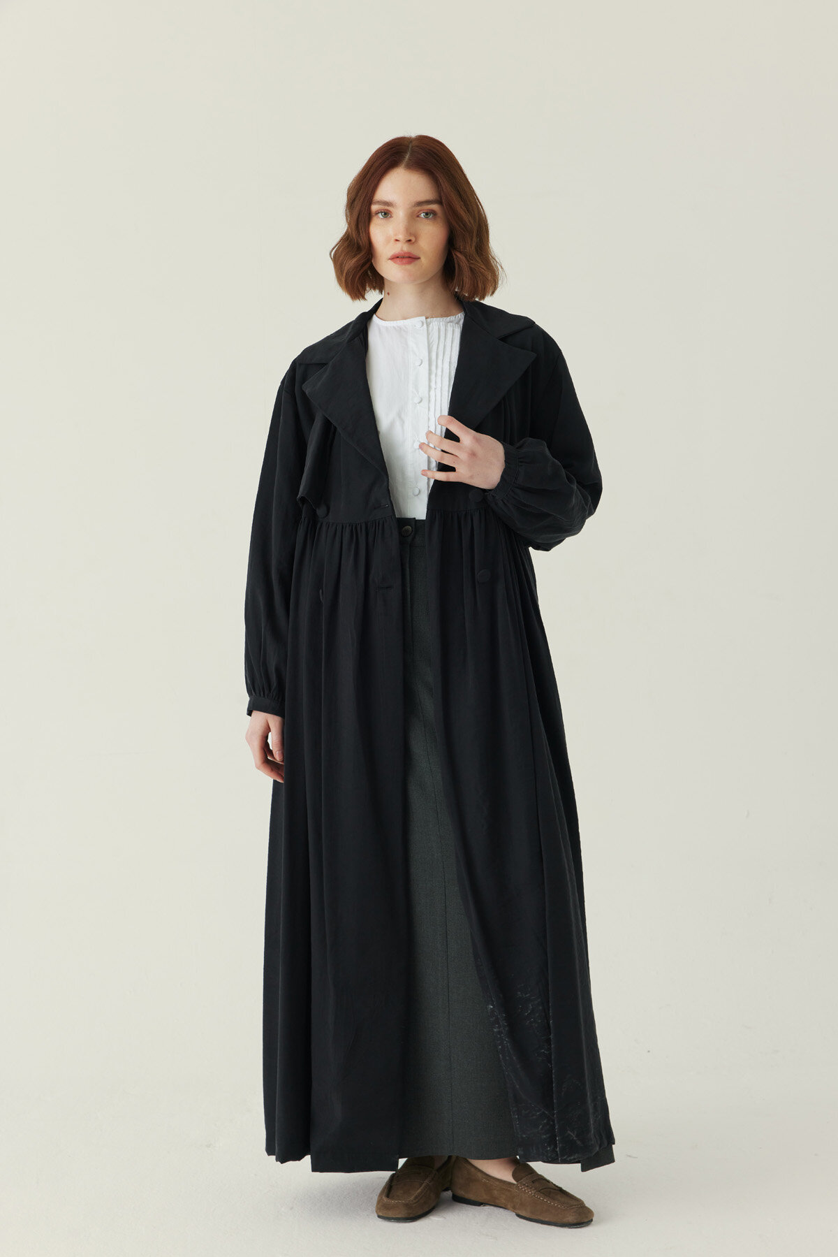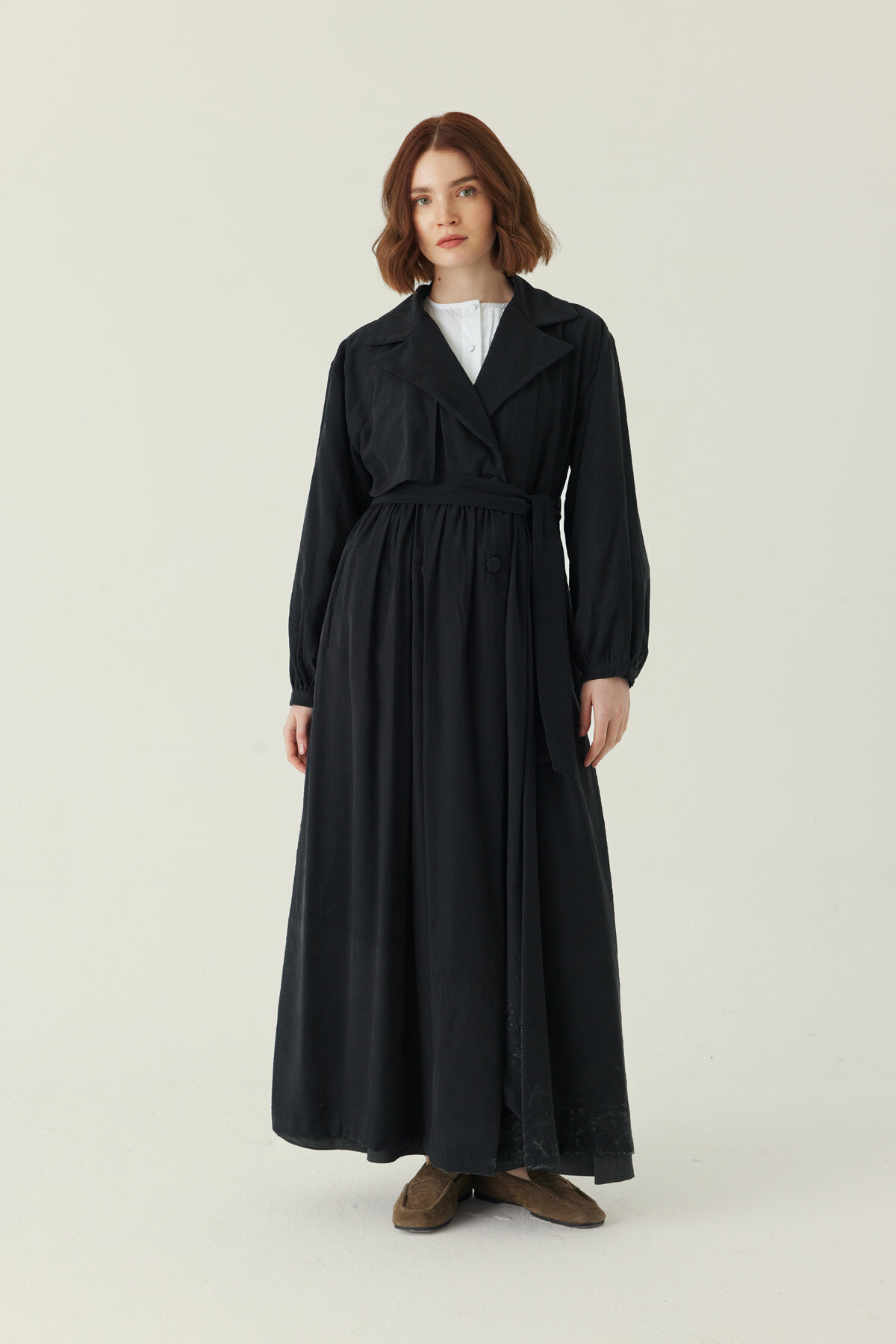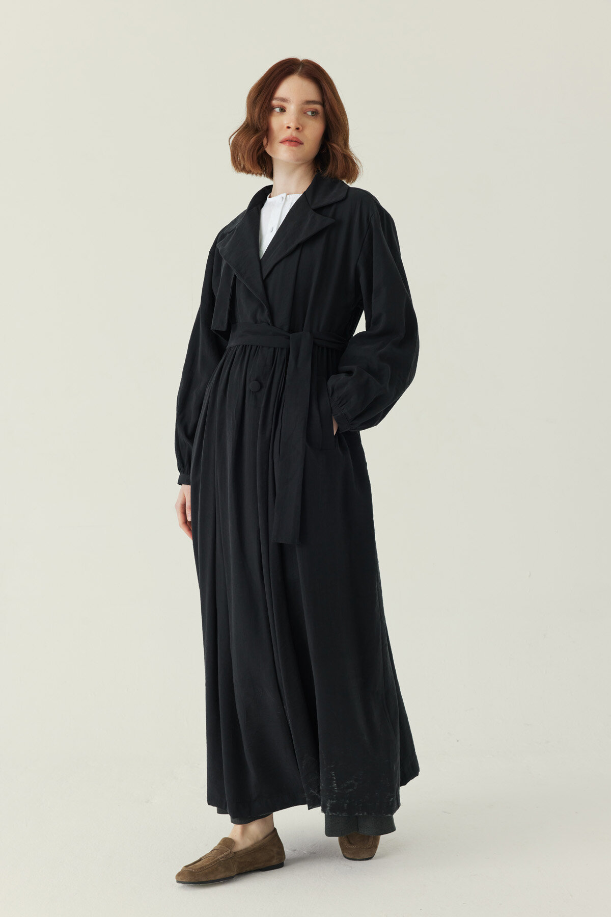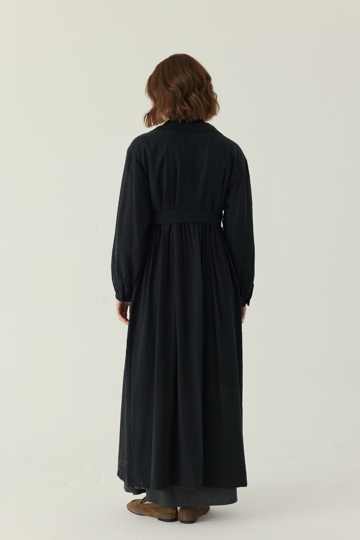Büzgülü Modal Trençkot Siyah
