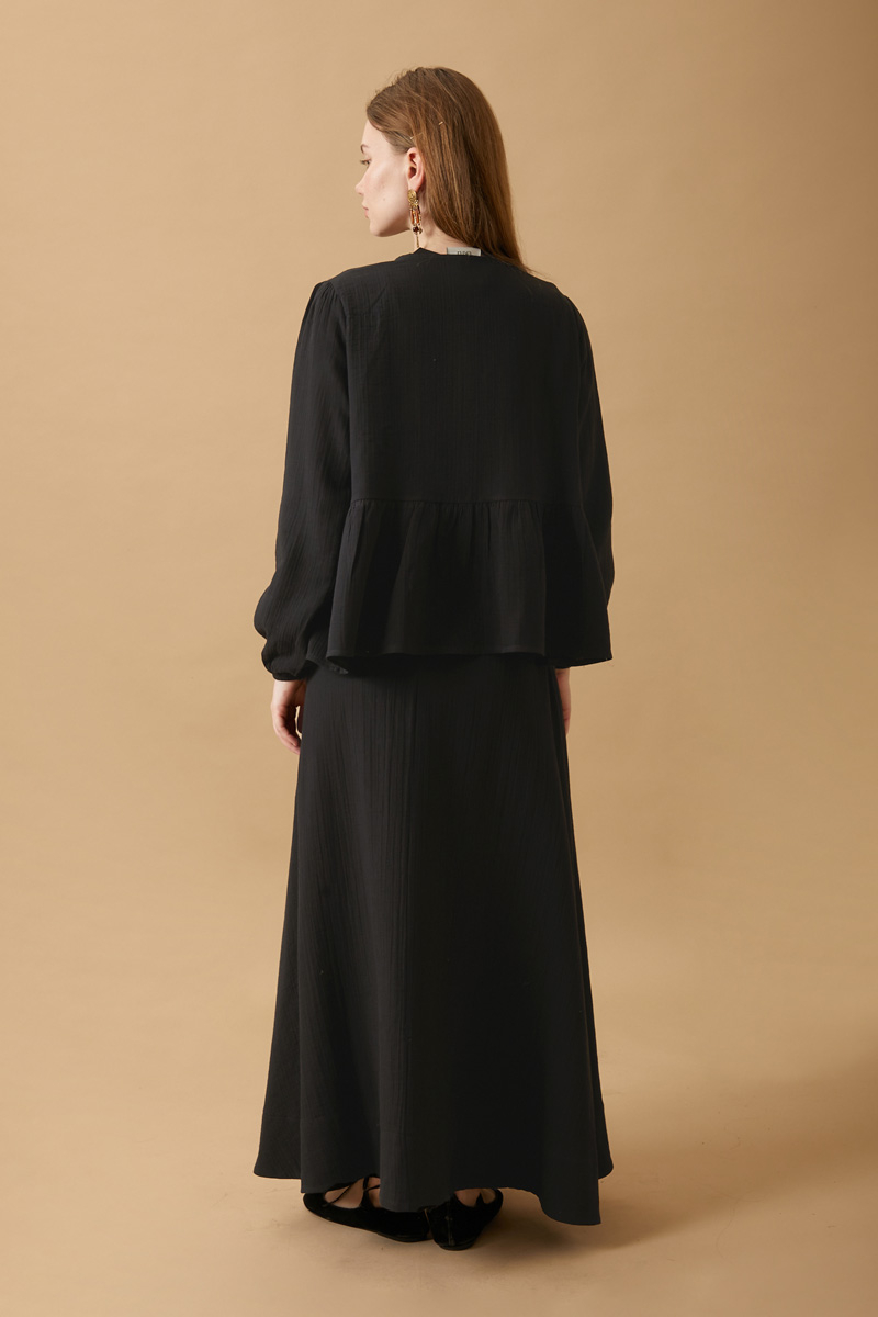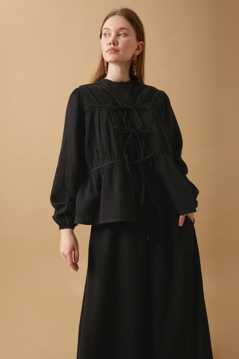 Featuring a kimono-style V-neck, the blouse ties at the front with a ribbon and includes central seam detailing. Shoulders and sleeves have pleated details, with elasticated cuffs. The skirt features an elastic waistband, side pockets, and is fully lined. The skirt hem is finished with a thick cuff. Due to the white color, the fabric is slightly sheer. Suitable for both everyday wear and special occasions.