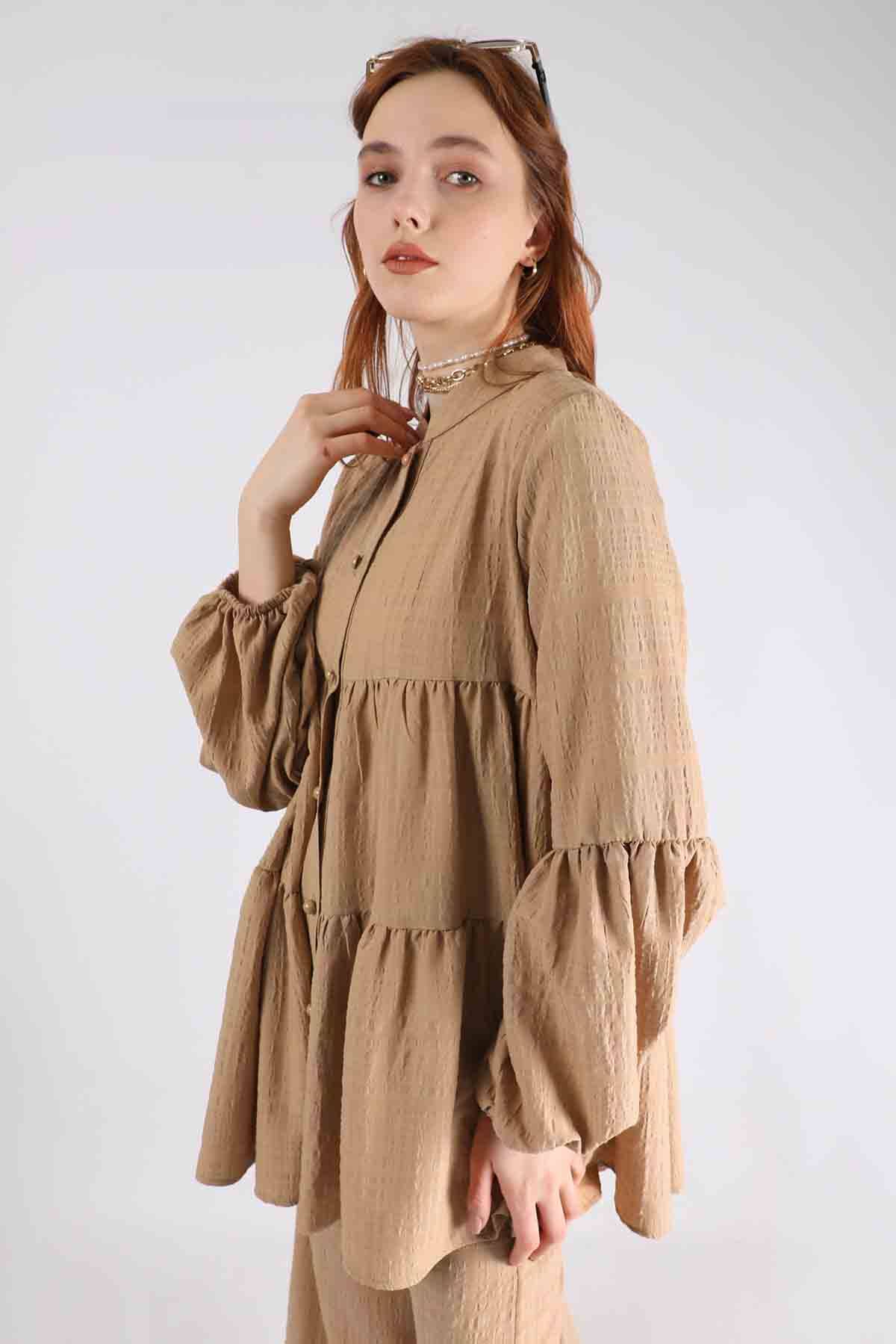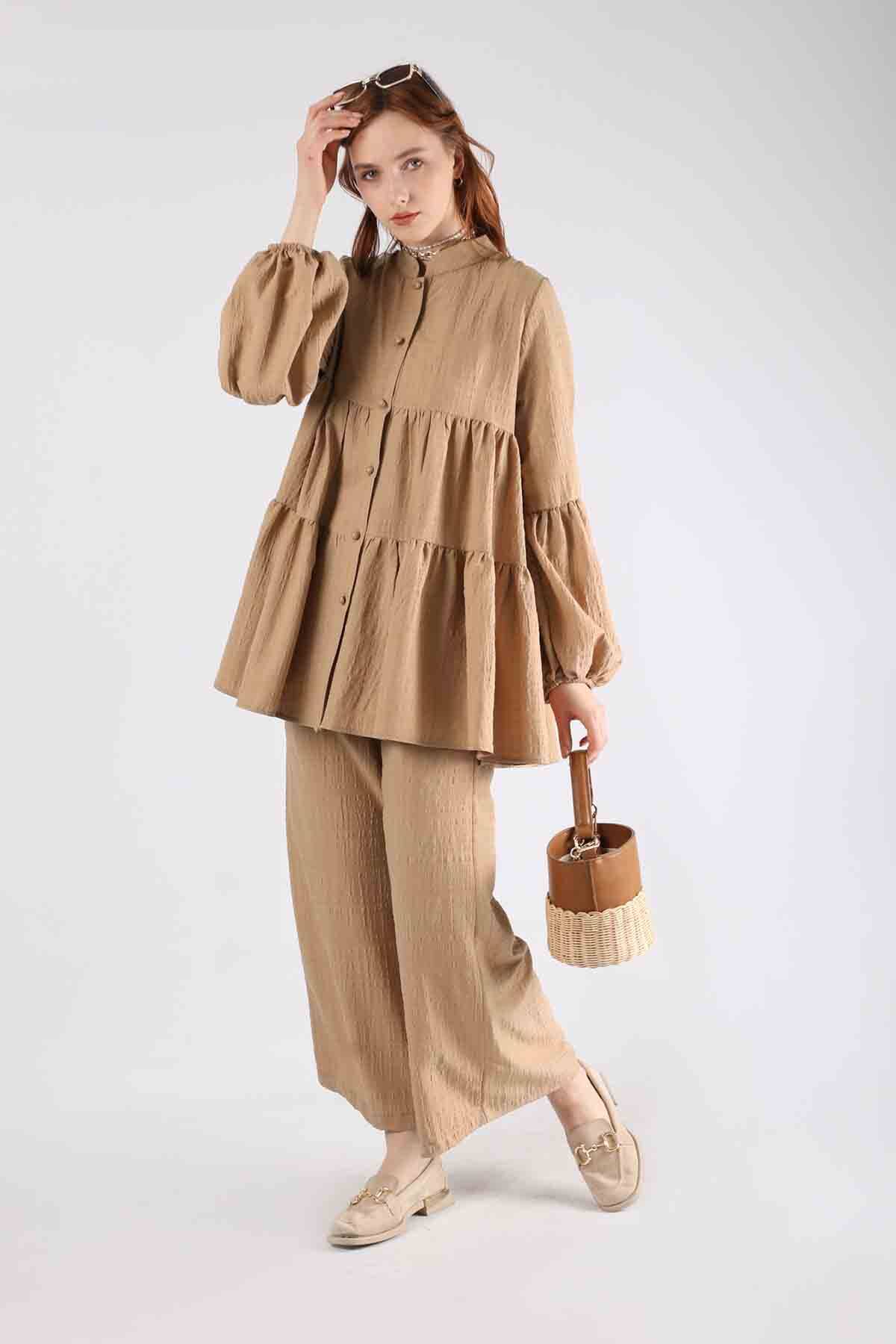 Marul İkili Takım Açık Camel. Pantolon beli lastiklidir ve bol paçadır. Tunik, büzgülü detaylı ve düğmelidir. (düğmeleri aktiftir). Normal kalıptır. Tunik Pantolon ikili takım olarak satılmaktadır. Üretim farkından dolayı desende değişiklik olabilir.