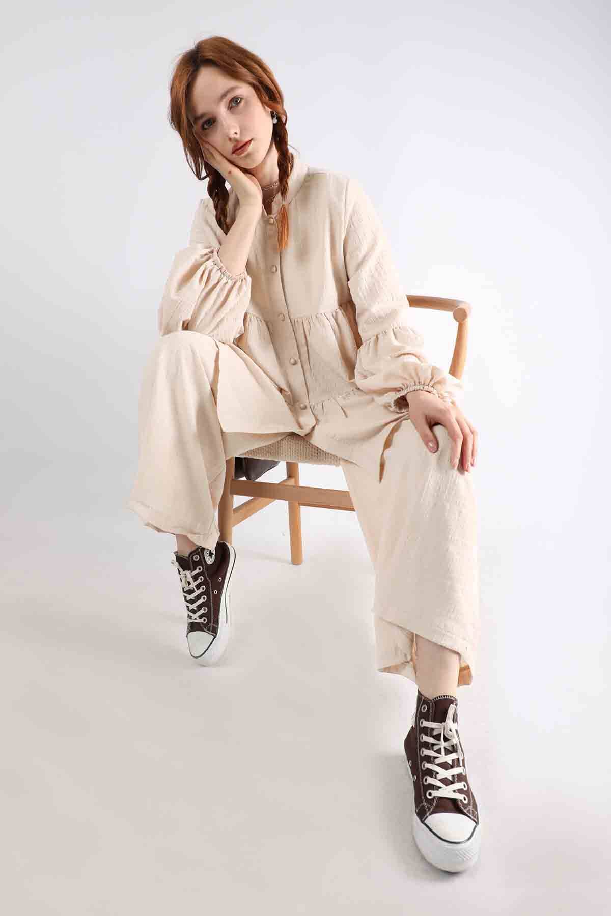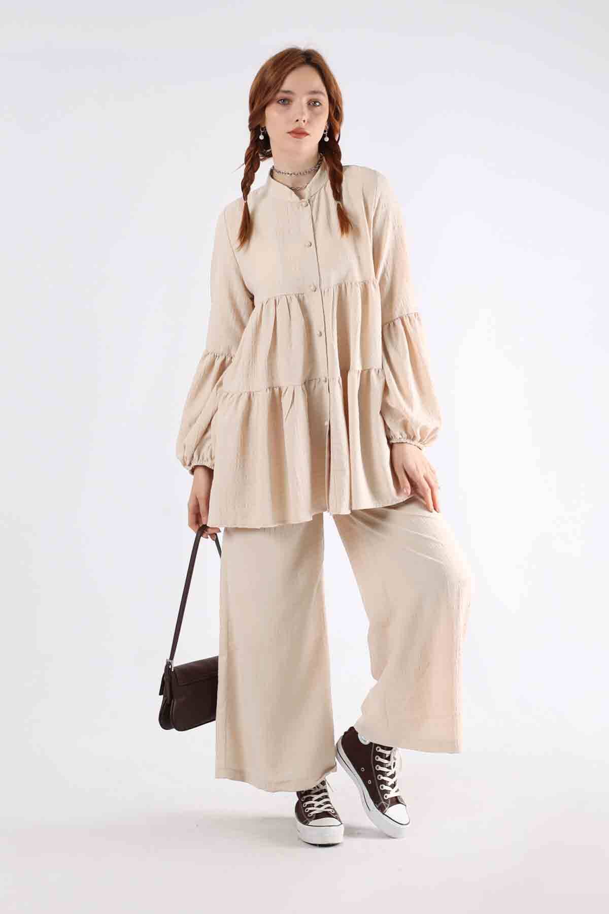 Marul İkili Takım Taş. Pantolon beli lastiklidir ve bol paçadır. Tunik, büzgülü detaylı ve düğmelidir. (düğmeleri aktiftir). Normal kalıptır. Tunik Pantolon ikili takım olarak satılmaktadır. Üretim farkından dolayı desende değişiklik olabilir.