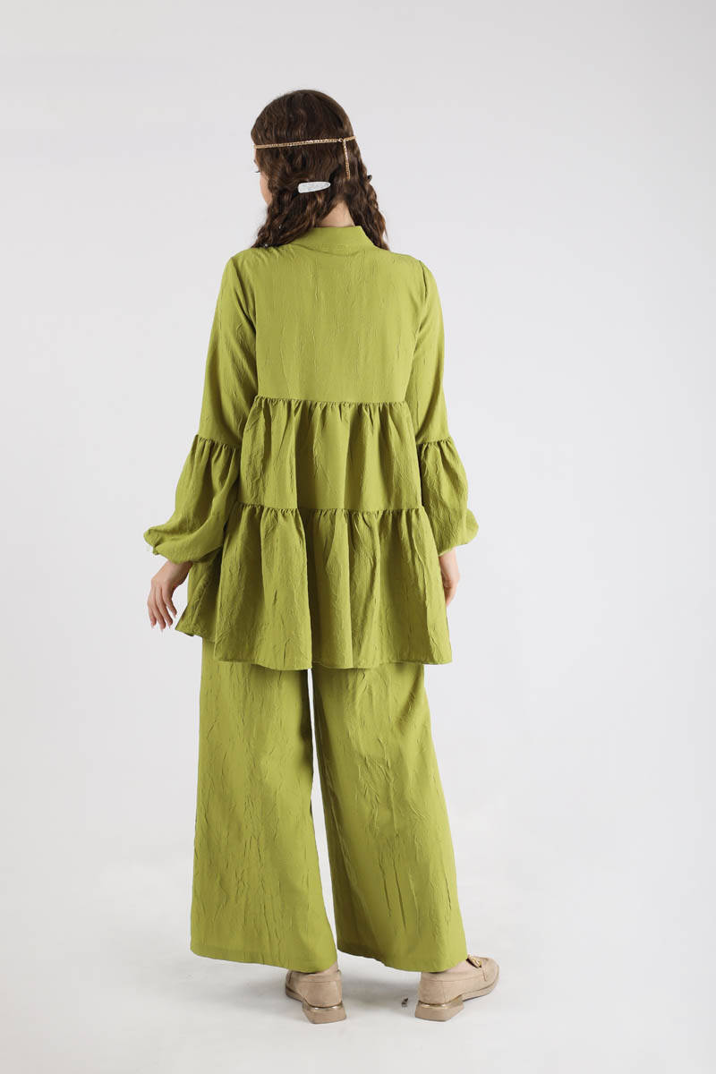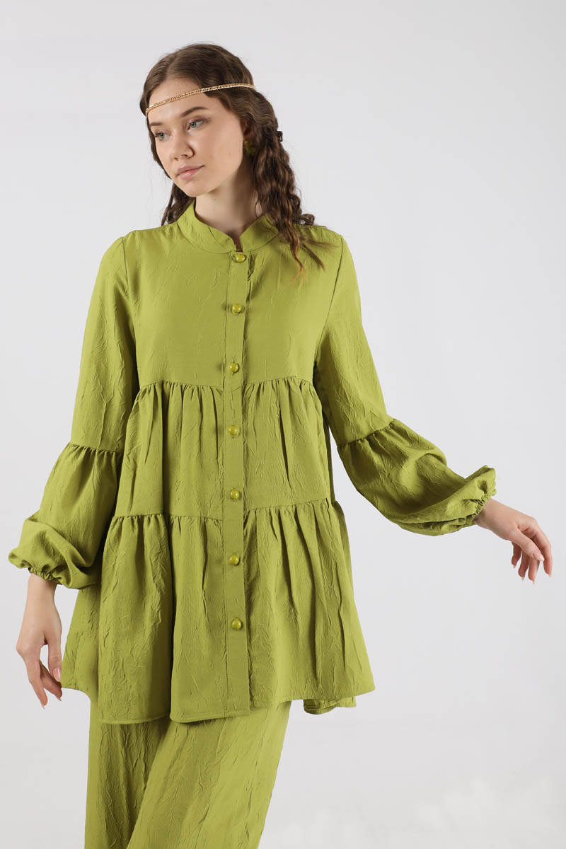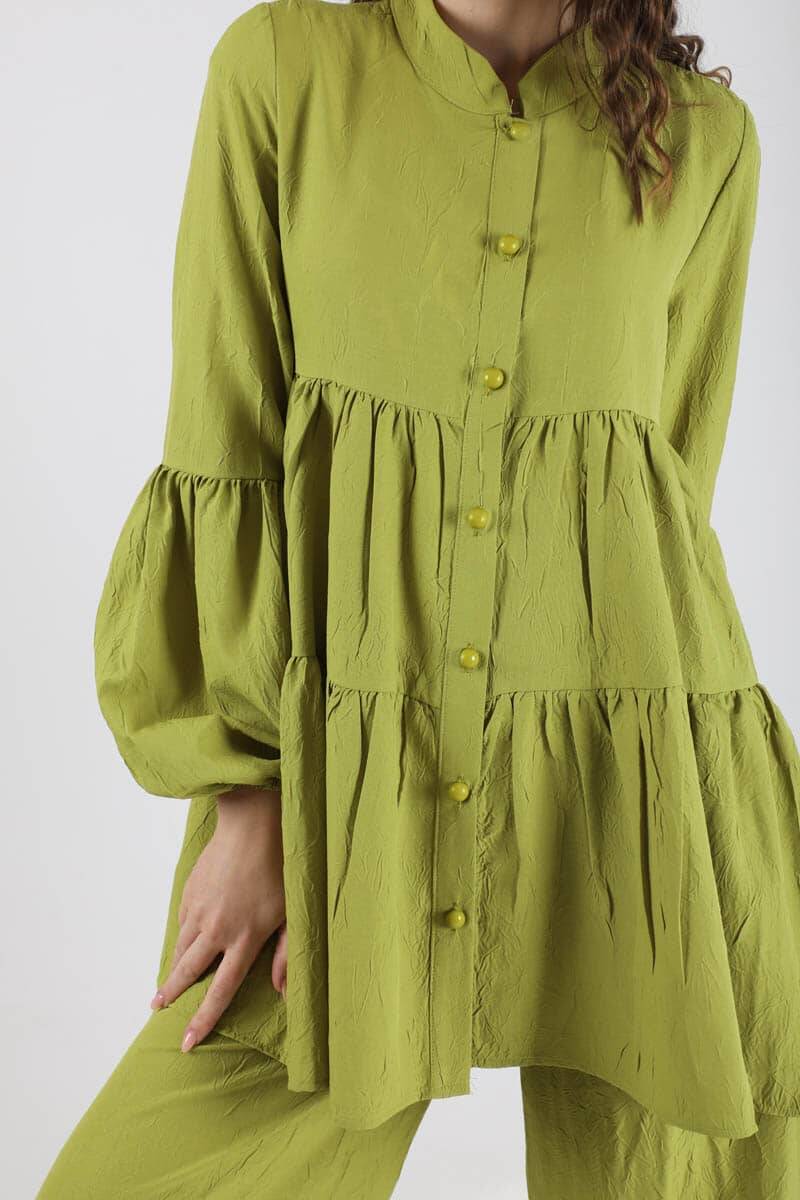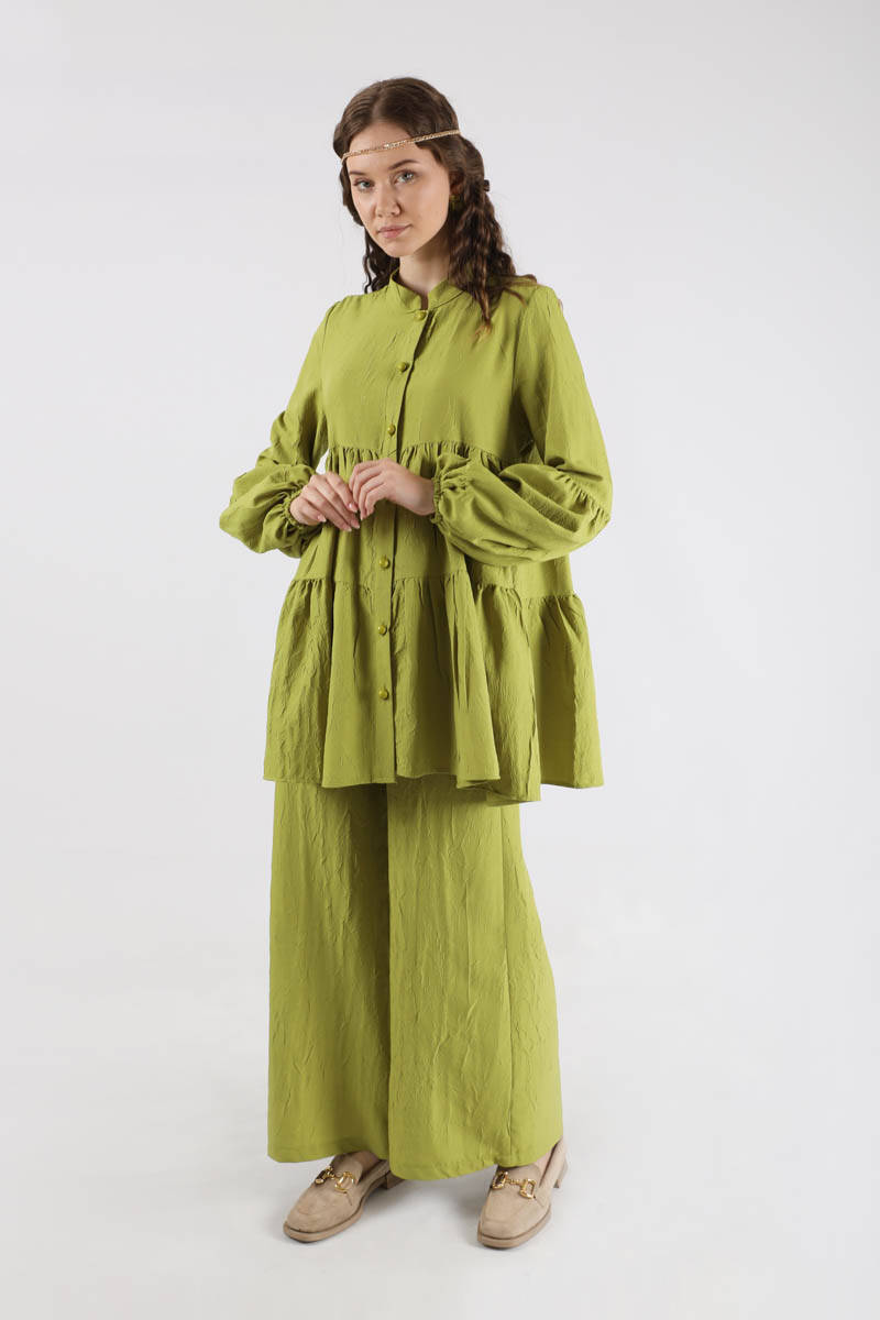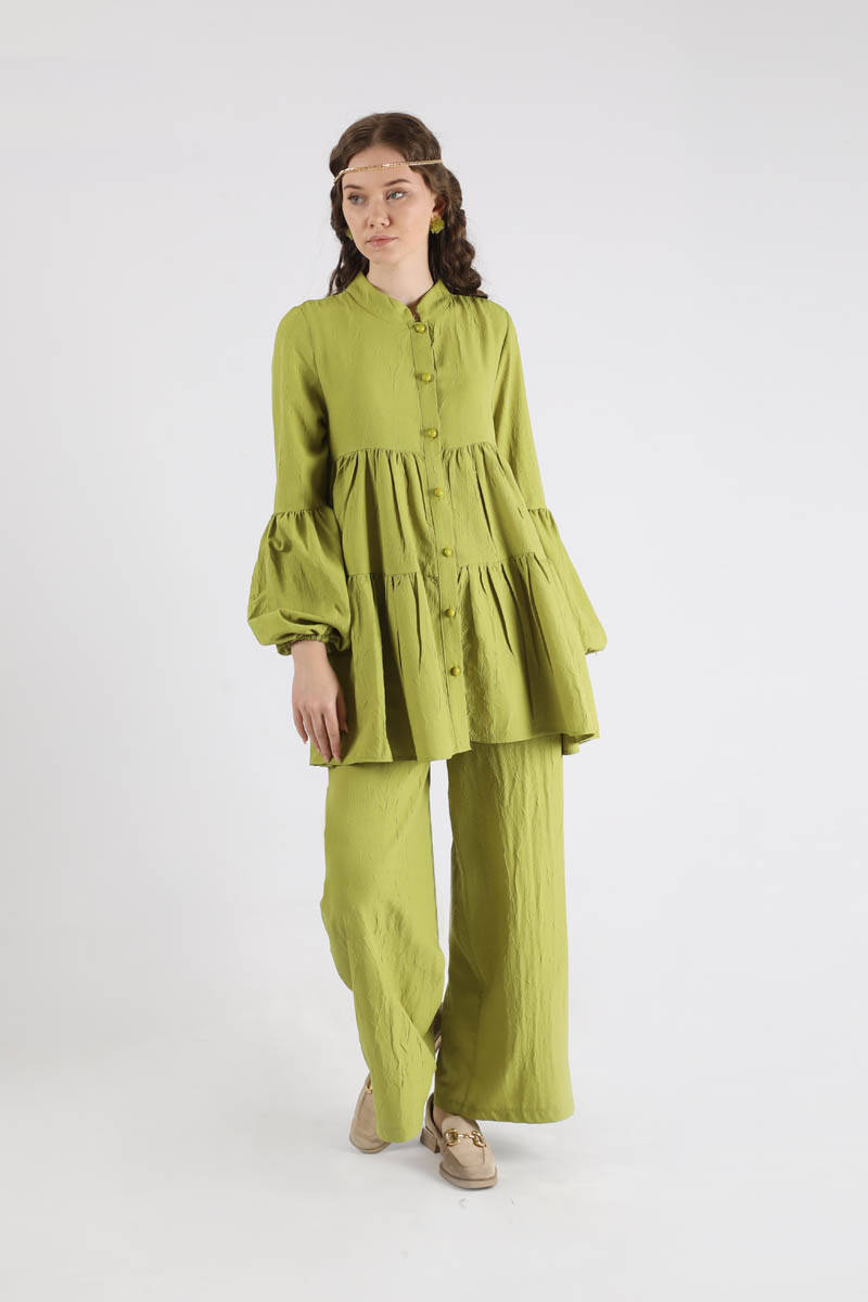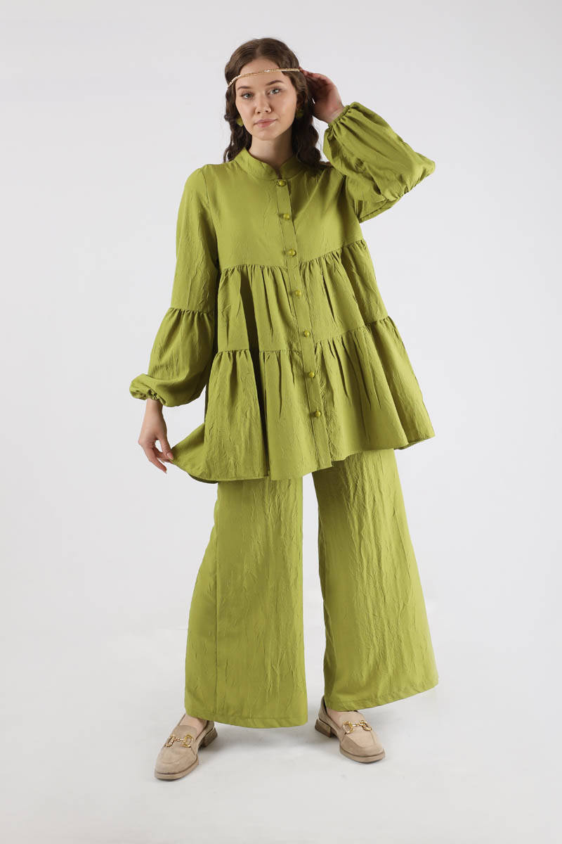 Marul İkili Takım Yağ Yeşili. Pantolon beli lastiklidir ve bol paçadır. Tunik, büzgülü detaylı ve düğmelidir. (düğmeleri aktiftir). Normal kalıptır. Tunik Pantolon ikili takım olarak satılmaktadır. Üretim farkından dolayı desende değişiklik olabilir.