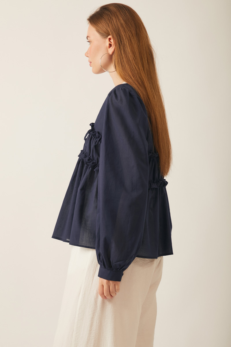 Büzgülü Vual Bluz Lacivert, V yakası, dekolteye zarif bir dokunuş katarken, büzgülü ve fırfır detaylı göğüs ve bel kısmı bluza hareketli ve feminen bir hava katıyor. Uzun kolu ve ayarlanabilir bağcık detayları ile hem şık hem de pratik bir seçenektir.