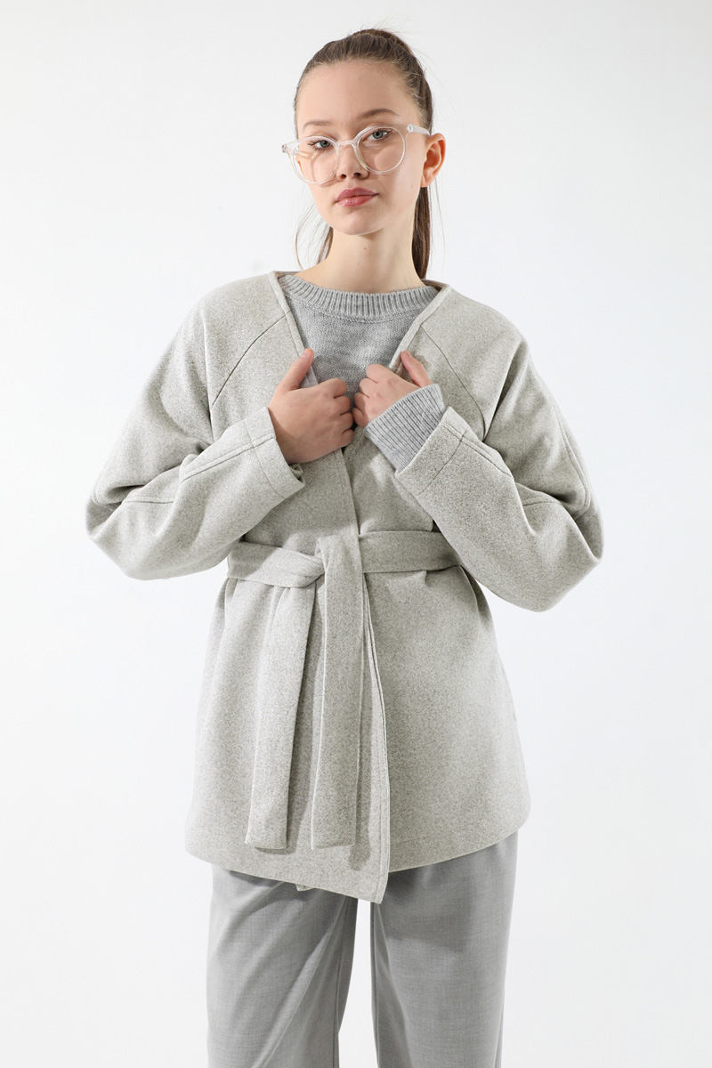 Cachet Short Jacket Grey. No button. Portable belt. Side pockets. Lined.