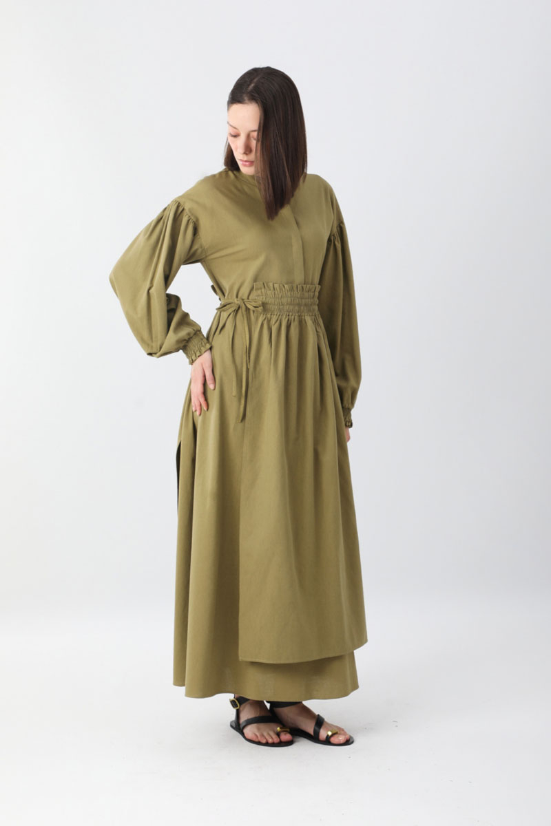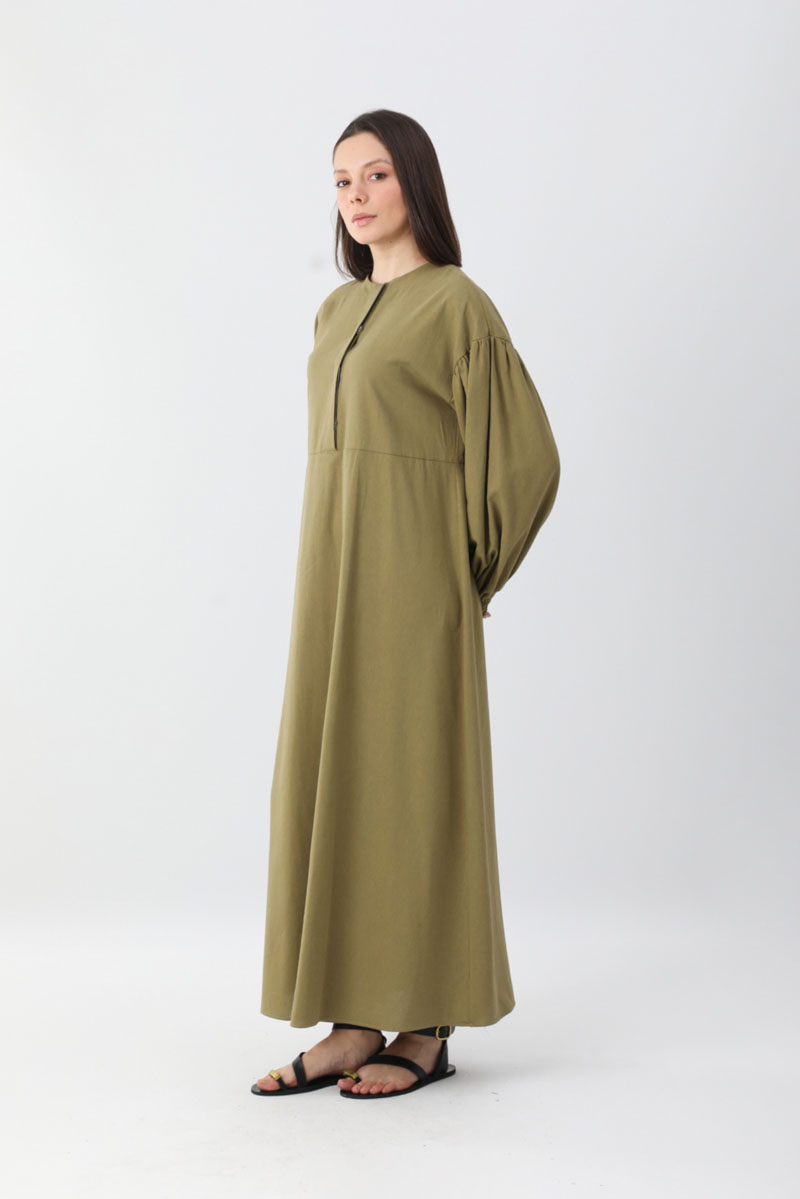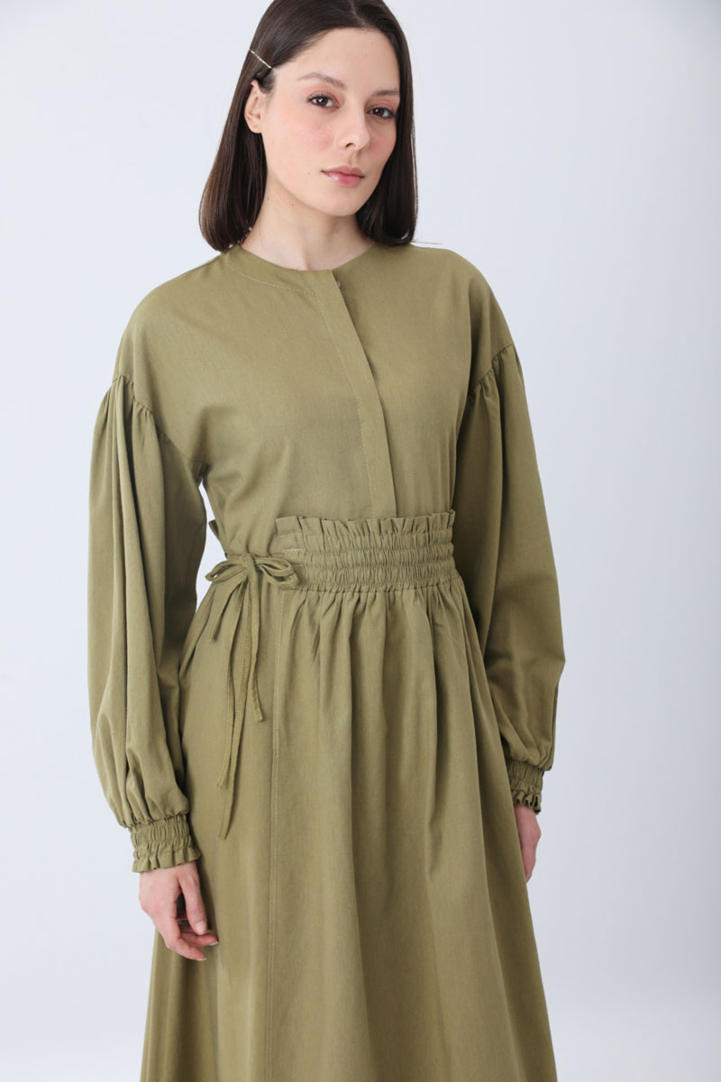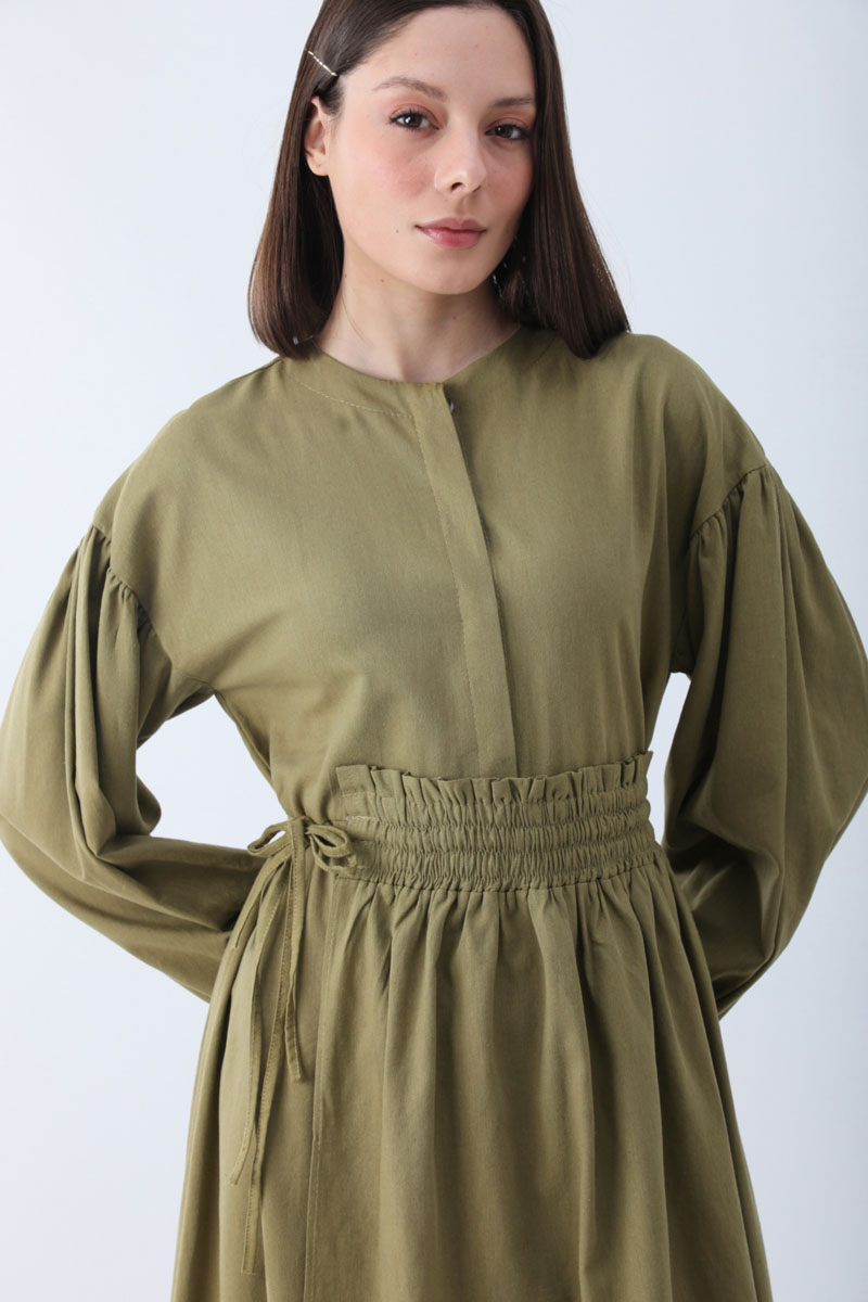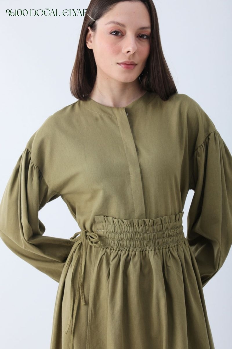 Çağıl Elbise Haki. Bisiklet yakadır, önden düğmelidir, düşük omuzludur, büzgülü balon kolludur, üst etek parçası büzgü tünel detaylı bağlamalıdır, astarsızdır, Günlük kullanım için uygundur.
