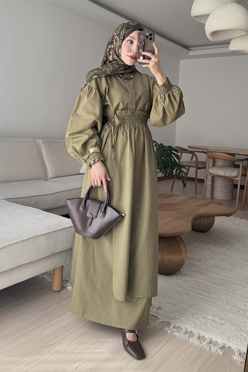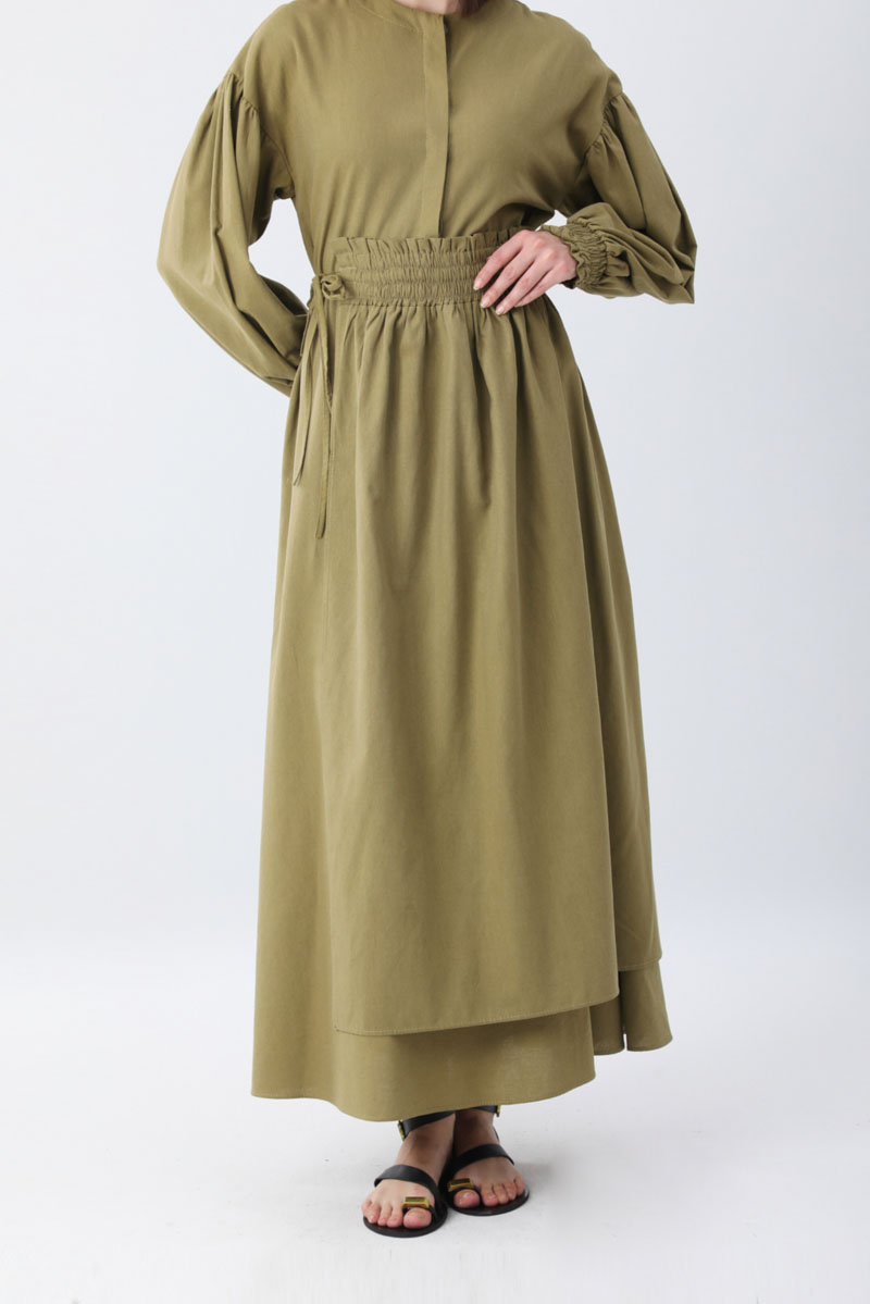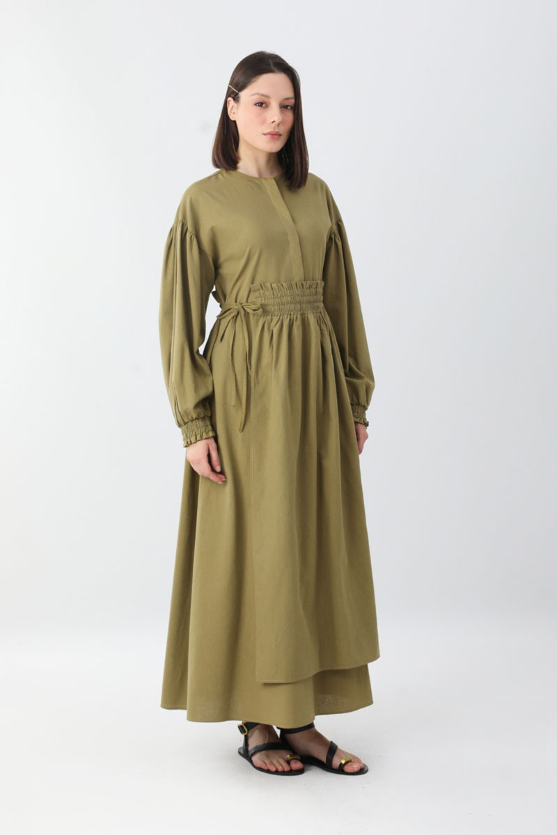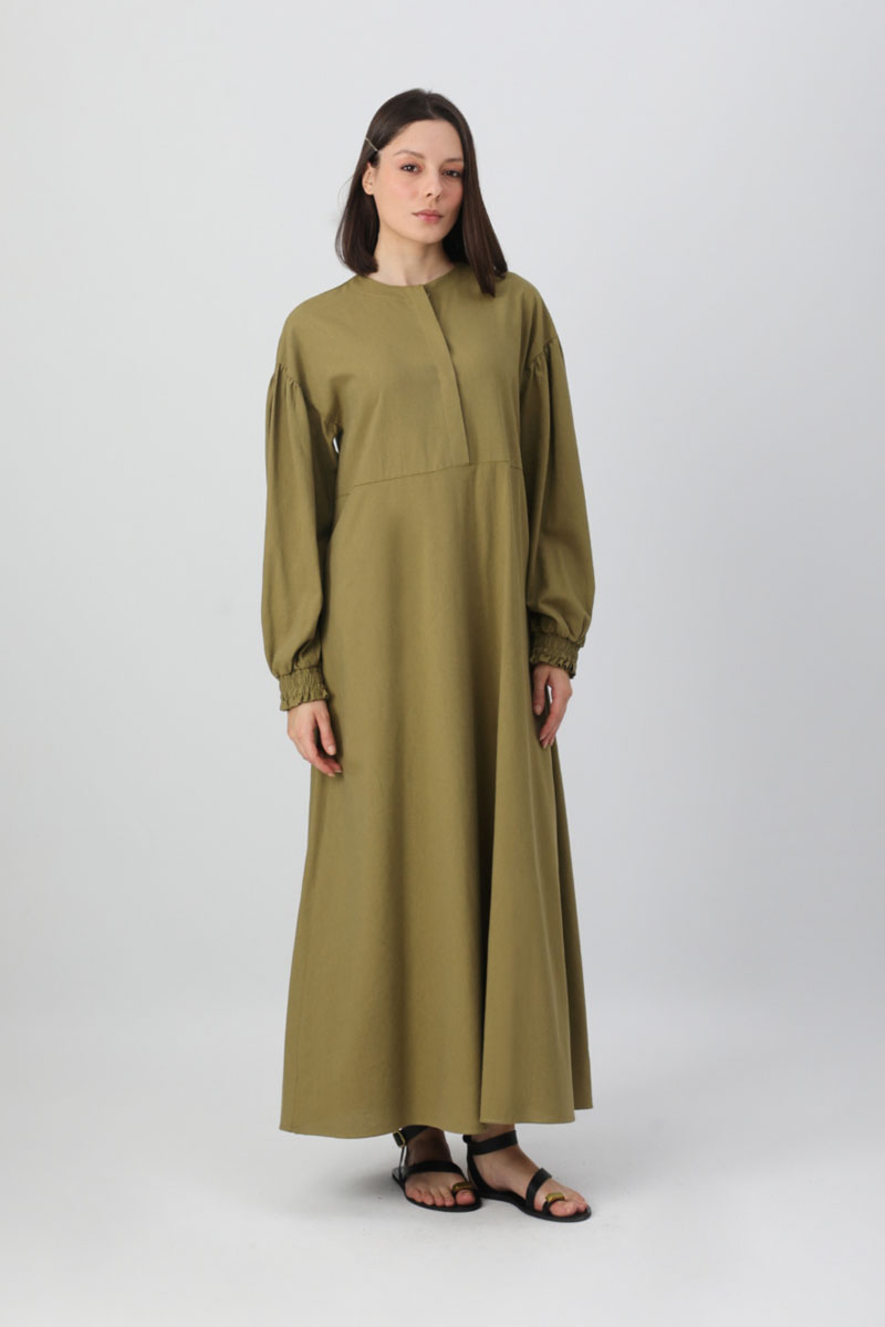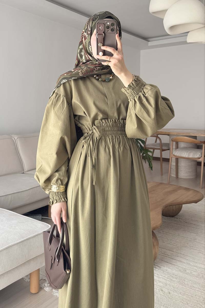 Çağıl Elbise Haki. Bisiklet yakadır, önden düğmelidir, düşük omuzludur, büzgülü balon kolludur, üst etek parçası büzgü tünel detaylı bağlamalıdır, astarsızdır, Günlük kullanım için uygundur.
