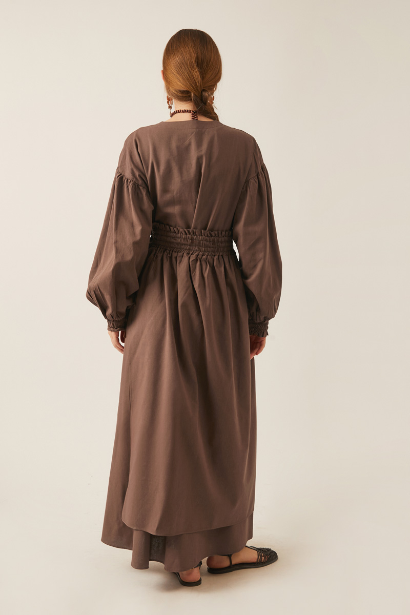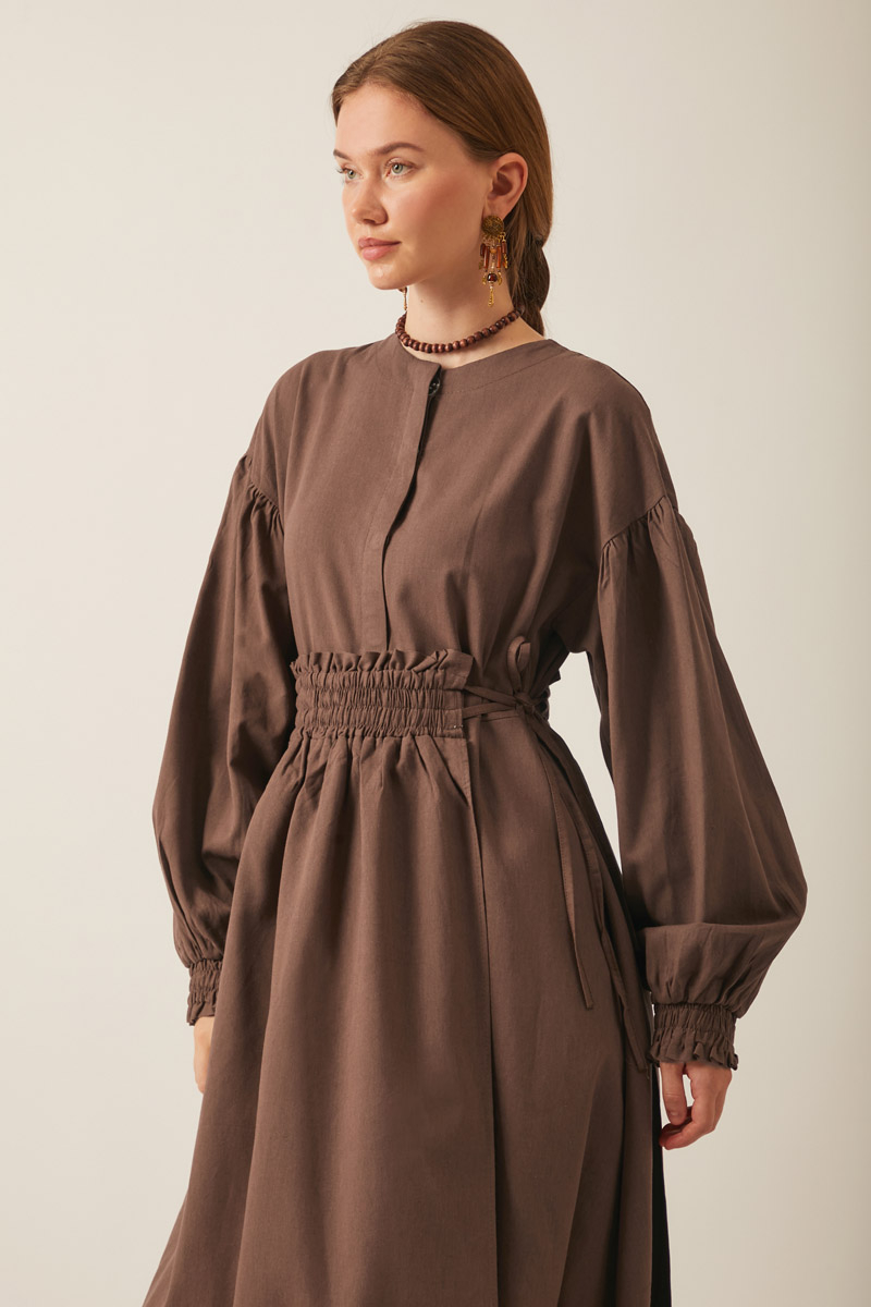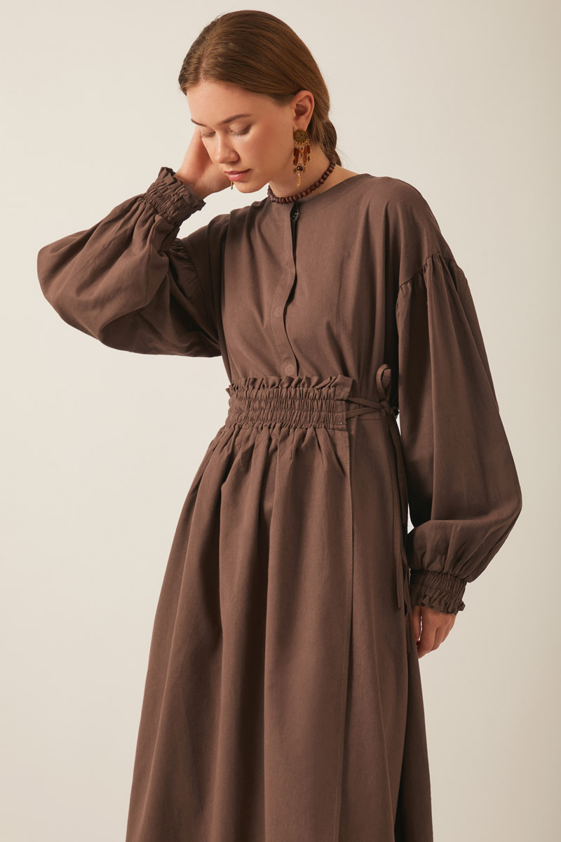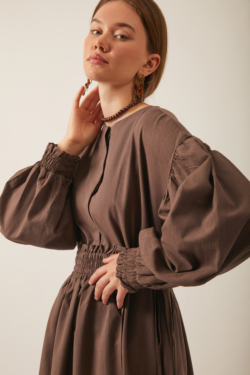 Çağıl Elbise Kahverengi. Bisiklet yakadır, önden düğmelidir, düşük omuzludur, büzgülü balon kolludur, üst etek parçası büzgü tünel detaylı bağlamalıdır, astarsızdır, Günlük kullanım için uygundur.
