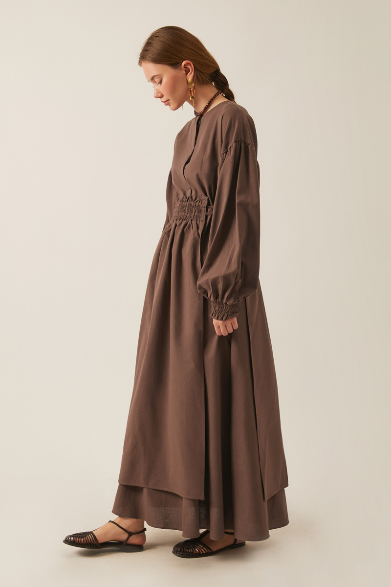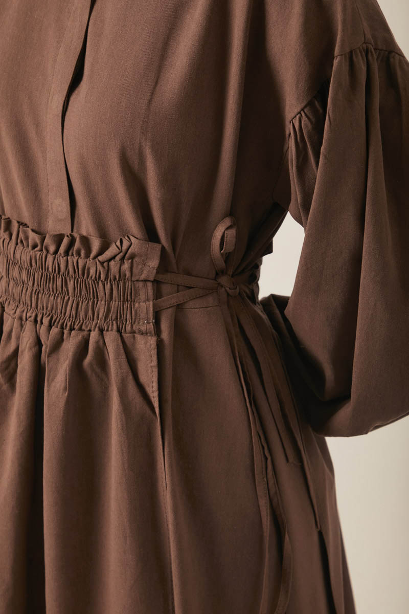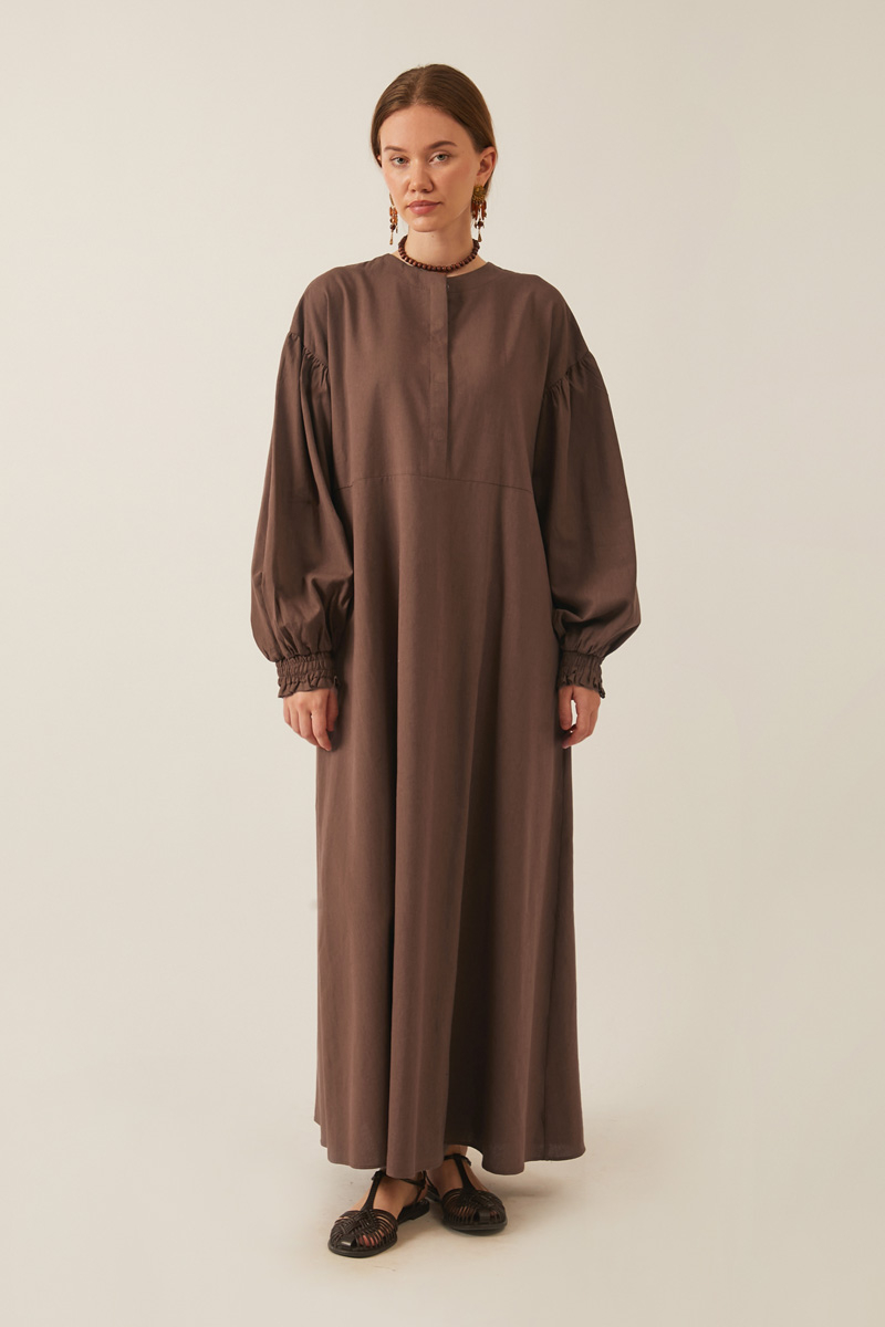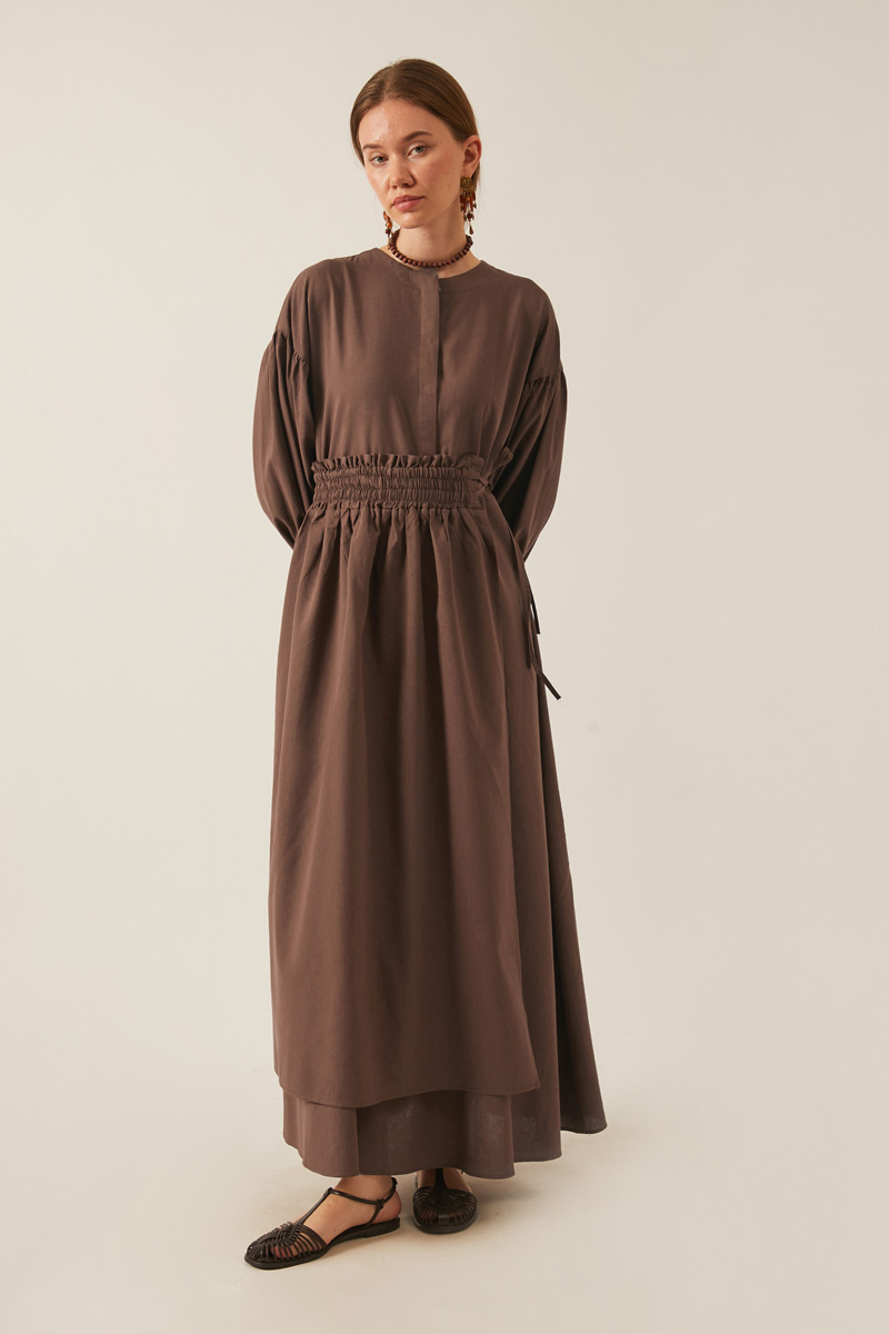 Çağıl Elbise Kahverengi. Bisiklet yakadır, önden düğmelidir, düşük omuzludur, büzgülü balon kolludur, üst etek parçası büzgü tünel detaylı bağlamalıdır, astarsızdır, Günlük kullanım için uygundur.