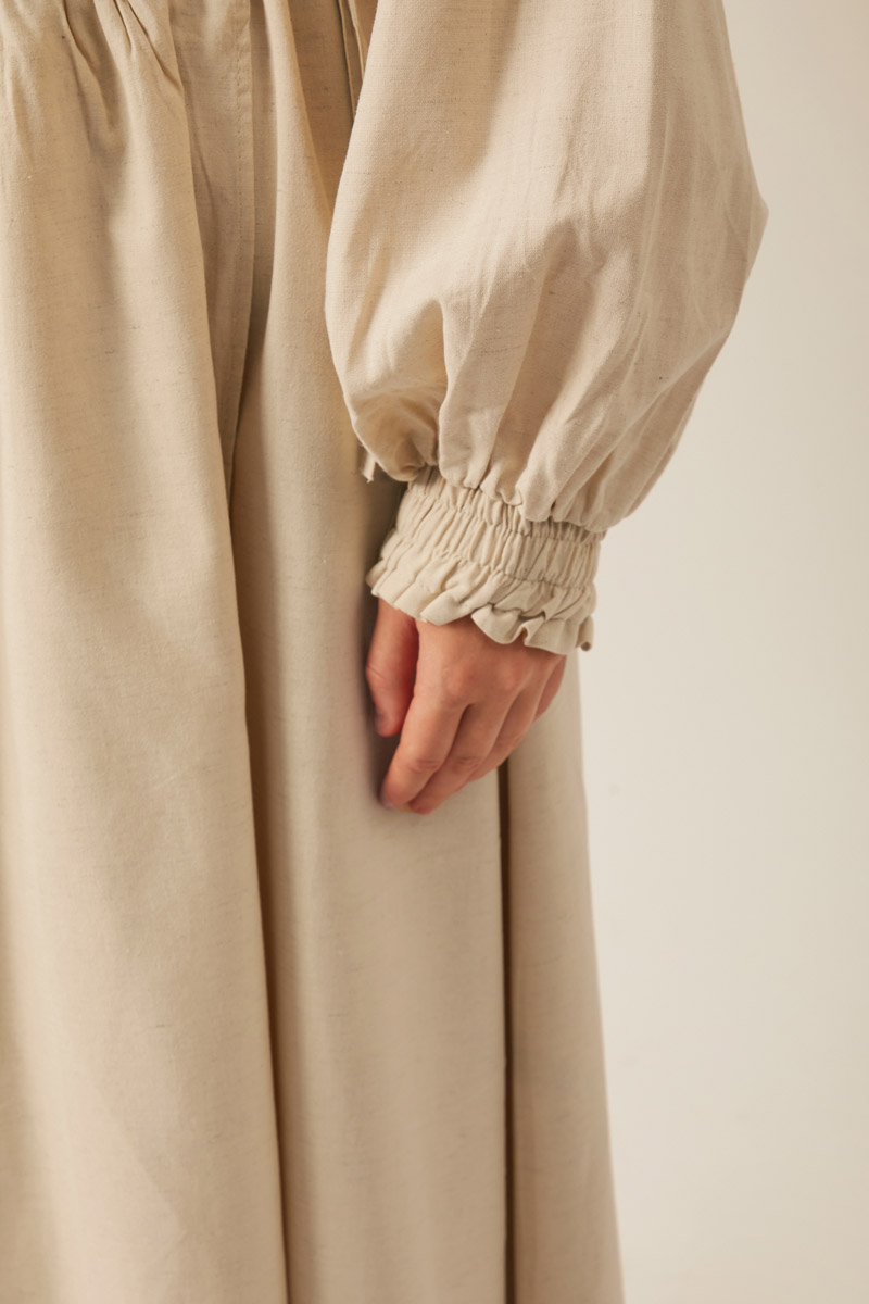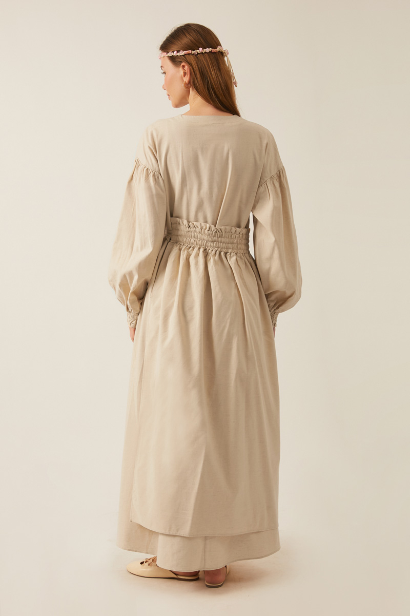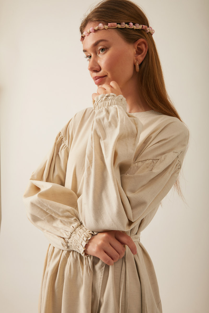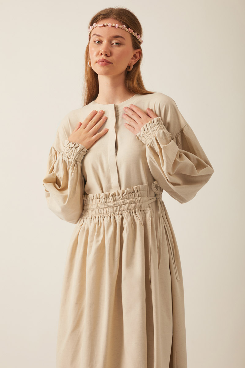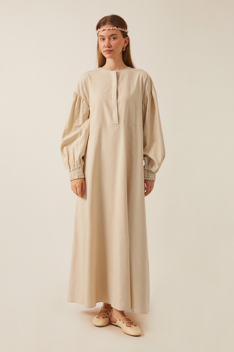 Çağıl Elbise Taş. Bisiklet yakadır, önden düğmelidir, düşük omuzludur, büzgülü balon kolludur, üst etek parçası büzgü tünel detaylı bağlamalıdır, astarsızdır, Günlük kullanım için uygundur.