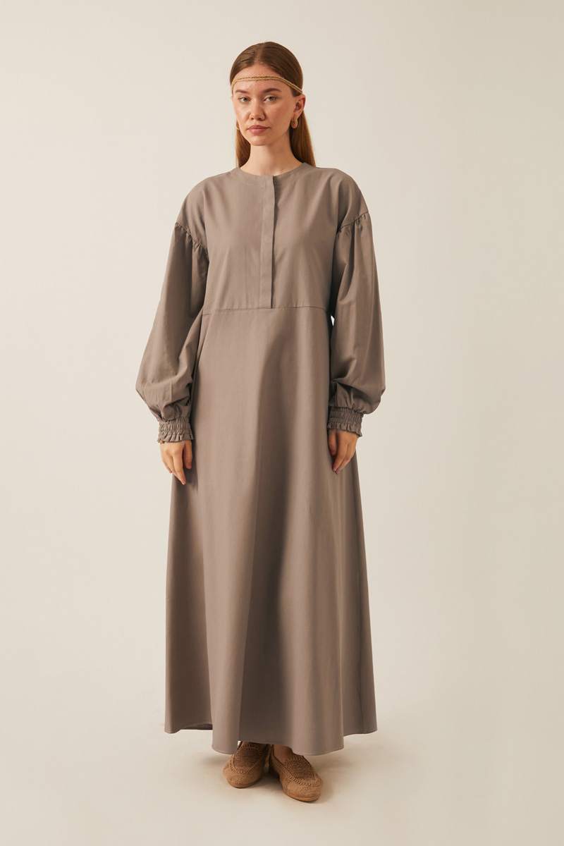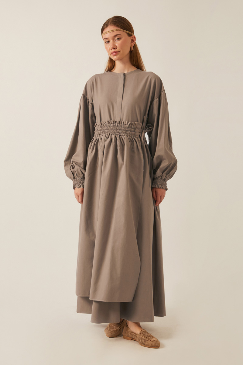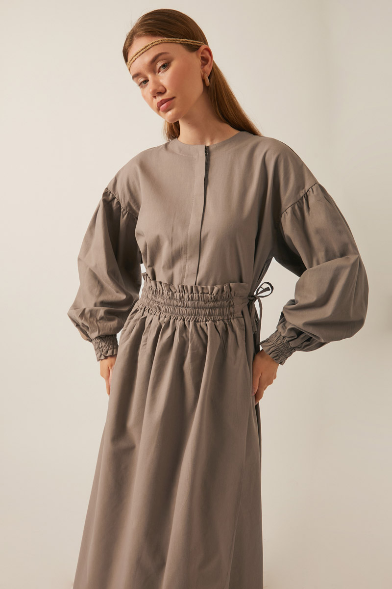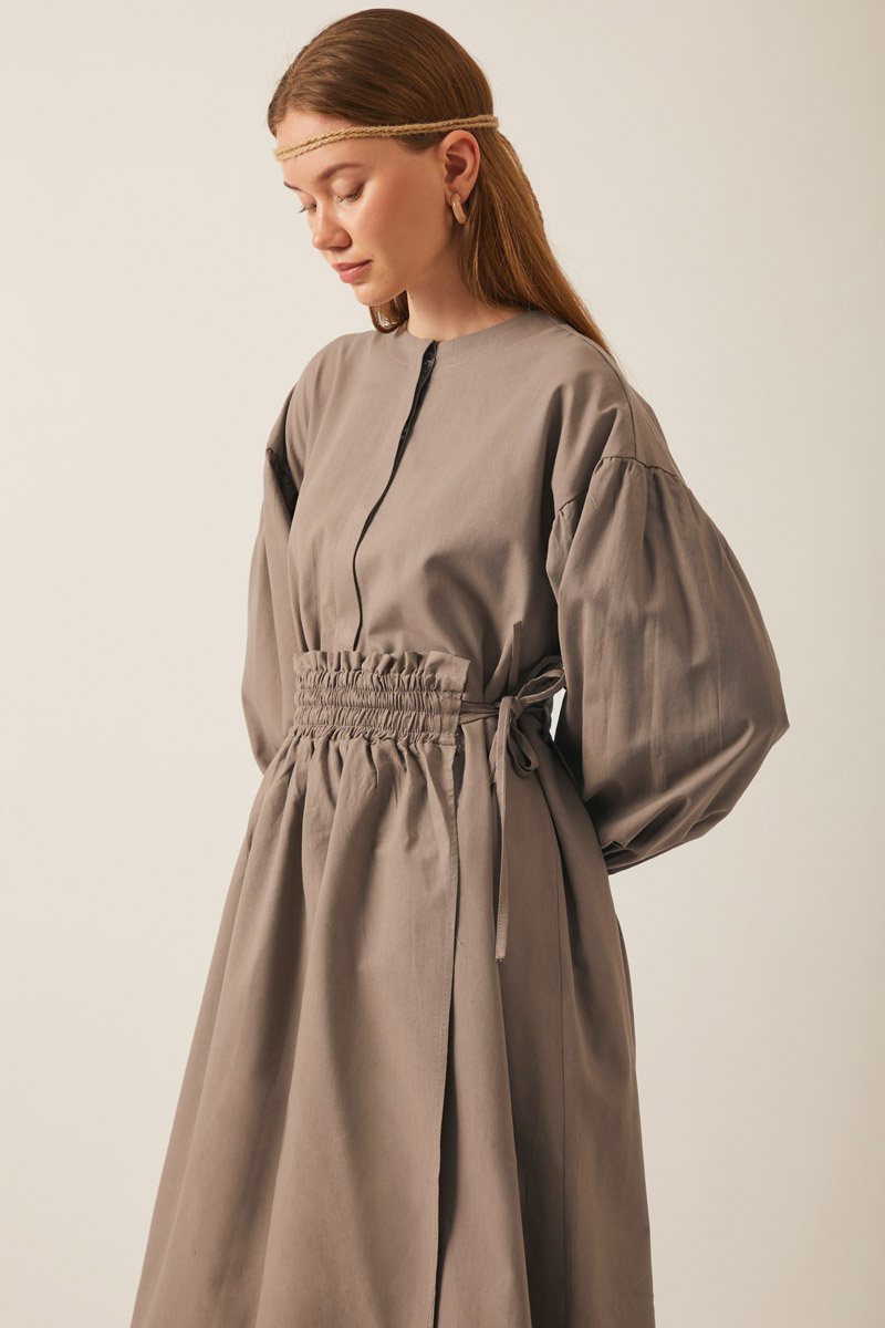 Çağıl Elbise Vizon. Bisiklet yakadır, önden düğmelidir, düşük omuzludur, büzgülü balon kolludur, üst etek parçası büzgü tünel detaylı bağlamalıdır, astarsızdır, Günlük kullanım için uygundur.