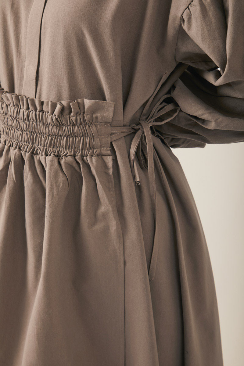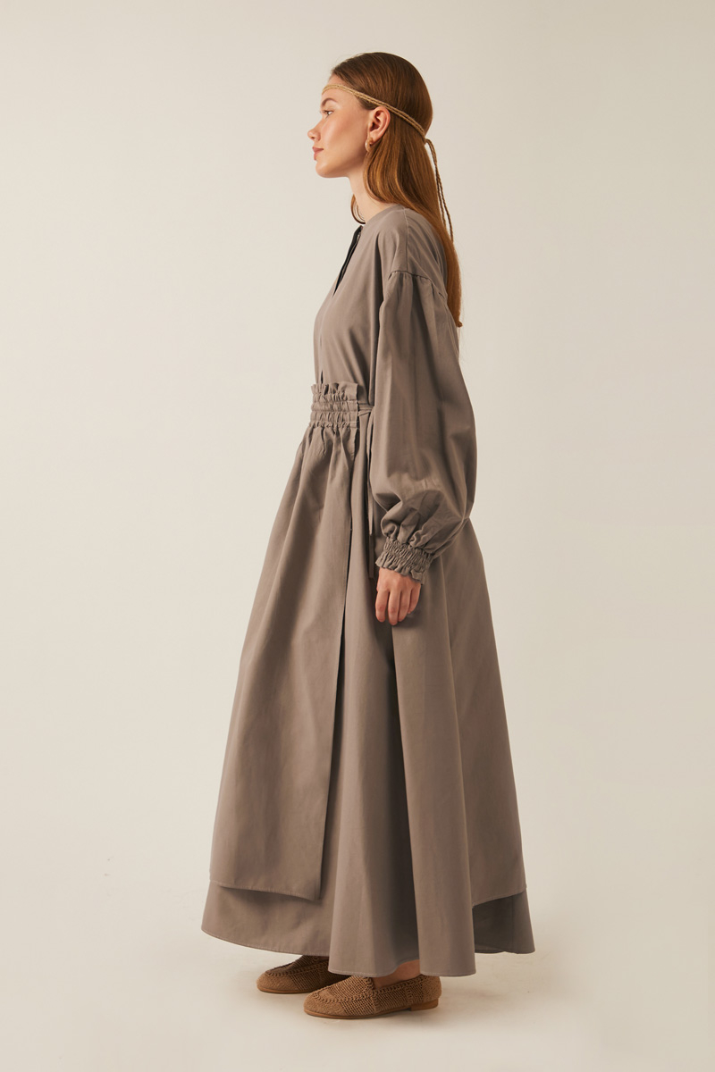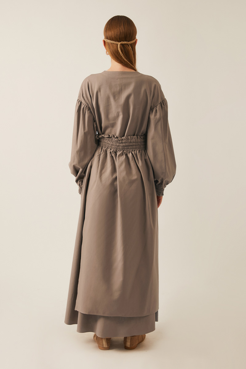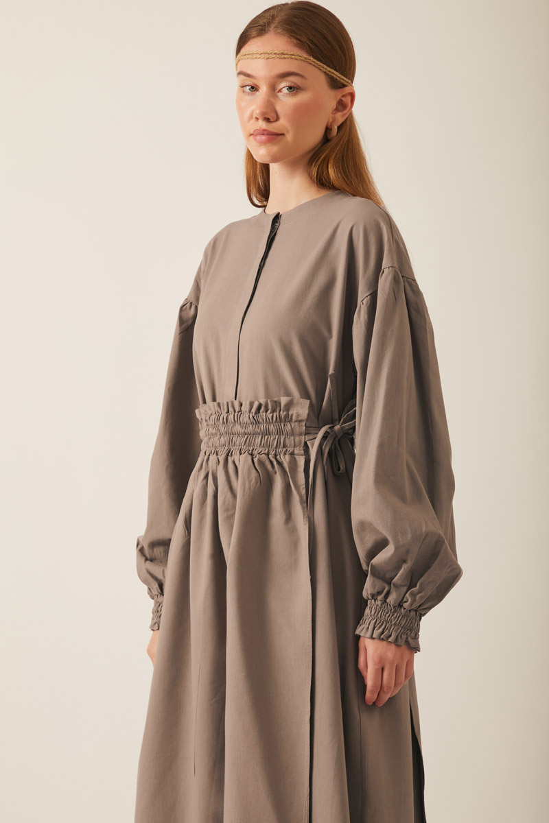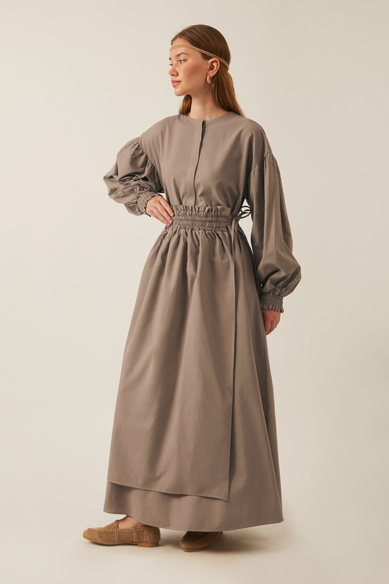Çağıl Elbise Vizon. Bisiklet yakadır, önden düğmelidir, düşük omuzludur, büzgülü balon kolludur, üst etek parçası büzgü tünel detaylı bağlamalıdır, astarsızdır, Günlük kullanım için uygundur.