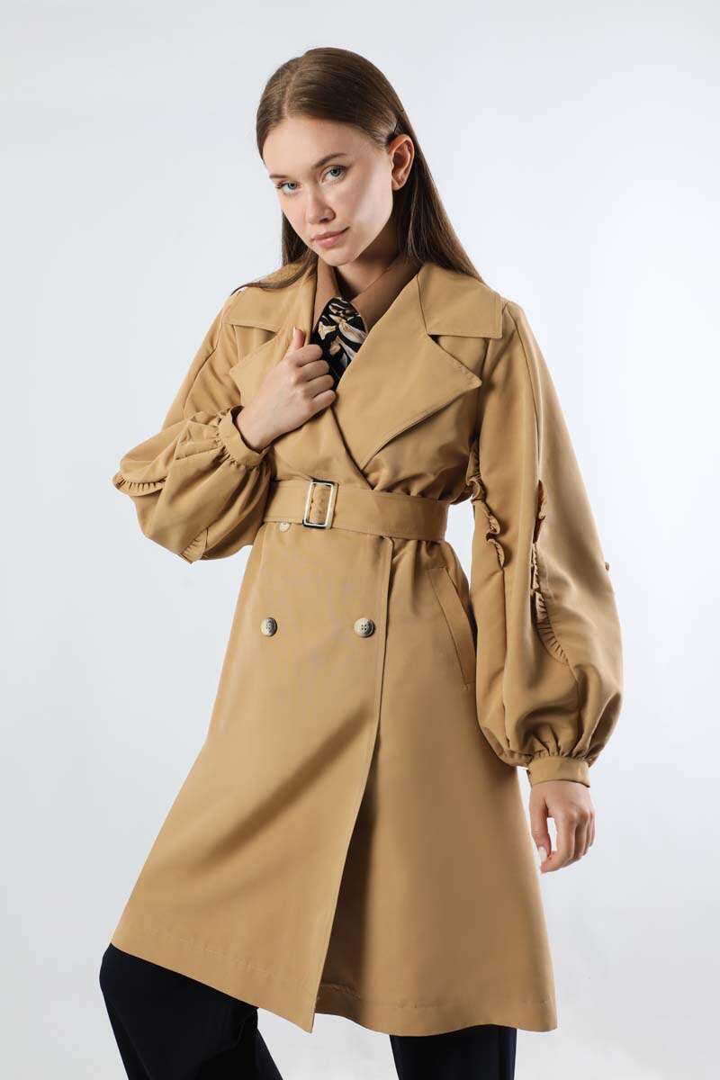 Trench Camel With Frilled Sleeves. Wide English collar. It is lined. It has two side pockets. It is a double-breasted closure. Travel belt is available.