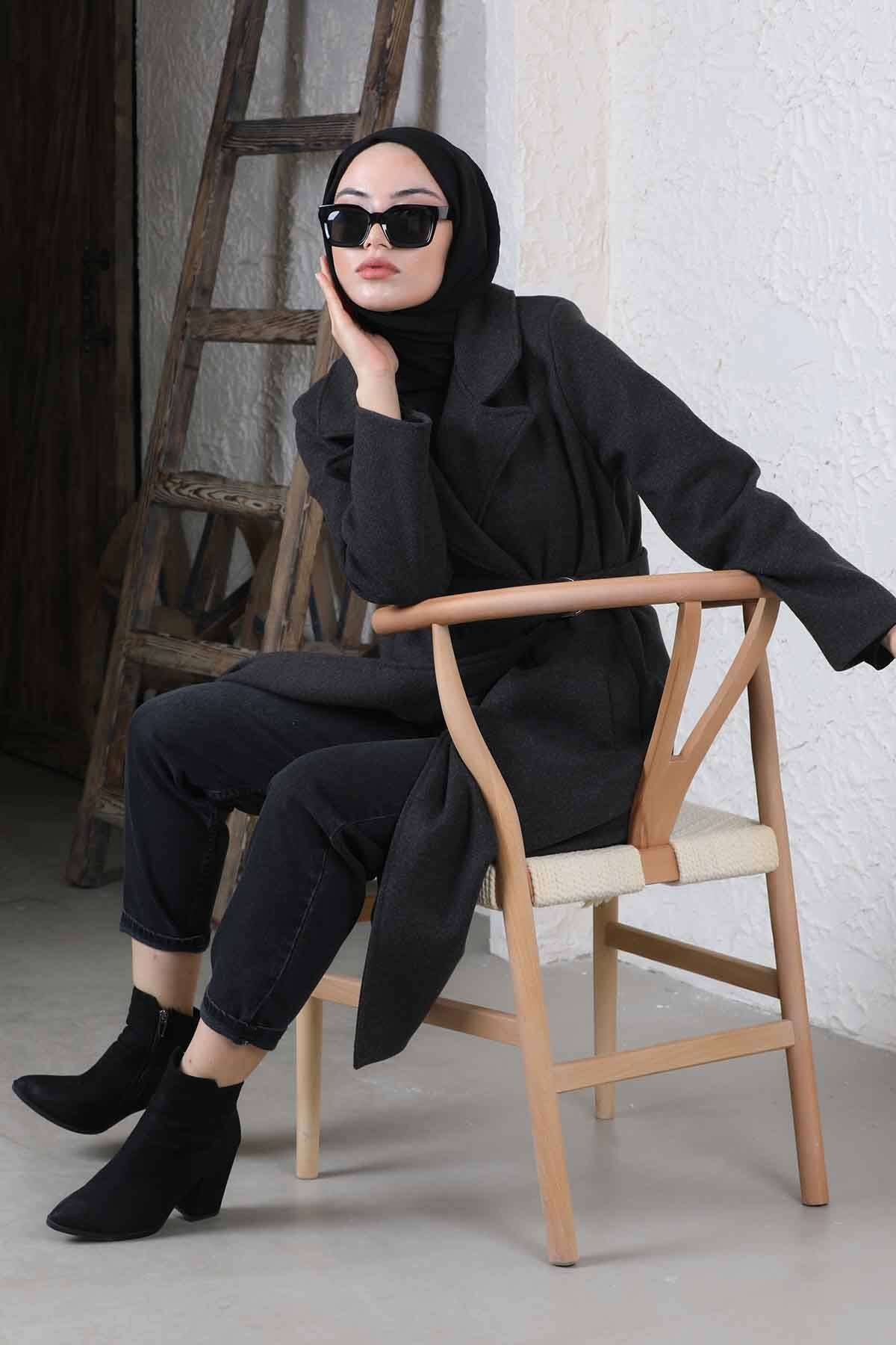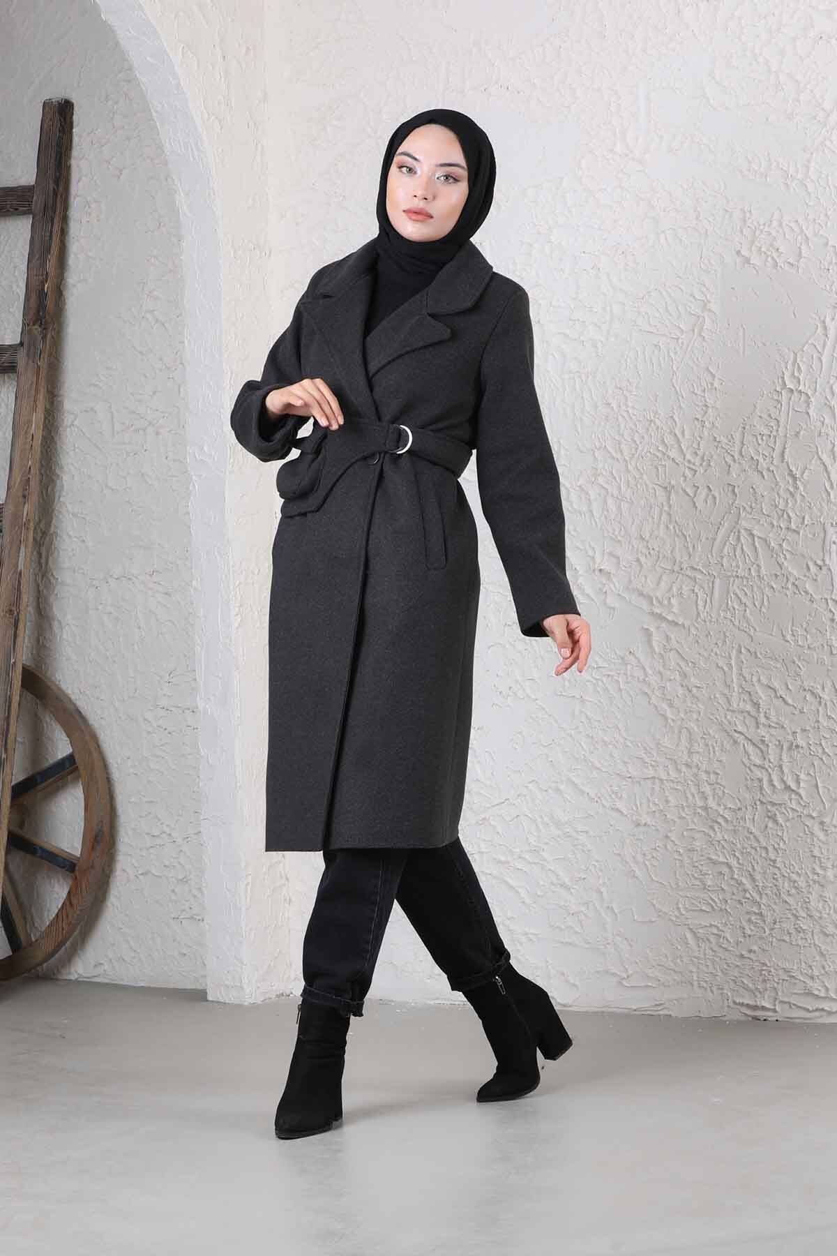 Çantalı Kaşe Kaban Füme. Seyyar çanttalı kemeri mevcuttu, telefon cüzdan için koymak için uygun ve rahattır. Astarlıdır. Yandan iki cebi bulunmaktadır. Kruvaze kapamadır.