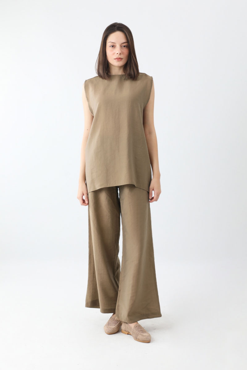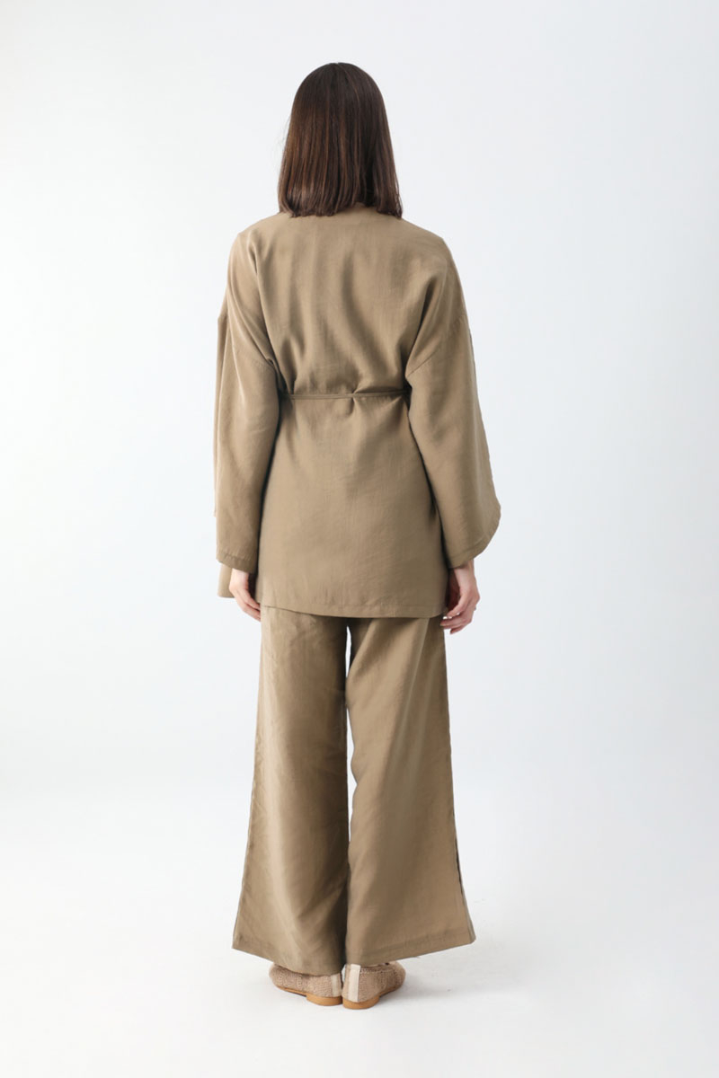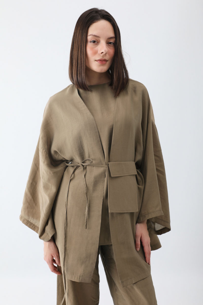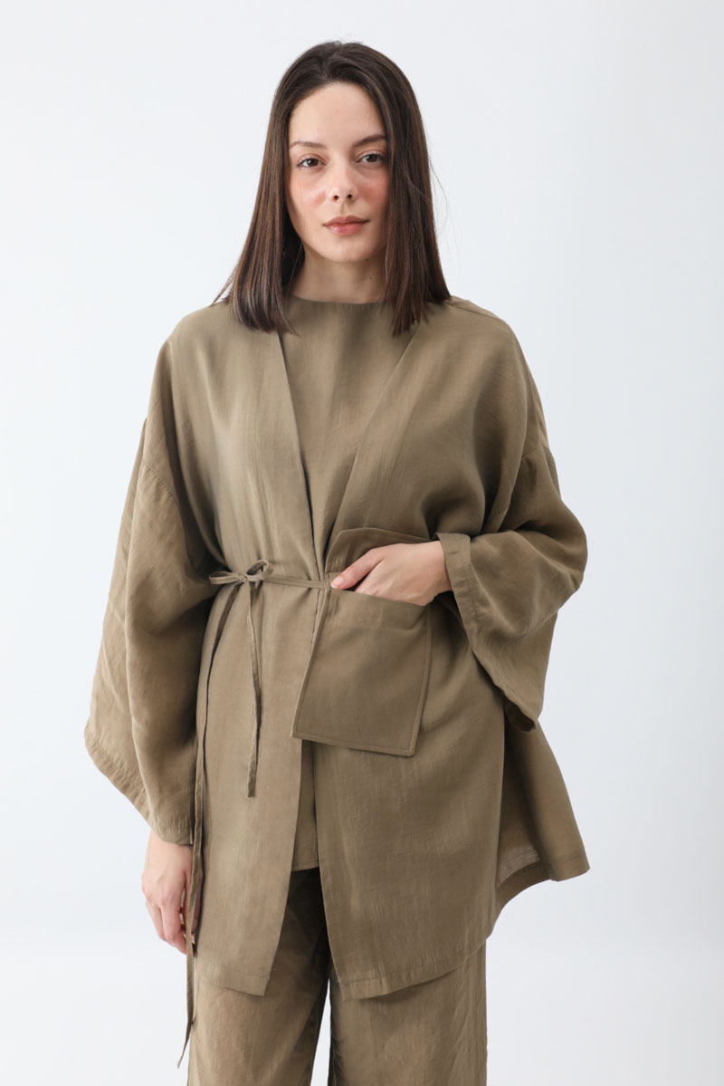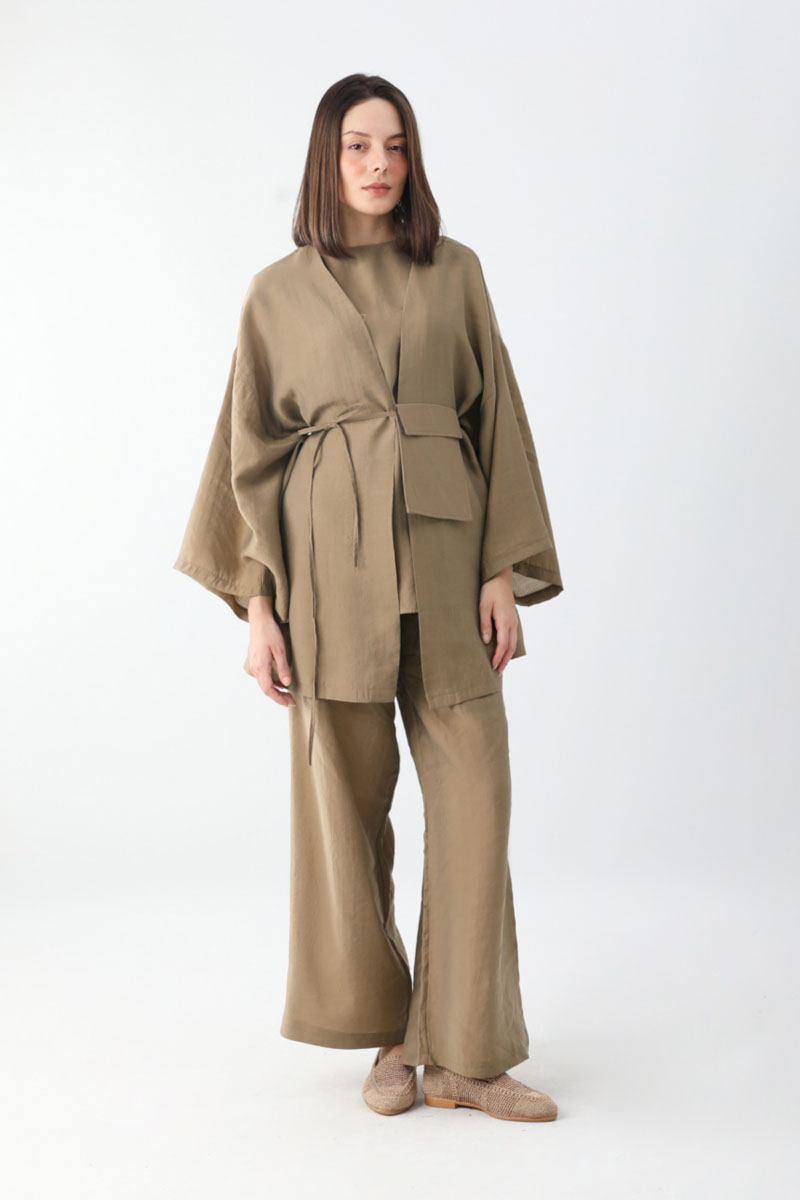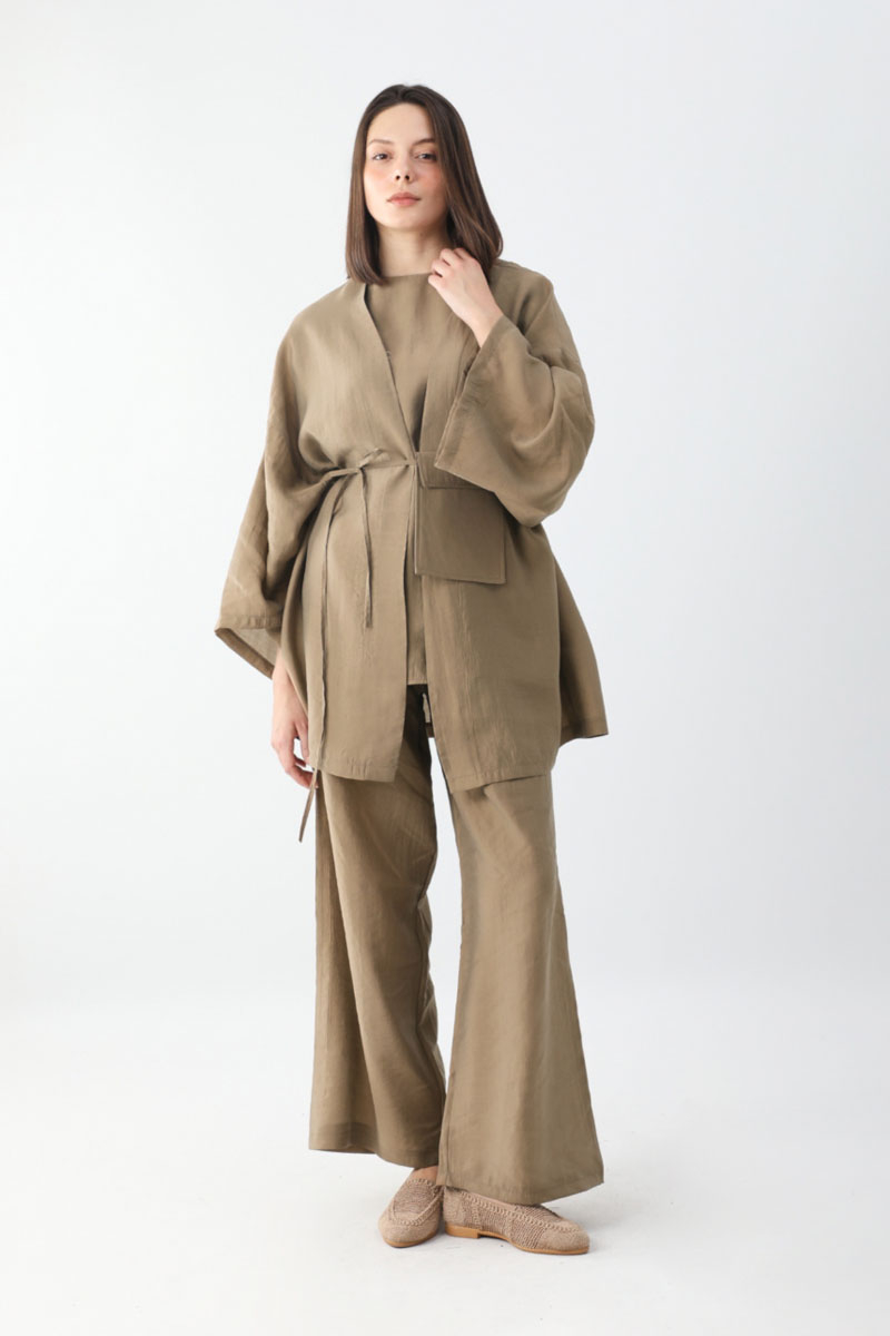 Çantalı Üçlü Takım Camel. İç Bluz: bisiklet yakadır, sıfır kolludur, arkadan fermuarlıdır, Kimono: düşük omuzludur, geniş kolludur, Pantolon: belden lastiklidir, yandan ceplidir, bol paçadır, çanta aksesuarlıdır. Günlük kullanım ve özel günlerinizde tercih edebilirsiniz.