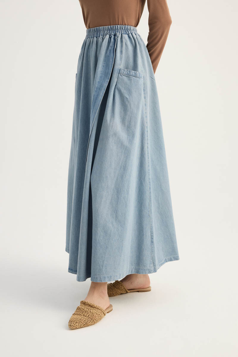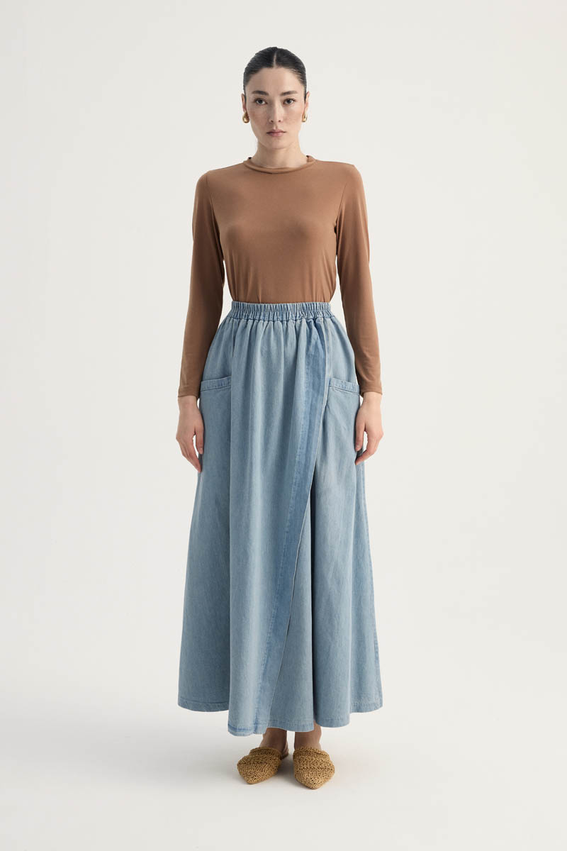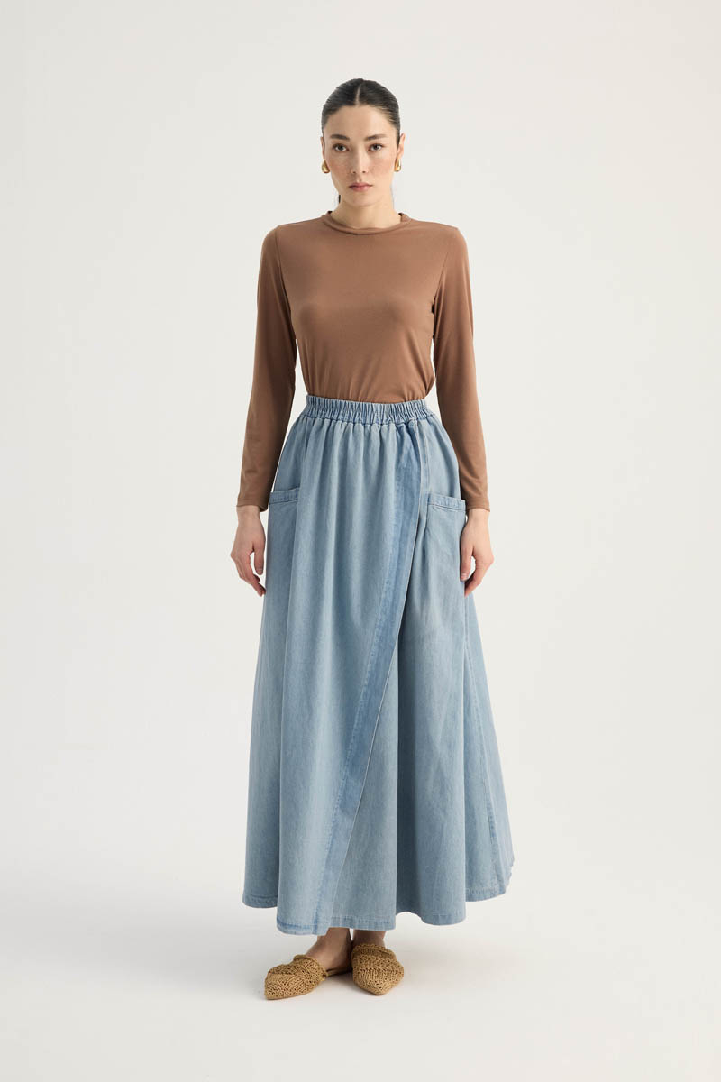 Çapraz Detaylı Denim Etek Buz Mavisi. Yüksek beldir, eteği çapraz parça detaylıdır, Verev dikişli beli lastiklidir, yandan ceplidir, fermuarsızdır, astarsızdır. Günlük kullanım ve özel günlerinizde tercih edebilirsiniz.