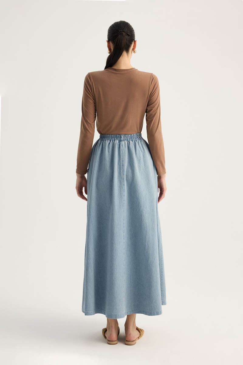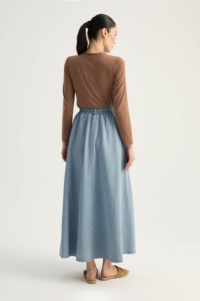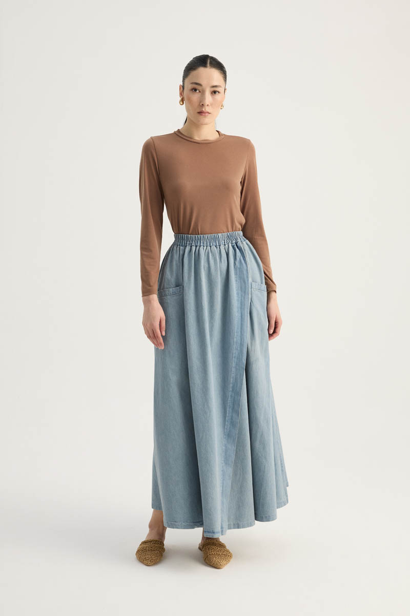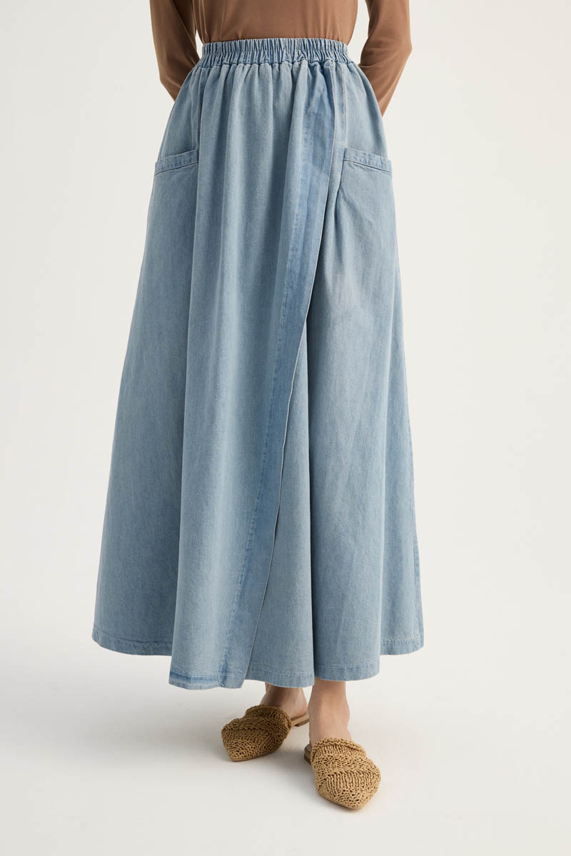 Çapraz Detaylı Denim Etek Buz Mavisi. Yüksek beldir, eteği çapraz parça detaylıdır, Verev dikişli beli lastiklidir, yandan ceplidir, fermuarsızdır, astarsızdır. Günlük kullanım ve özel günlerinizde tercih edebilirsiniz.