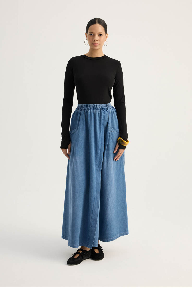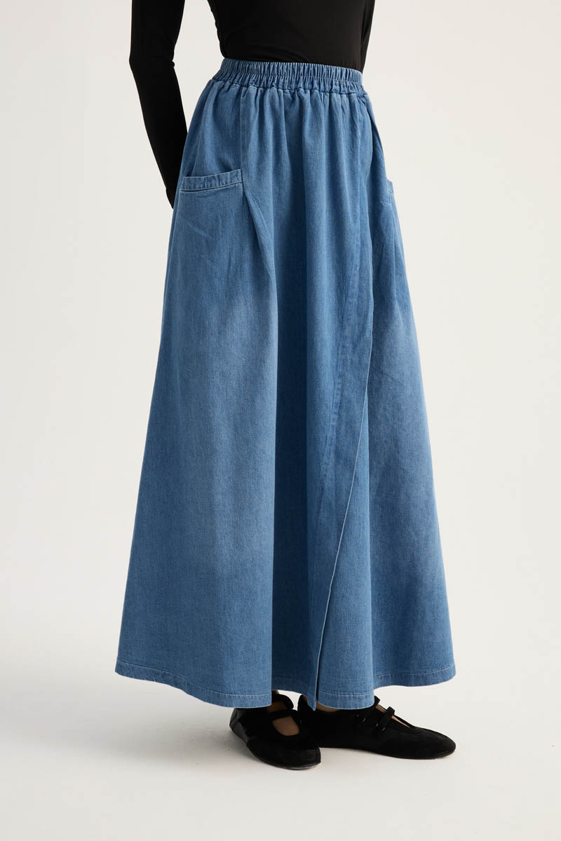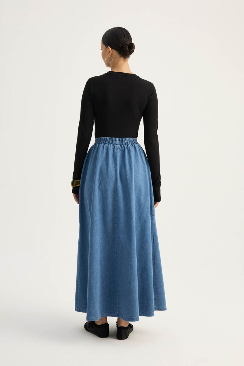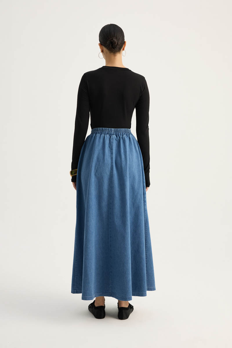 Çapraz Detaylı Denim Etek Mavi. Yüksek beldir, eteği çapraz parça detaylıdır, Verev dikişli beli lastiklidir, yandan ceplidir, fermuarsızdır, astarsızdır. Günlük kullanım ve özel günlerinizde tercih edebilirsiniz.