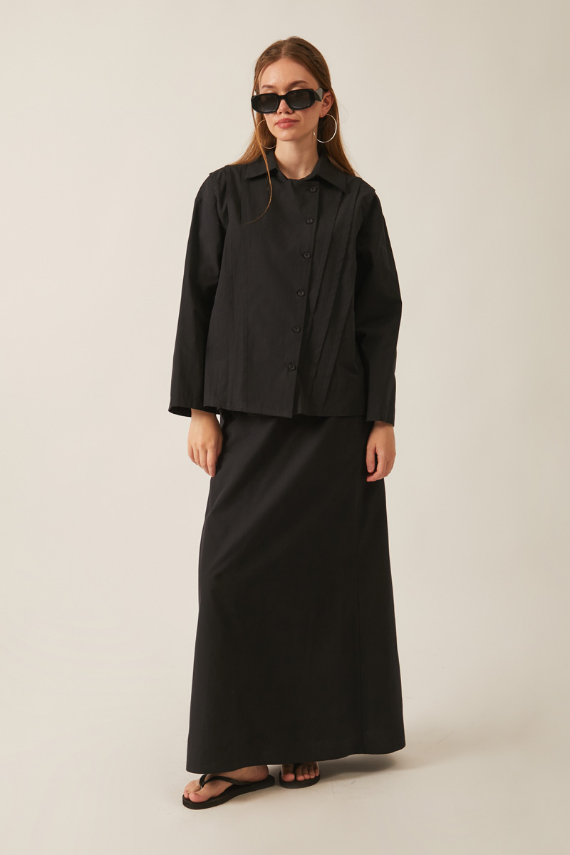 Ceket Yaka Etek Takım Siyah. Gömleğin ceket ve kruvaze yaka tasarım ve rahat kesimi, eteğin dökümlü formuyla birleşerek size özgür ve kendinden emin bir duruş kazandırır. Kalem etek kesimli eteğiyle gün boyu hareket özgürlüğünün yanında zarif görüntüsü ile uyum sağlar. İlkbahar ve yaz aylarında hem günlük kullanım hem de özel günler için ideal bir seçenektir.
