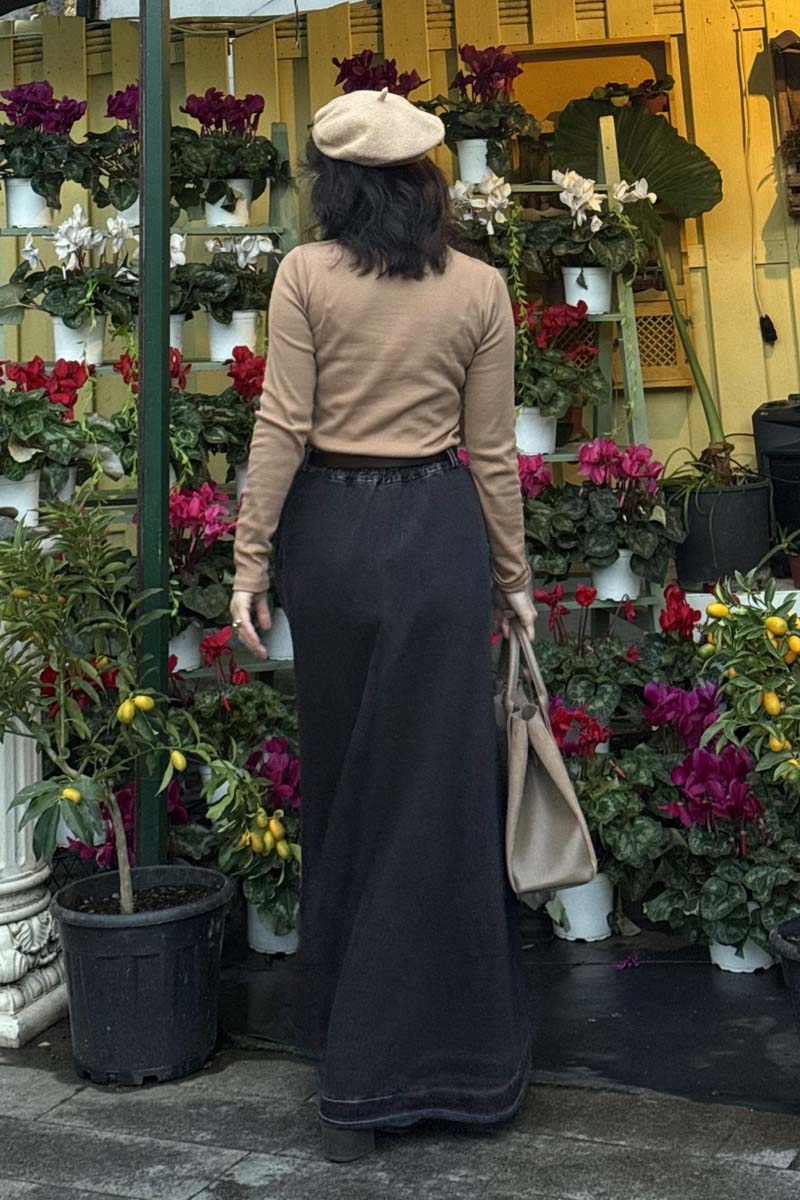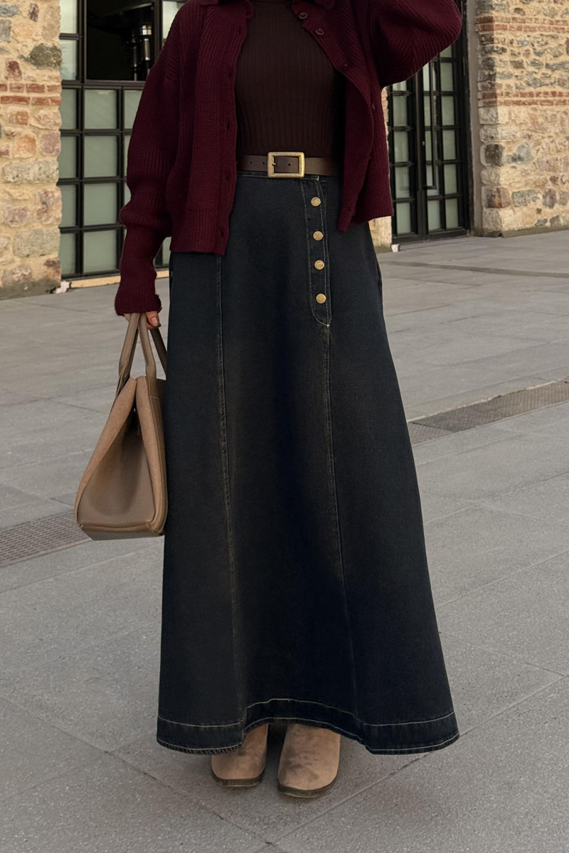 Cep Detaylı Denim Etek Koyu Mavi, zamansız denim dokusunu modern detaylarla buluşturarak güçlü ve dengeli bir siluet sunar. A kesime yakın formu vücut hatlarını nazikçe dengelerken, yan kısmında yer alan metal düğme detayları tasarıma karakter kazandırır. Tok denim kumaşı formunu korur ve gün boyu konfor sağlar. Gömleklerden trikoya, ceketlerden süveterlere kadar pek çok parçayla kolayca kombinlenerek şehir stilinin vazgeçilmezleri arasında yerini alır.