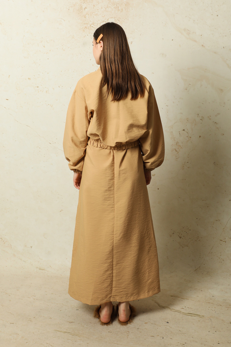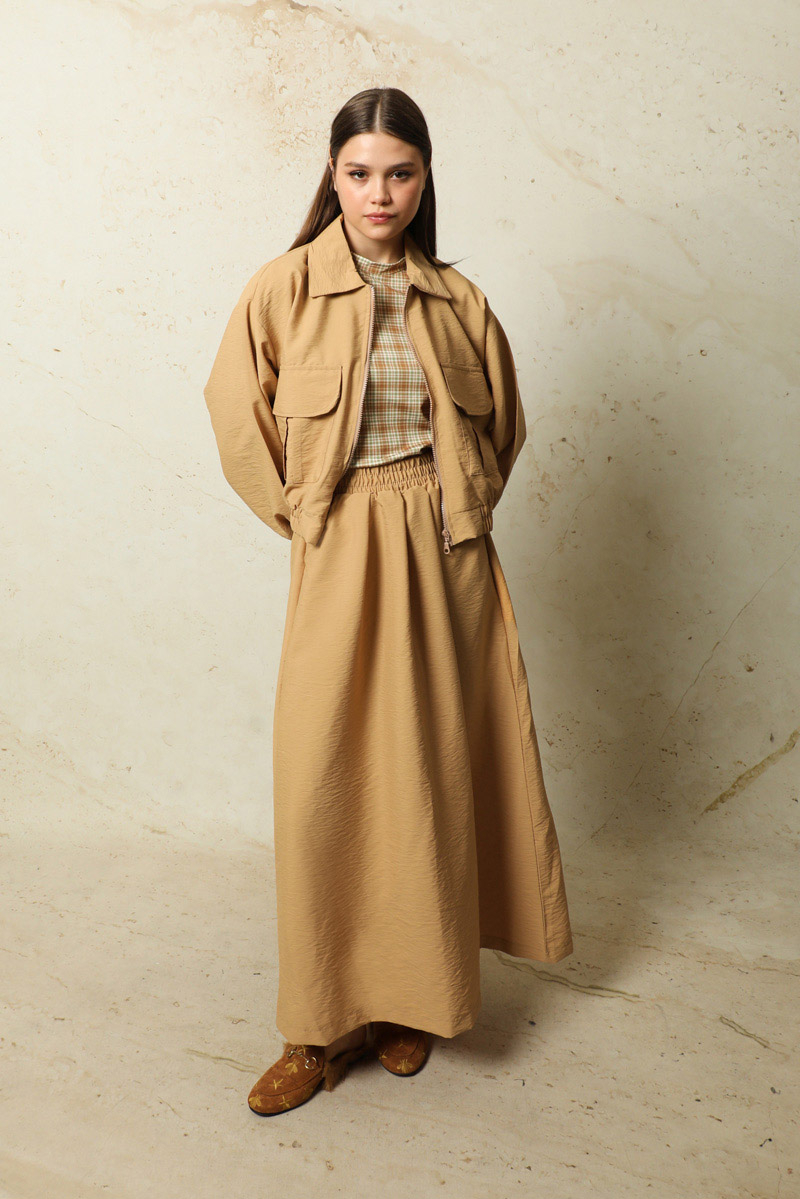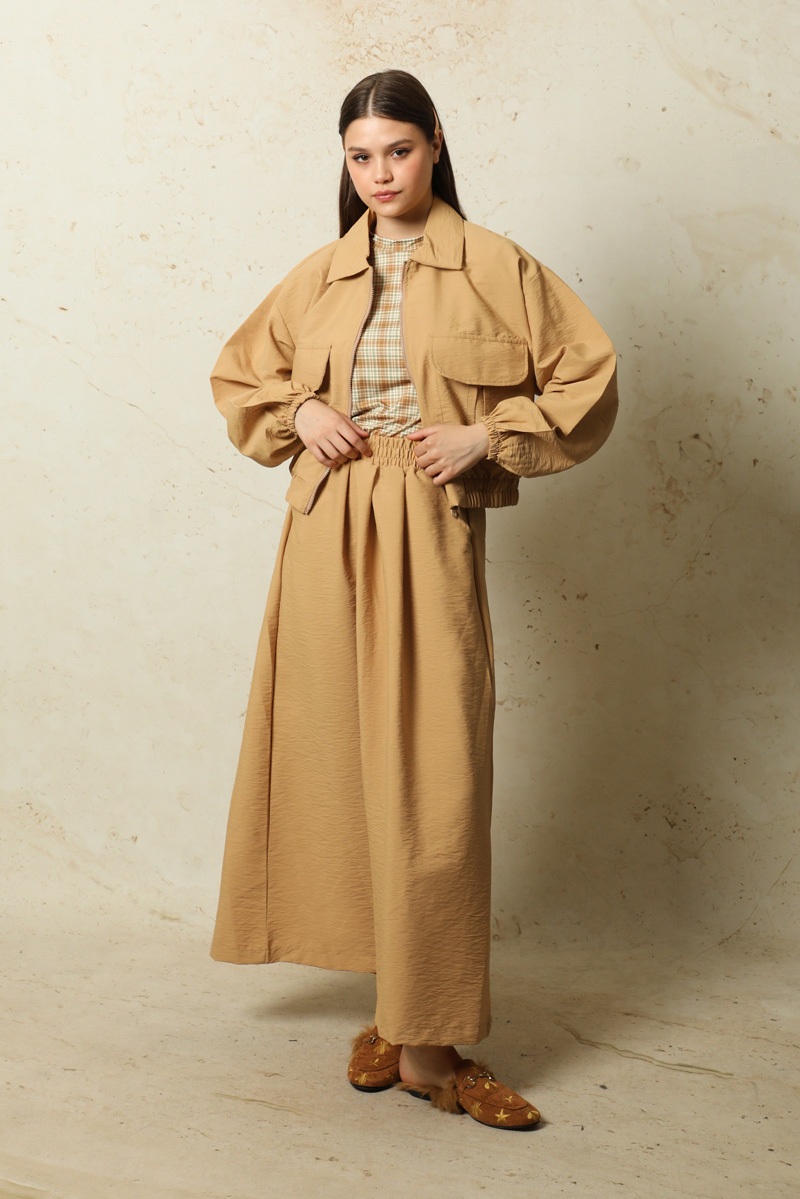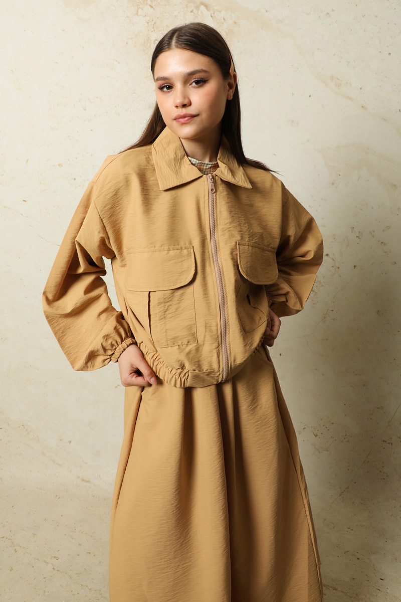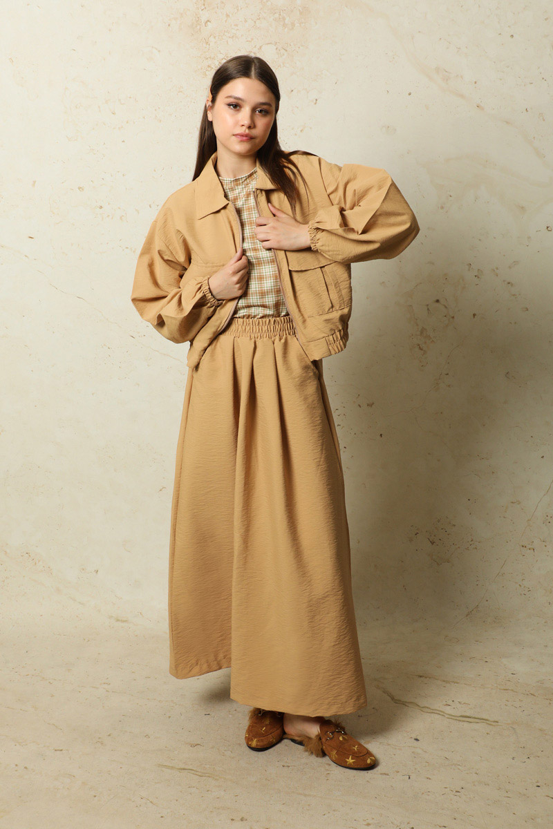 Cepli Ceket Etek Takım Camel. Gömlek yakalıdır. Önü fermuarlıdır. Manşeti lastiklidir. Düşük omuzludur. Önünde cep kısmı mevcuttur. Etek beli lastiklidir. Balon etektir.Astarsızdır.