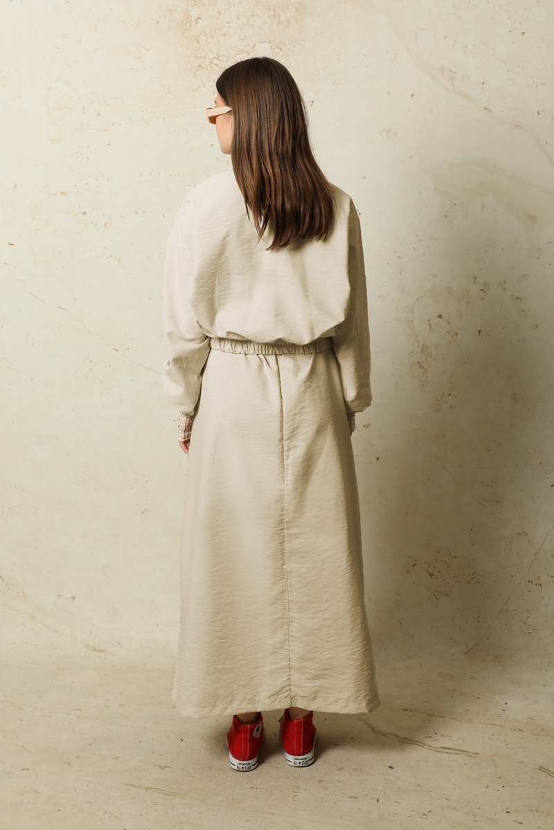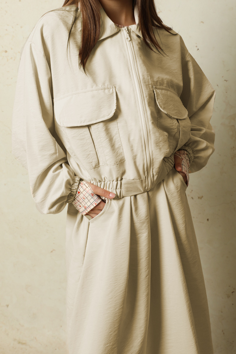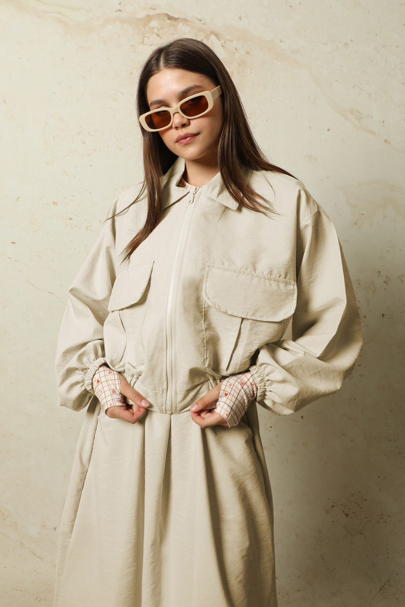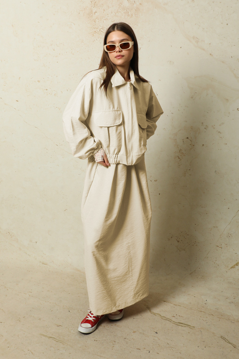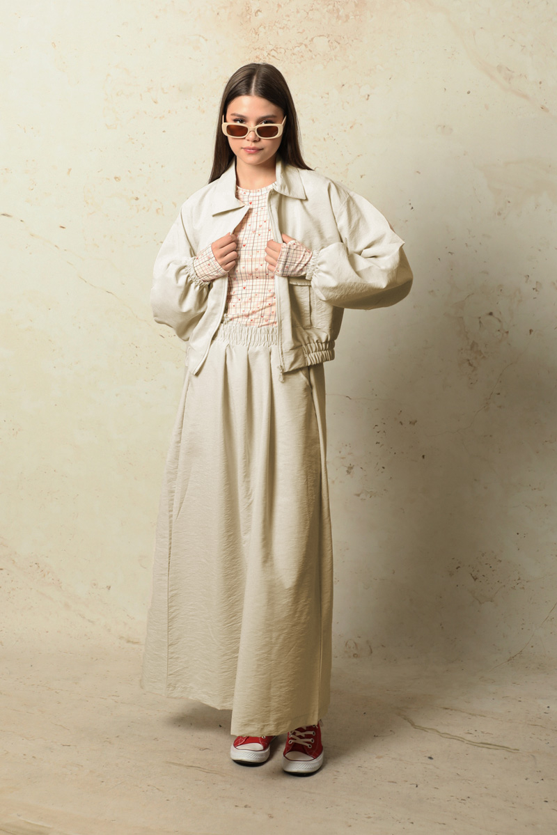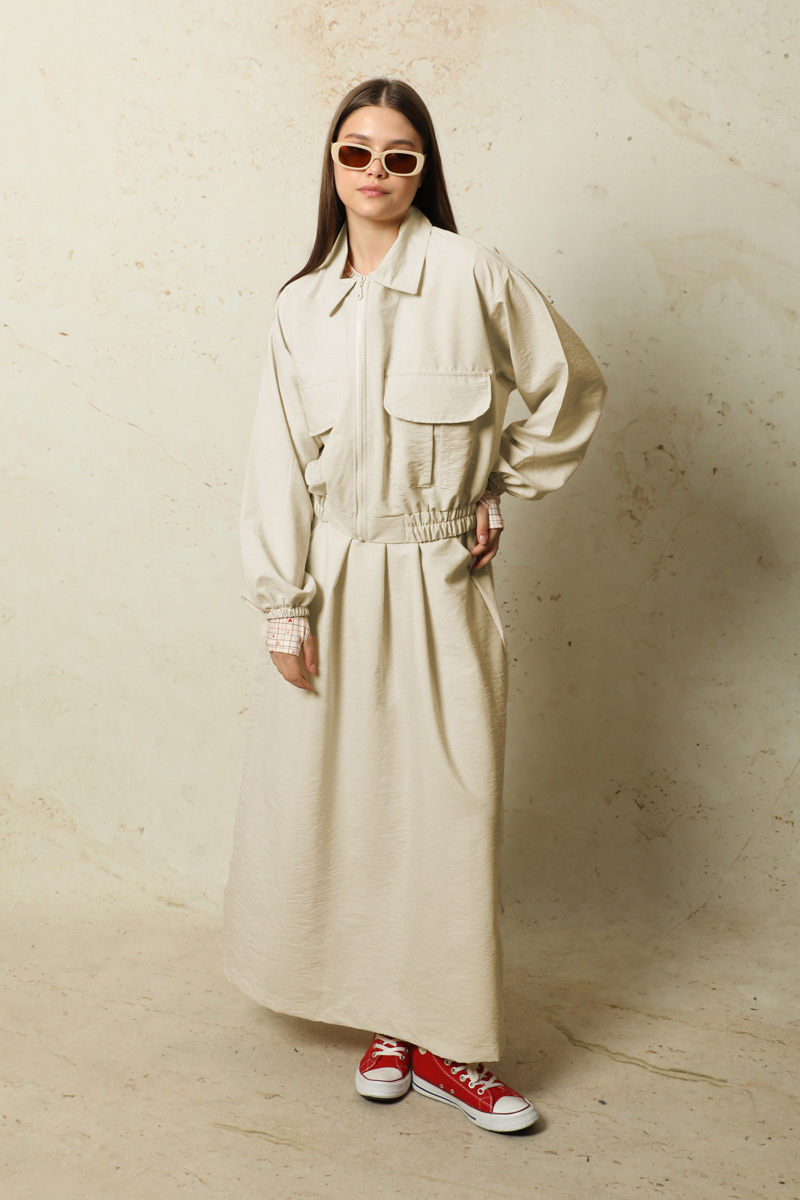 Cepli Ceket Etek Takım Taş. Gömlek yakalıdır. Önü fermuarlıdır. Manşeti lastiklidir. Düşük omuzludur. Önünde cep kısmı mevcuttur. Etek beli lastiklidir. Balon etektir.Astarsızdır.