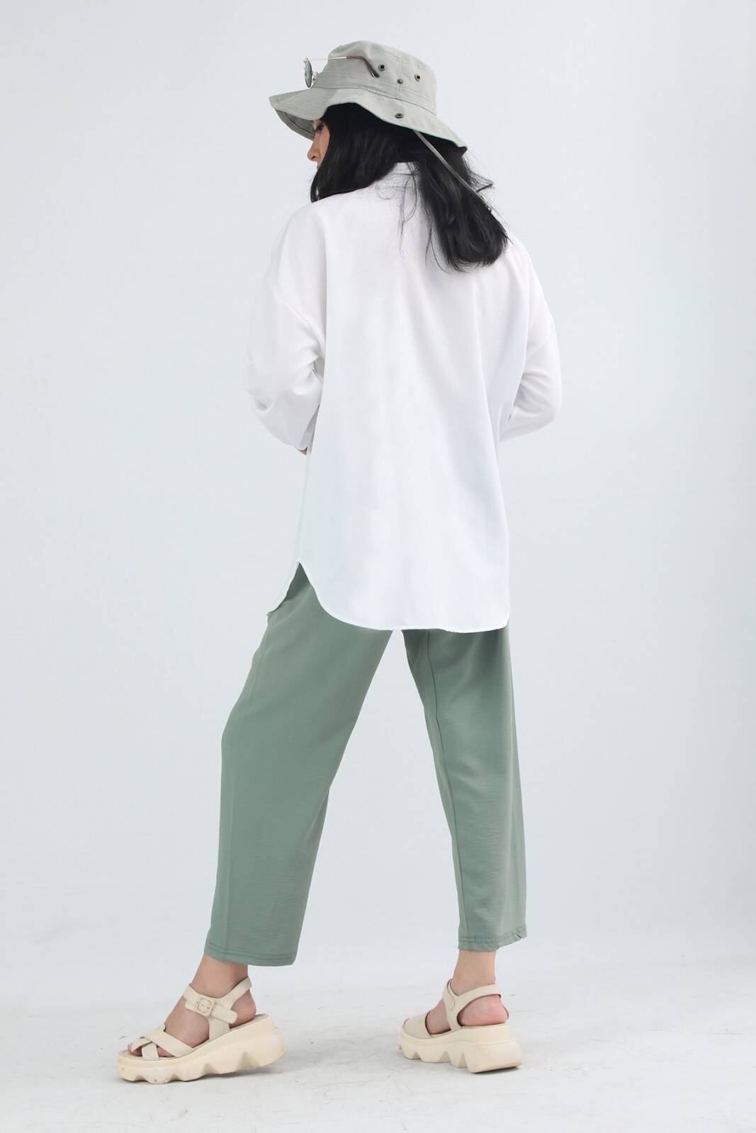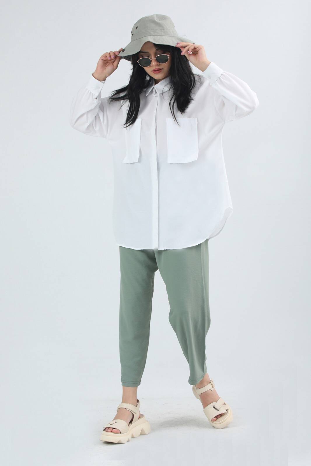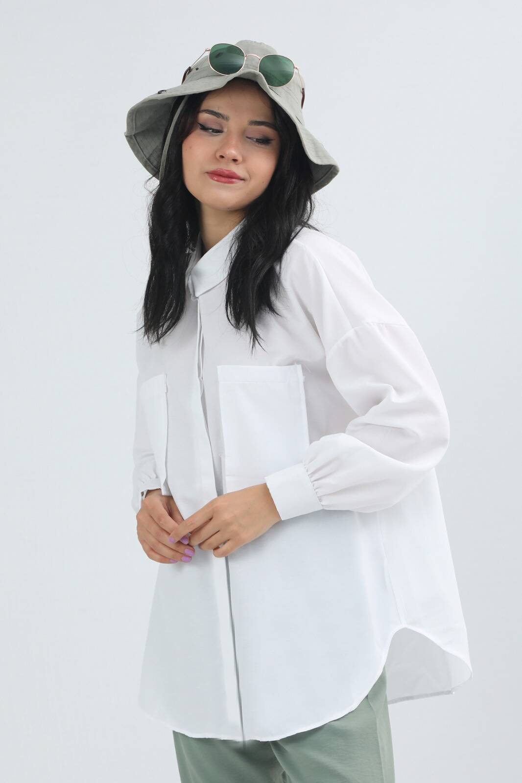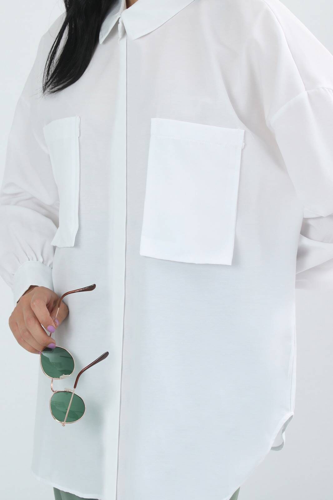 Cepli Oversize Gömlek Beyaz