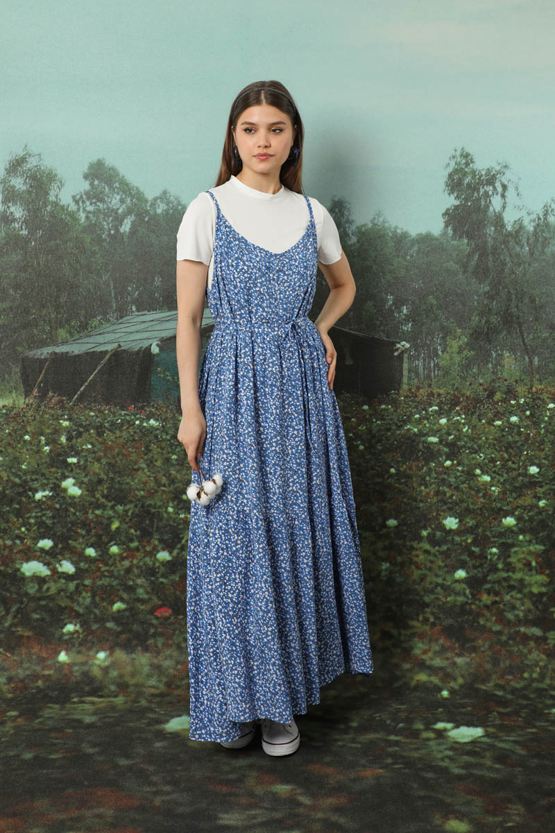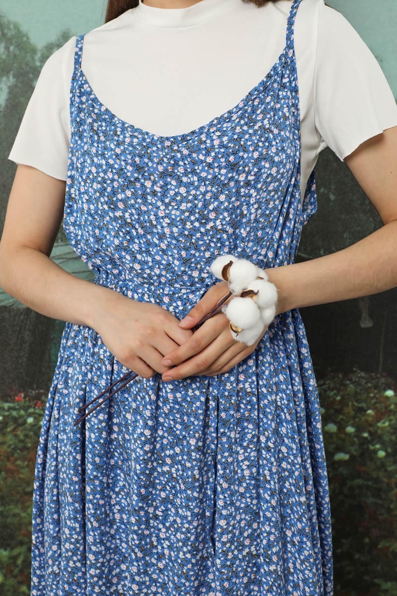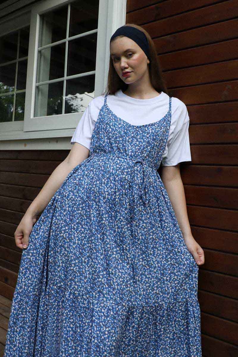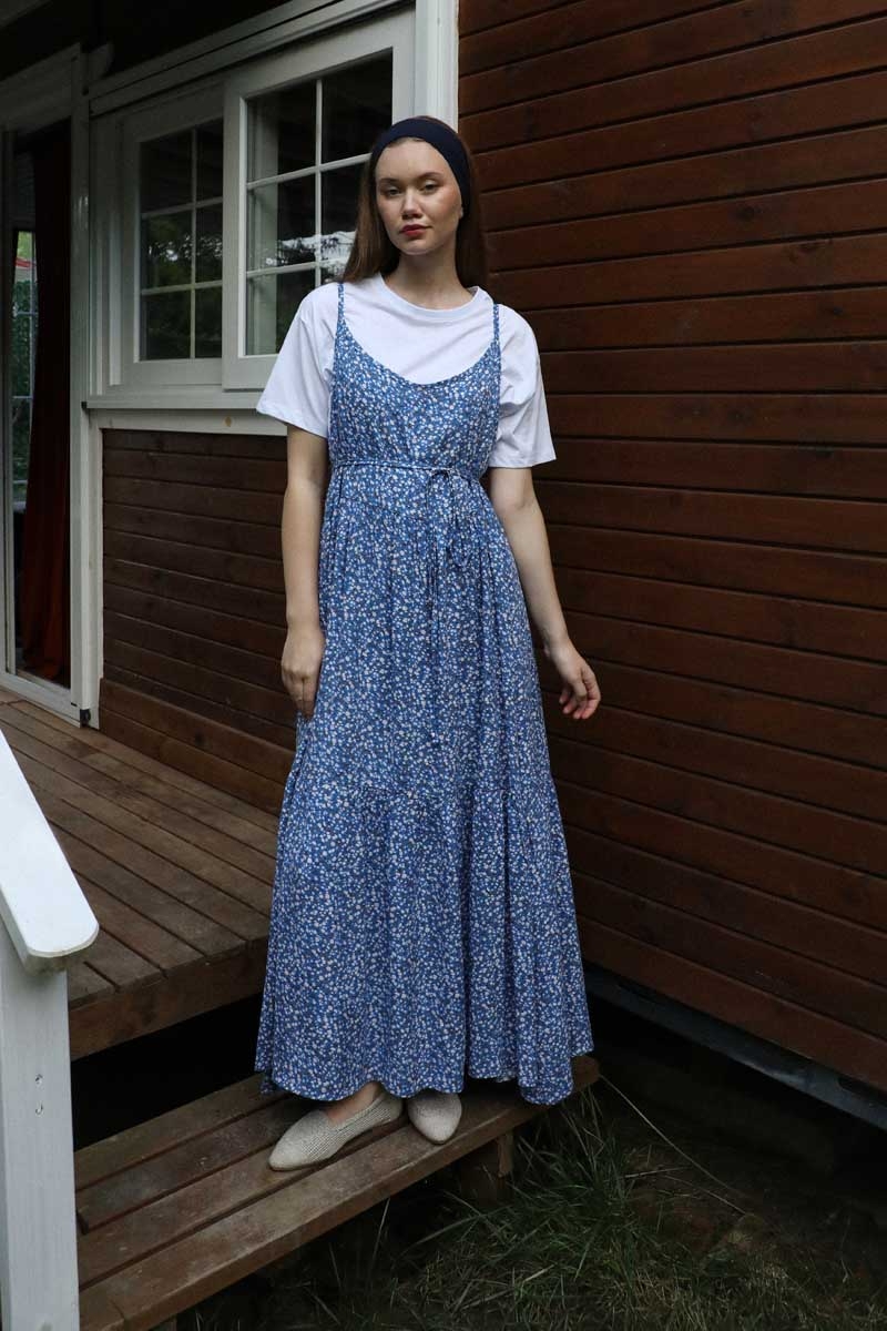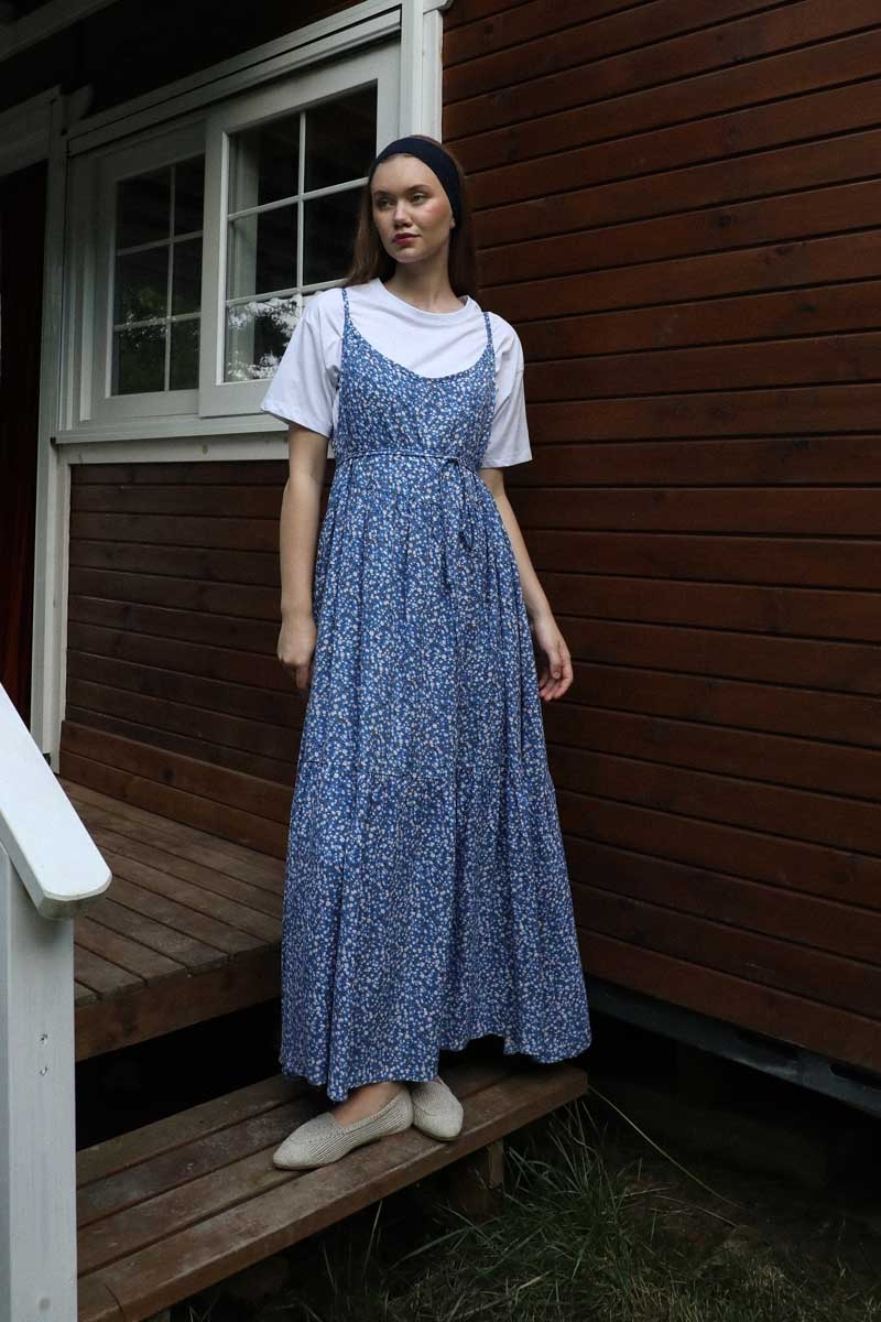 Çiçek Desenli İnce Askılı Elbise Mavi