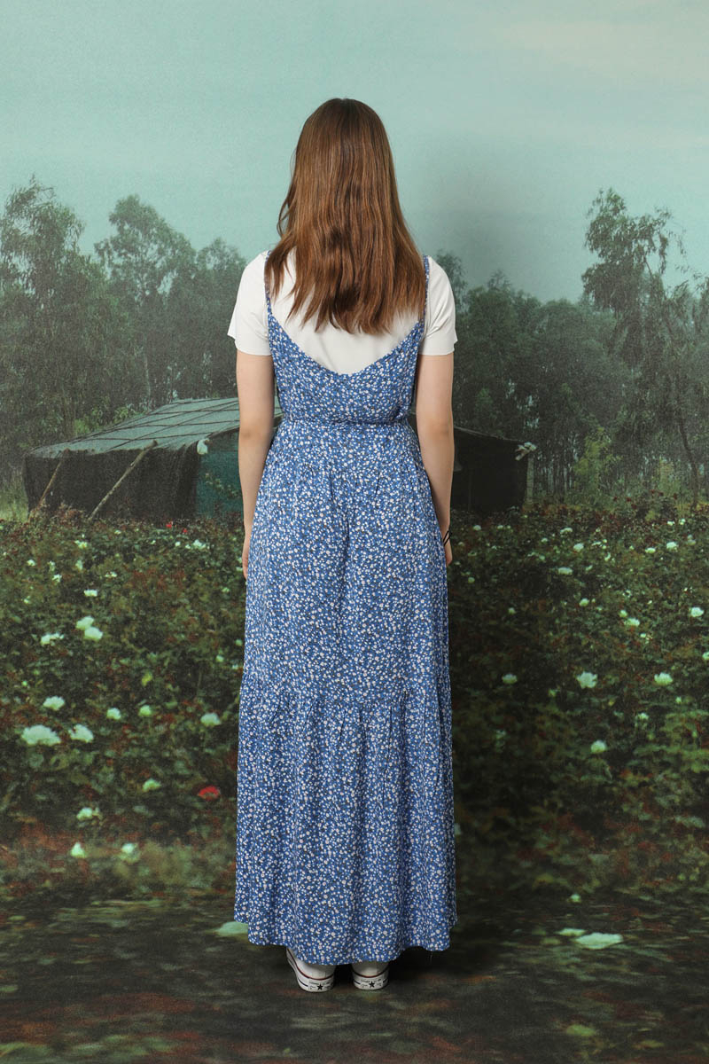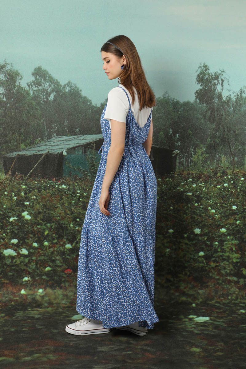 İnce Askılı ElbiseMavi.İnce kuşaklıdır. Büzgülü ve kesik detaylıdır. İnce askılıdır. V yakalıdır. Astarsızdır. Çiçek desenlidir.