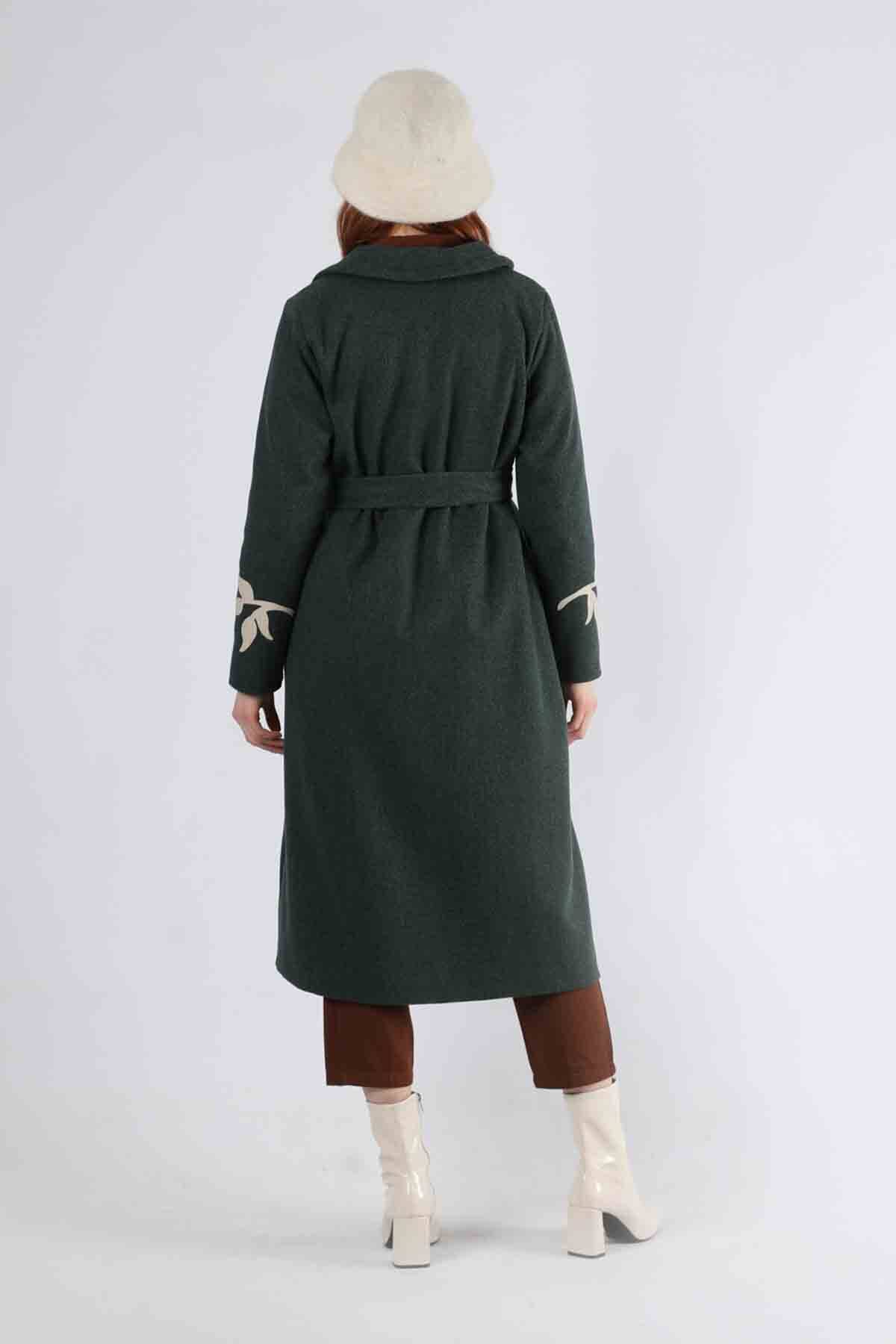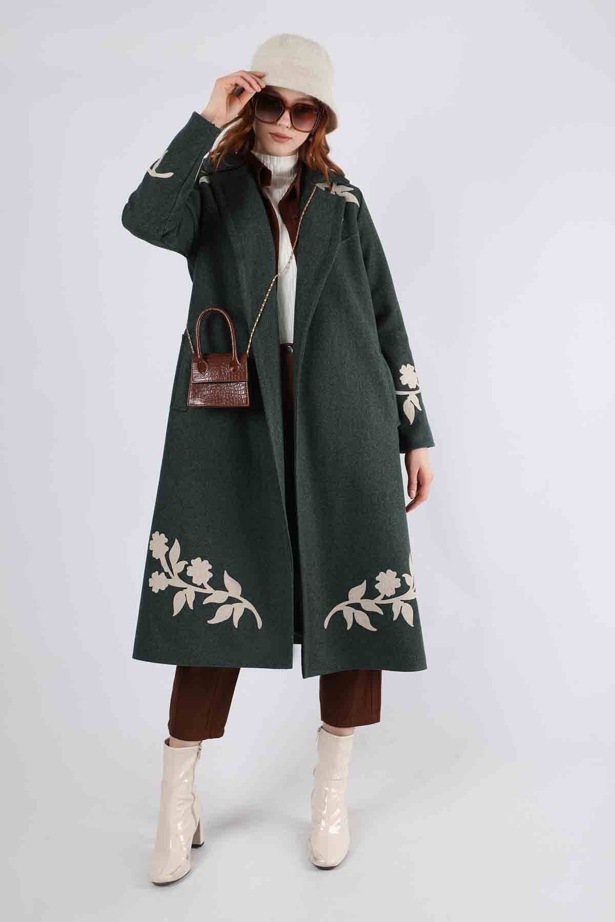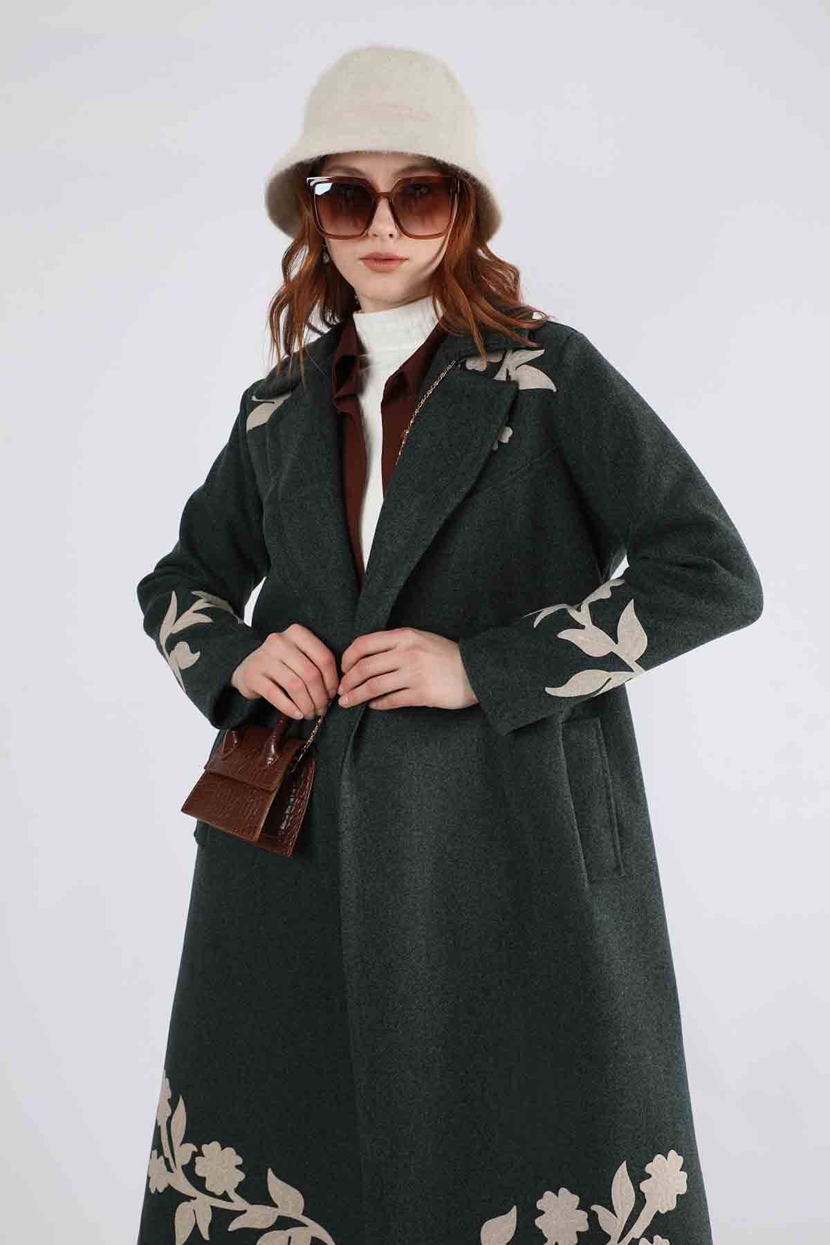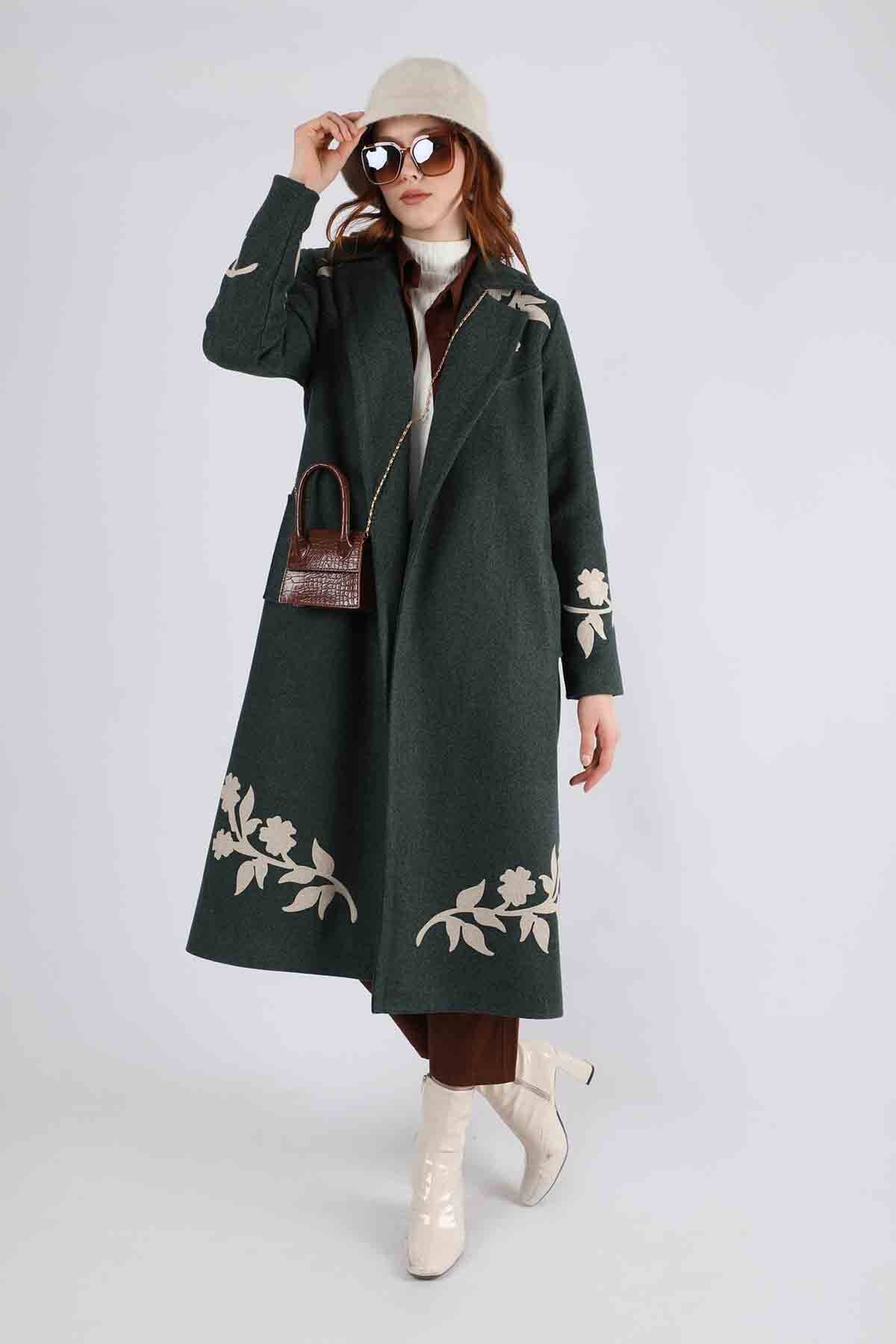 Çiçek Desenli Kaşe Kaban Koyu Yeşil