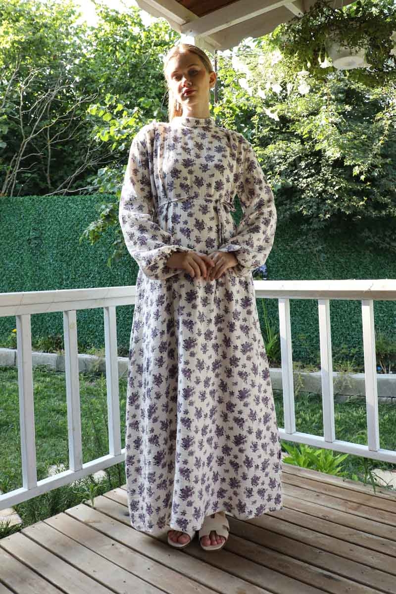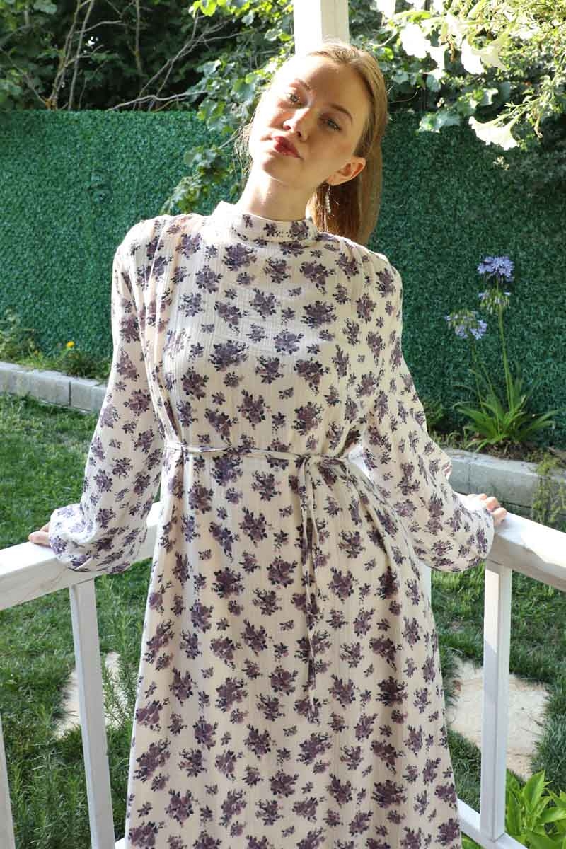 Çiçek Desenli Müslin Elbise Lila. Belden biye kuşaklı, arkadan fermuarlı, hakim yaka, astarsız, manşetleri lastikli. Çıtır çiçek desenlidir. Günlük kullanıma uygundur. Pamuklu kumaş terletme yapmaz. Sıcak yaz mevsimi için uygundur.