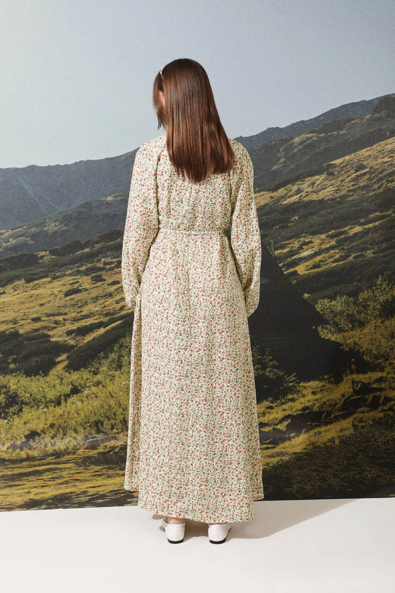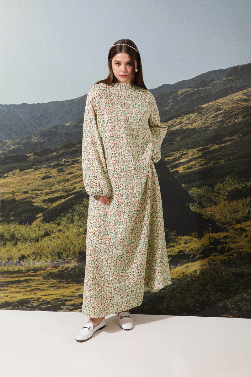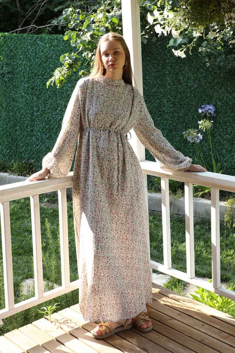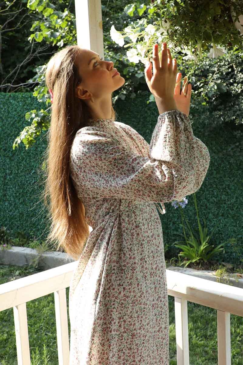 Çiçek Desenli Müslin Elbise Nar Çiçeği
