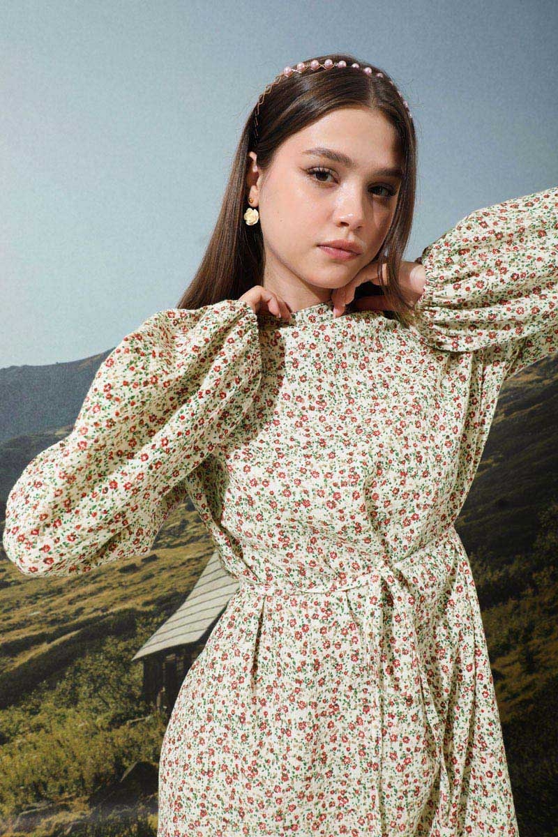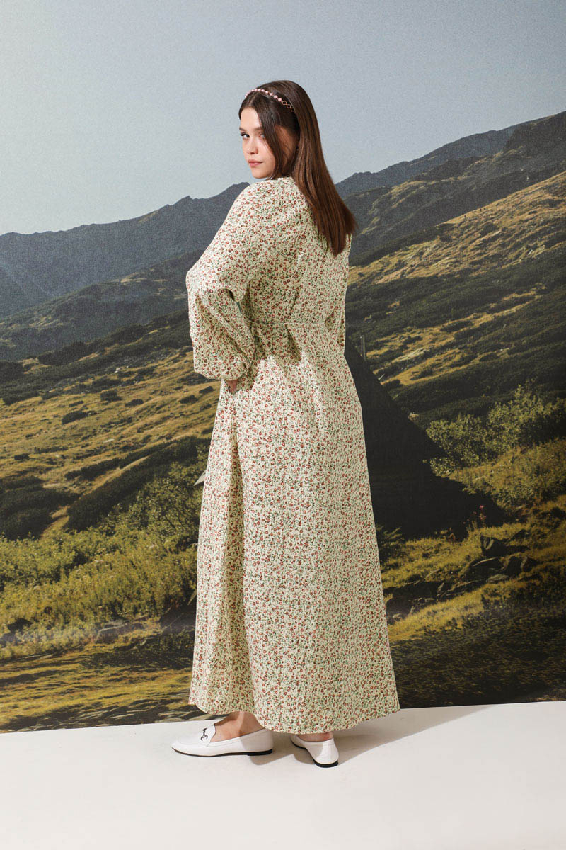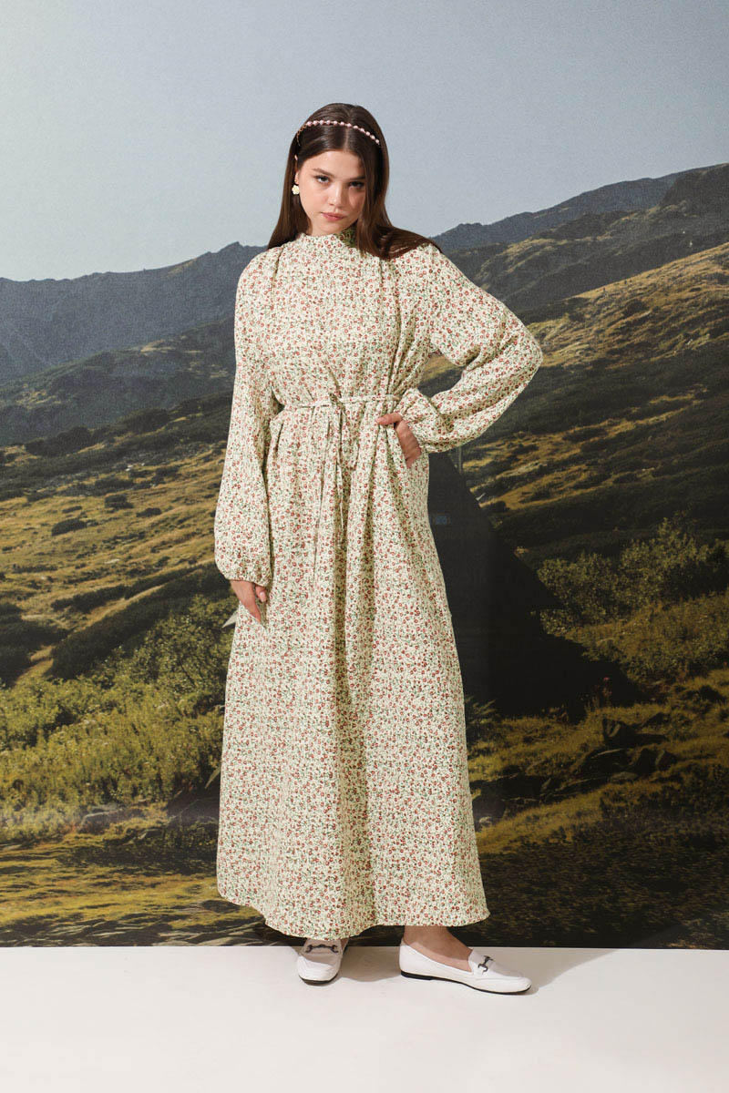 Çiçek Desenli Müslin Elbise Nar Çiçeği . Belden biye kuşaklı, arkadan fermuarlı, hakim yaka, astarsız, manşetleri lastikli. Çıtır çiçek desenlidir. Günlük kullanıma uygundur. Pamuklu kumaş terletme yapmaz. Sıcak yaz mevsimi için uygundur.