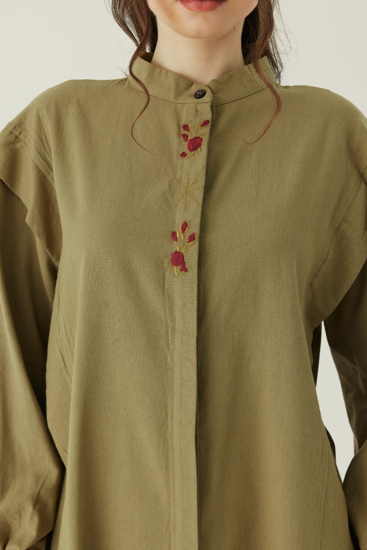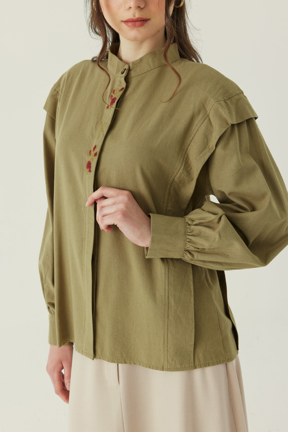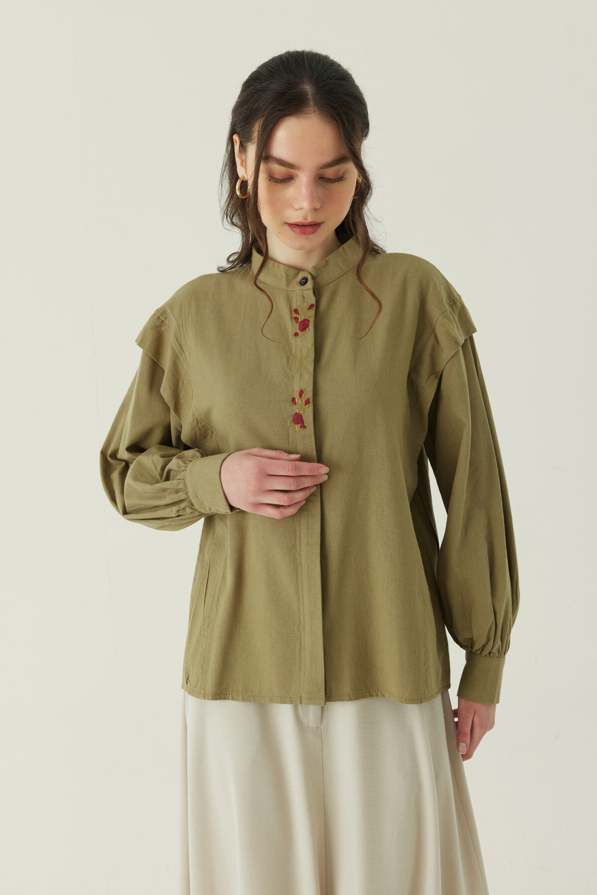 Çiçek Nakışlı Keten Gömlek Haki