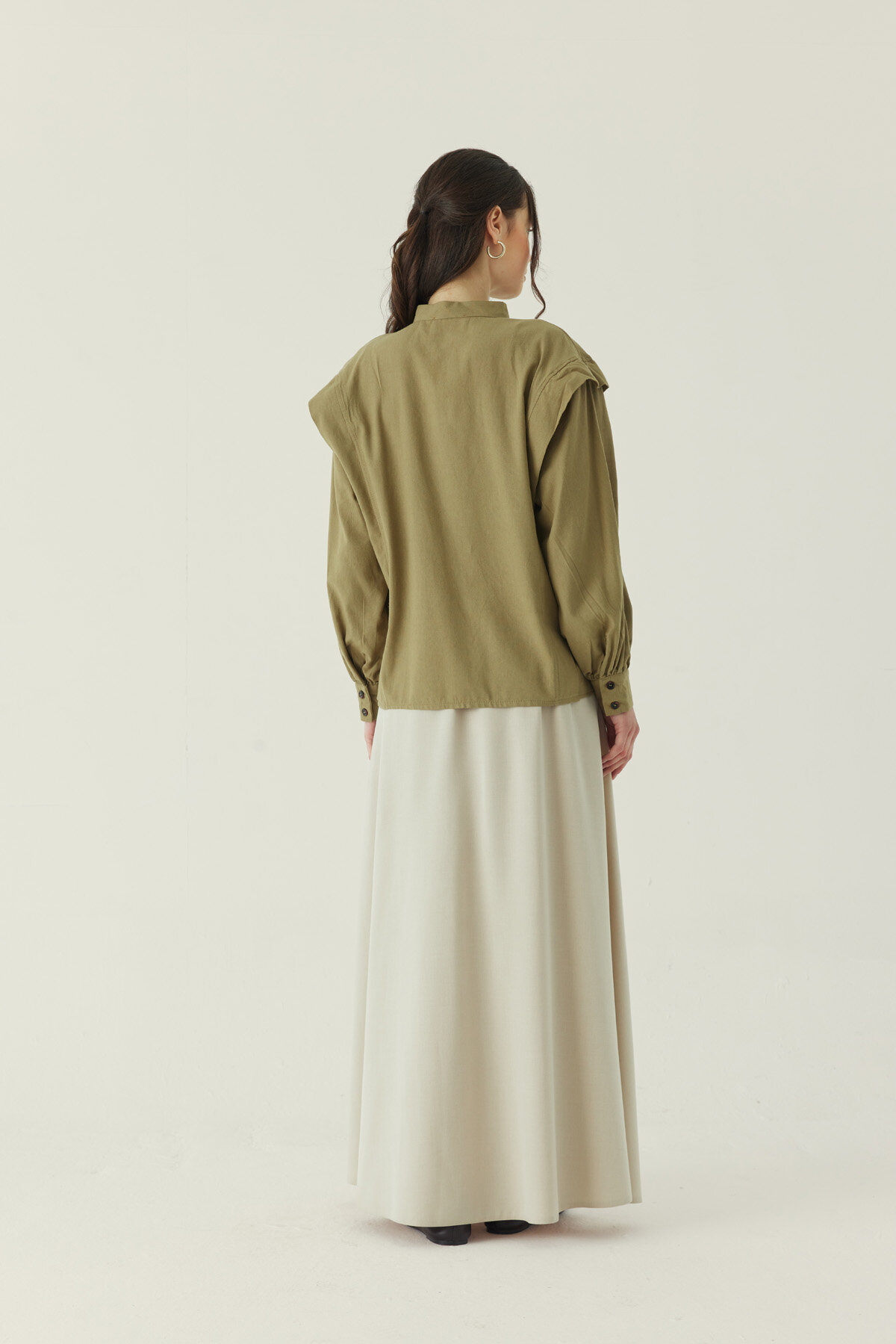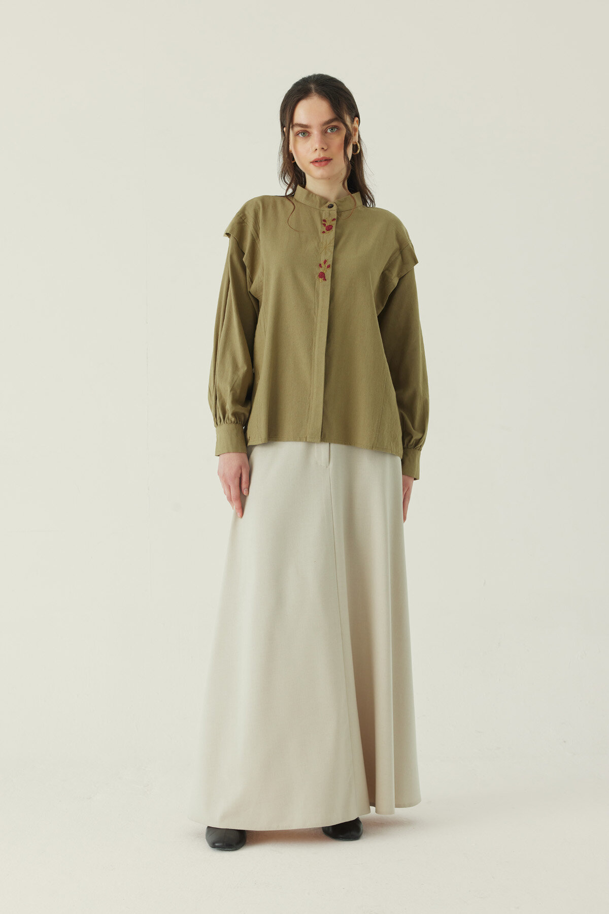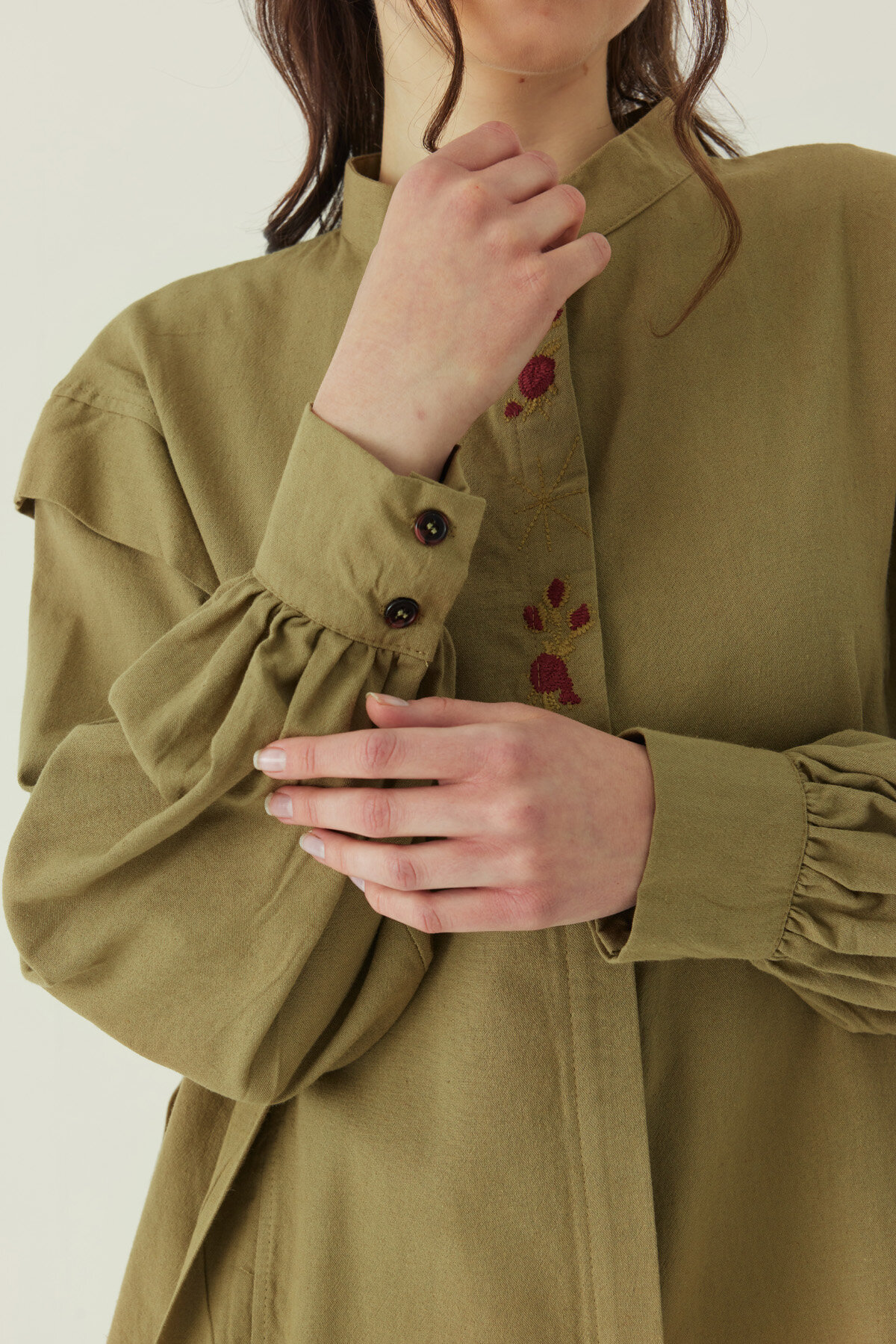 Çiçek Nakışlı Keten Gömlek Haki