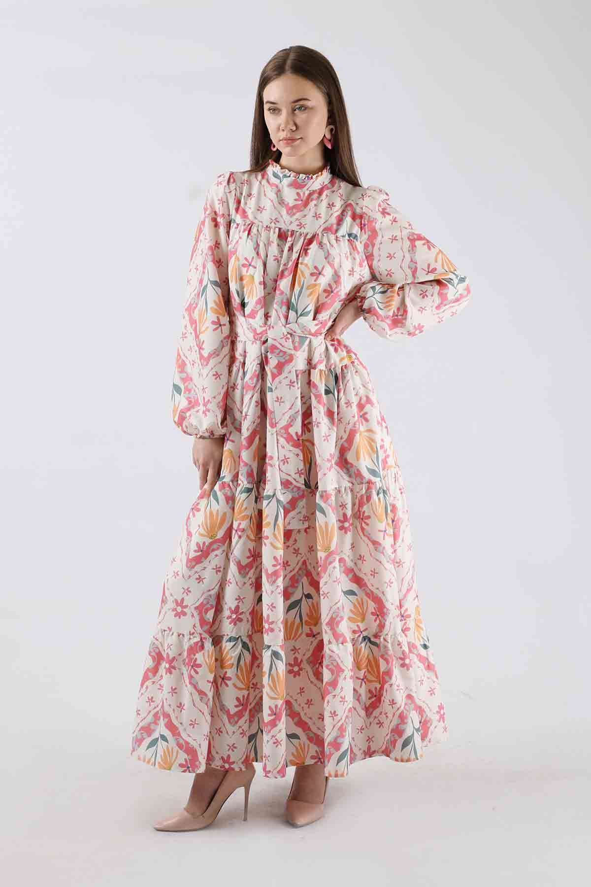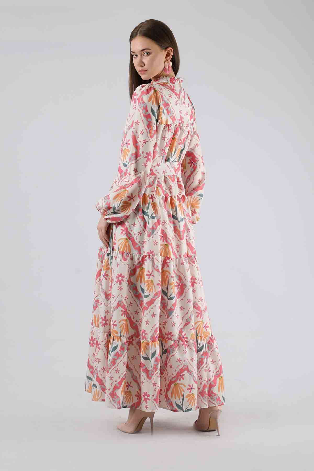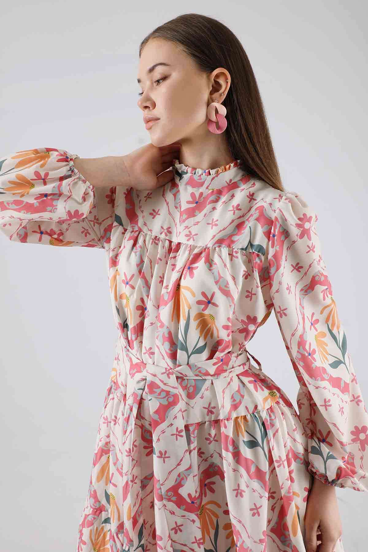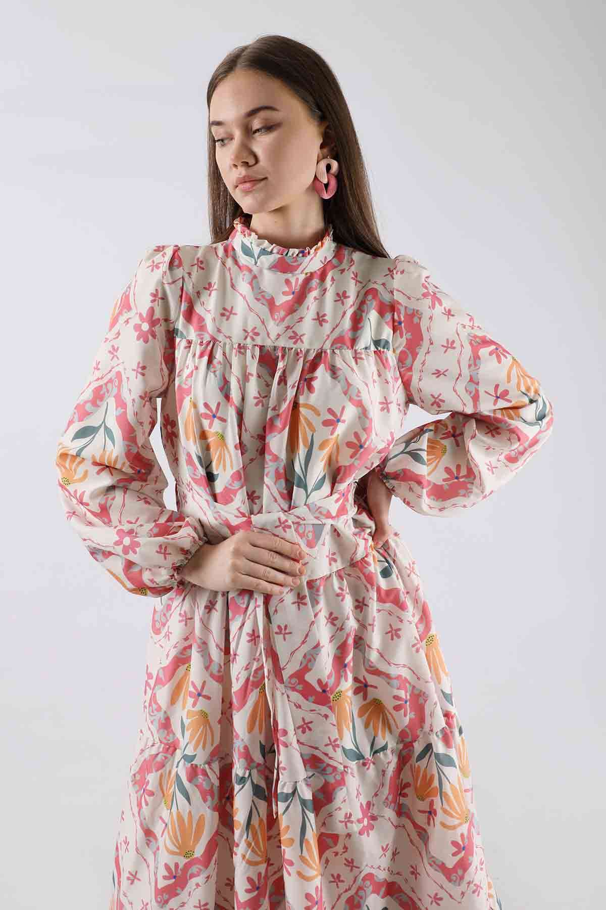 Çiçekli Aura Elbise Pembe. fırfır yaka, Seyyar Kuşaklıdır. Astarlıdır. Baskılı kumaş özelliği sayesinde tüysüz ve pürüzsüz bir yapısıyla yeni sezona renk katan favori ürünlerdendir.
