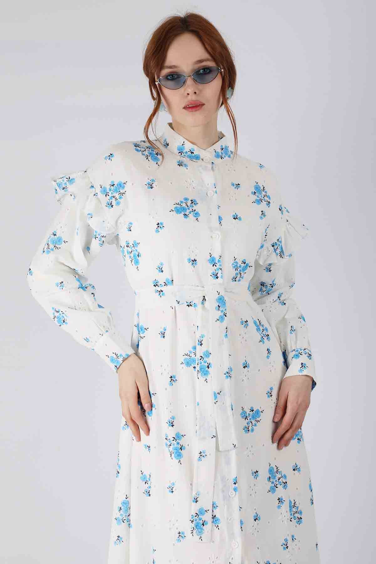 Çiçekli Brode Elbise Mavi