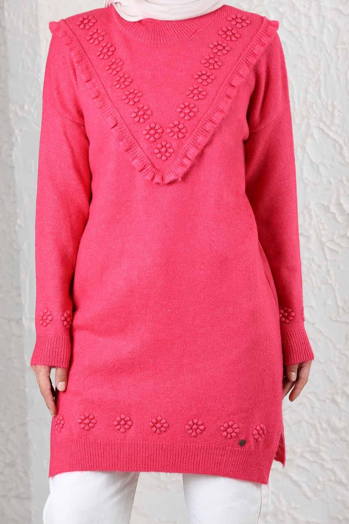 Çiçekli Kazak Pembe. Örme trikodur. Yumuşak dokuludr batma yapmaz. Çiçek detayları vardır. Bisiklet yaka. Rahat kalıp