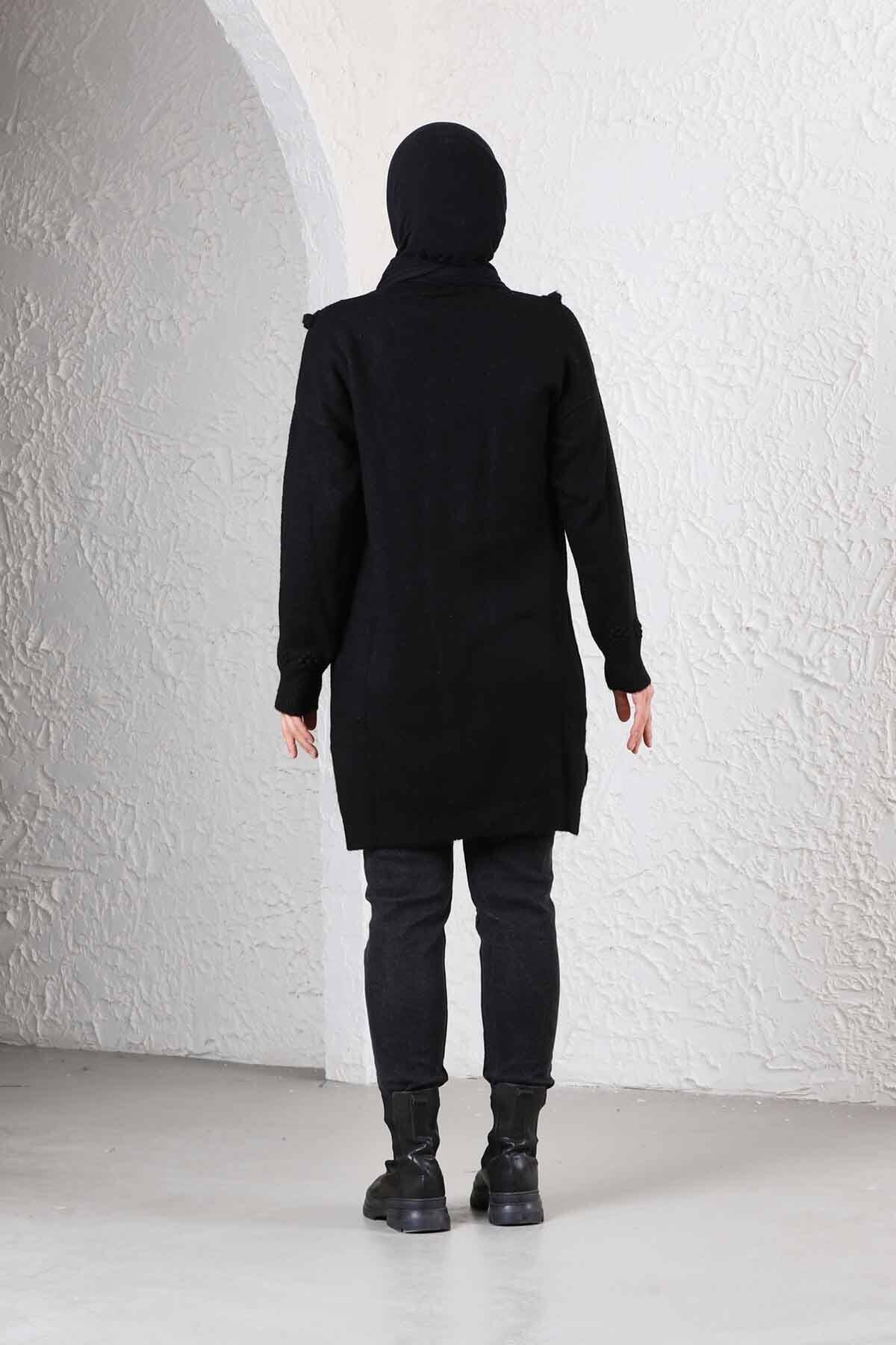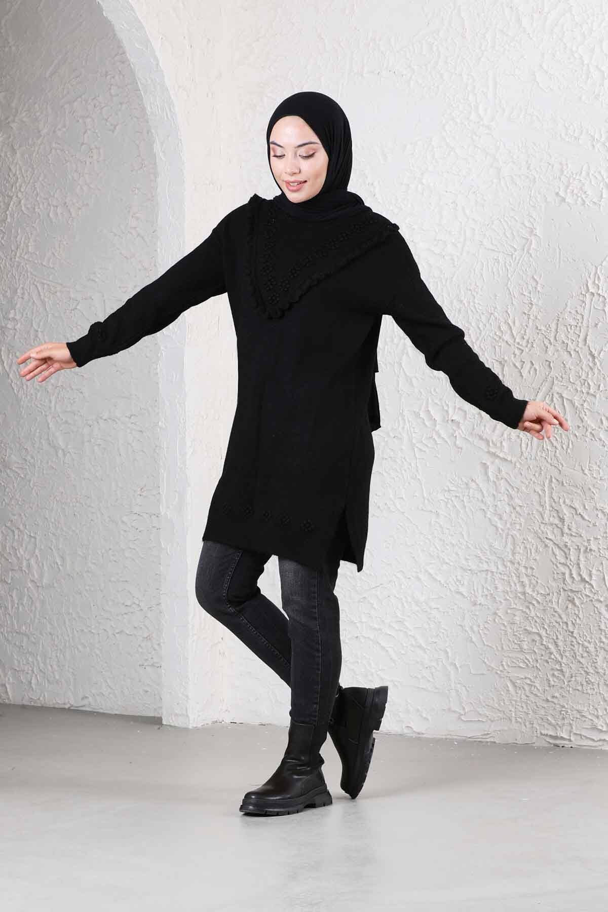 Çiçekli Kazak Siyah. Örme trikodur. Yumuşak dokuludr batma yapmaz. Çiçek detayları vardır. Bisiklet yaka. Rahat kalıp