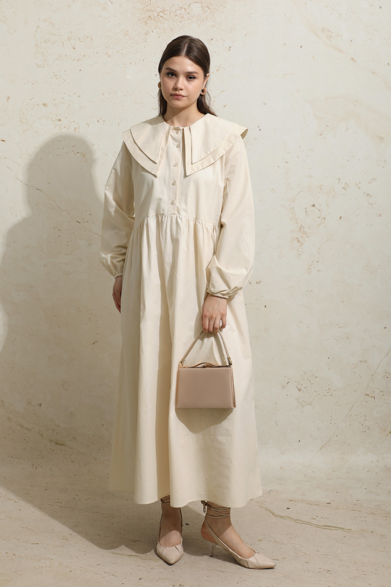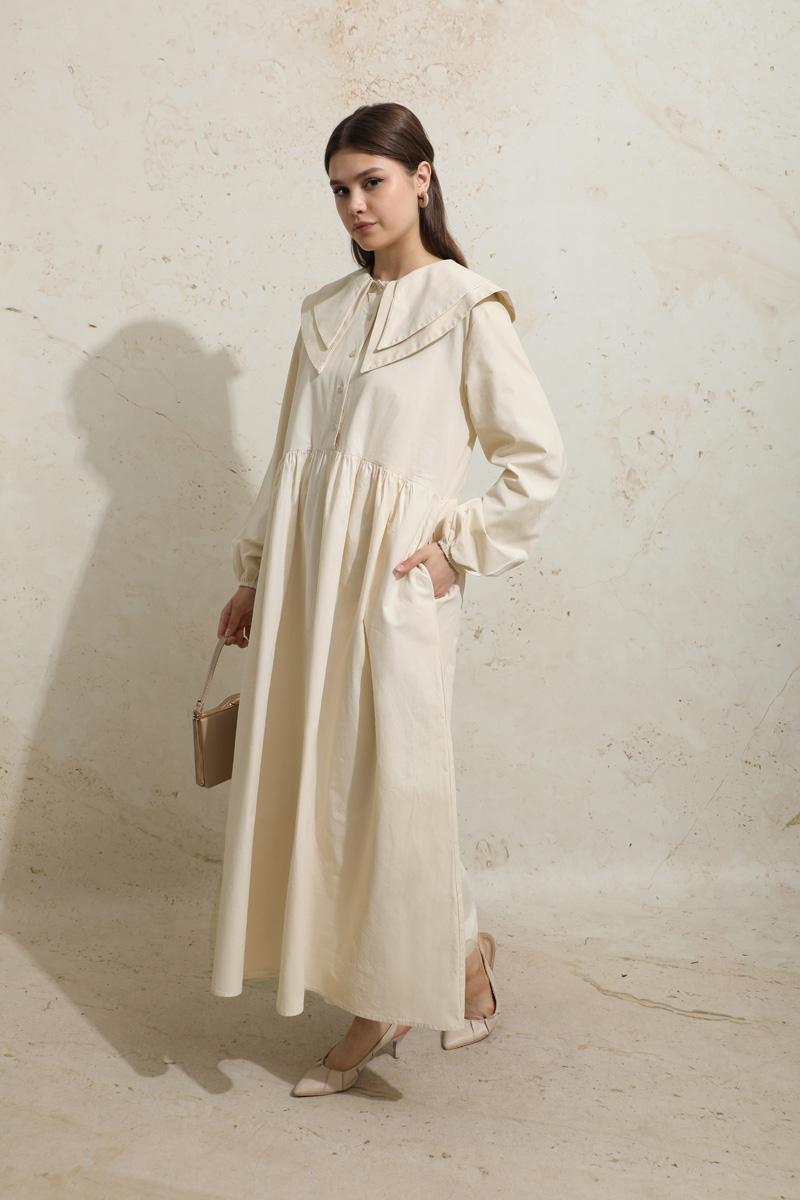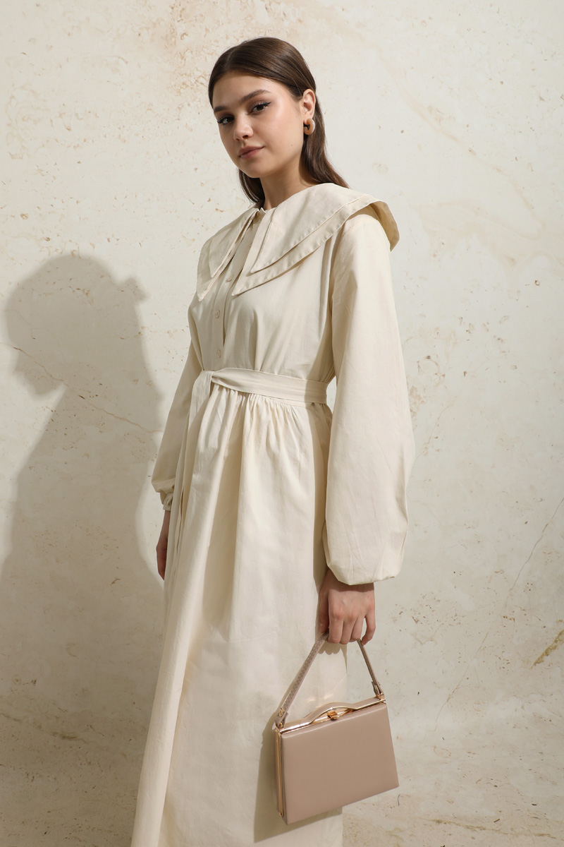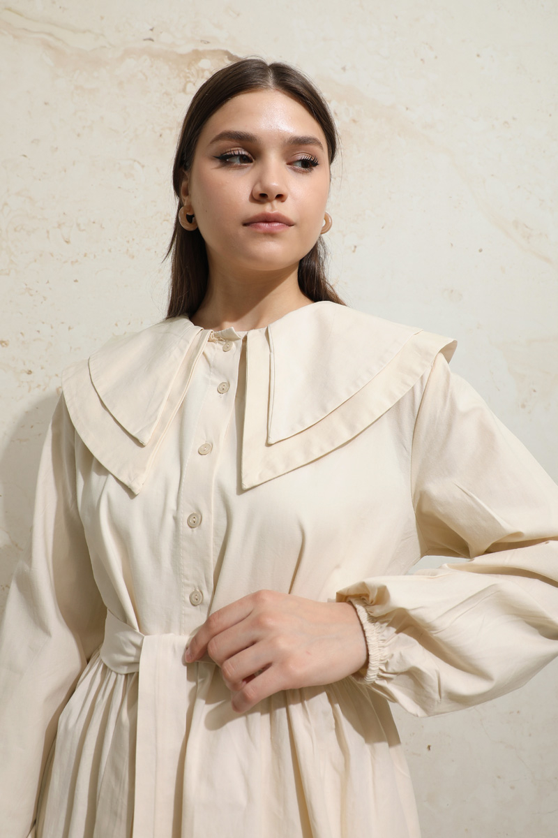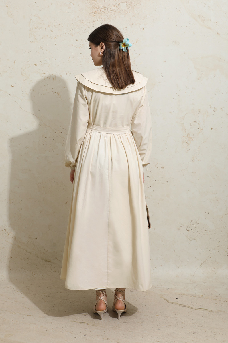 Çift Bebe Yaka Elbise Krem. Önden yarım düğmelidir,belden büzgülüdür,manşeti lastiklidir,kuşaklıdır,yandan gizli ceplidir,astarsızdır.