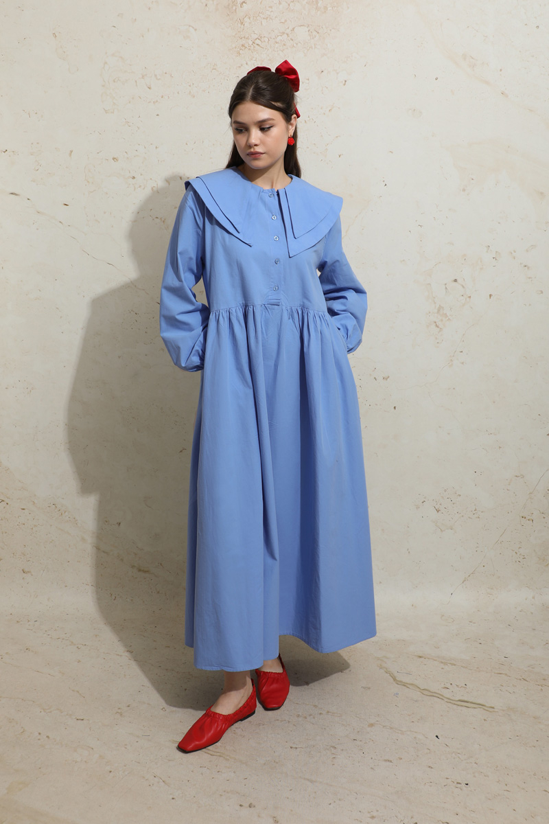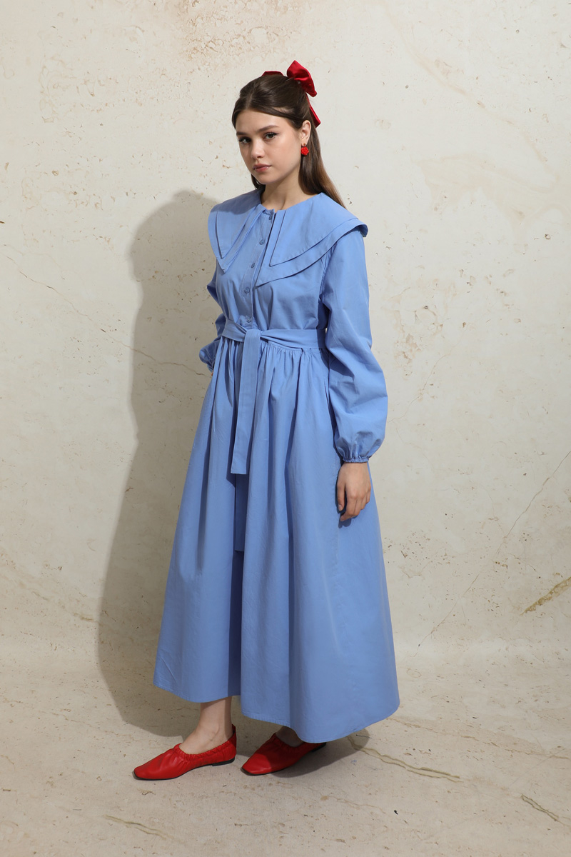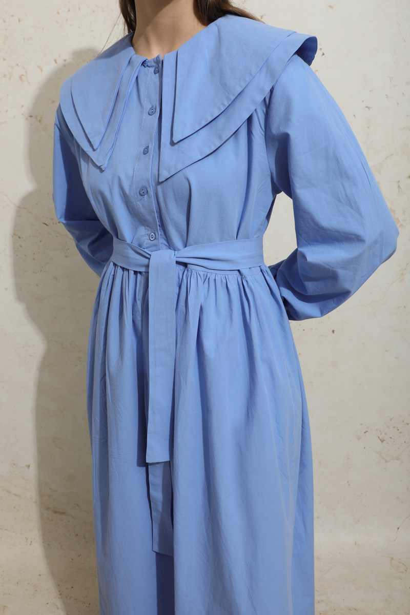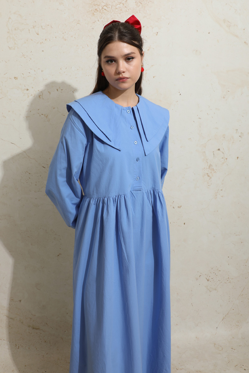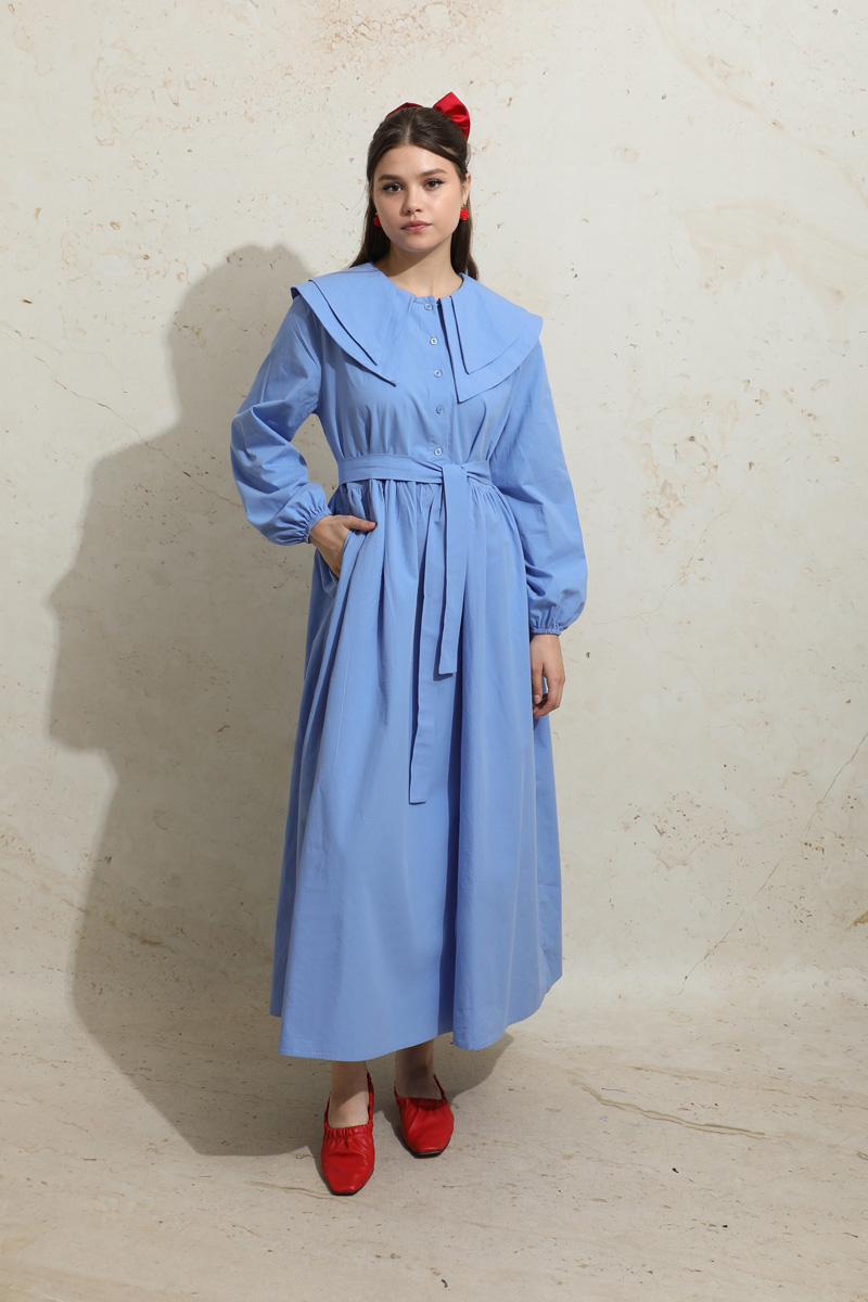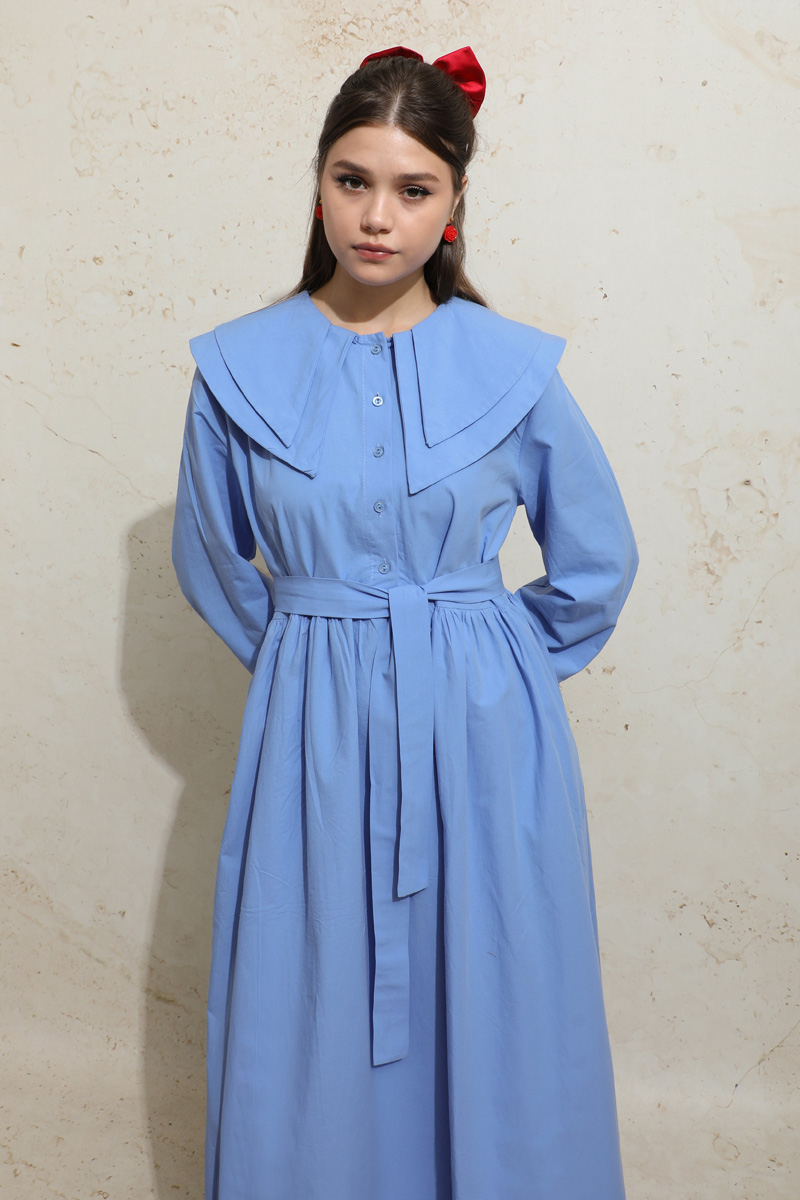 Çift Bebe Yaka Elbise Mavi. Önden yarım düğmelidir,belden büzgülüdür,manşeti lastiklidir,kuşaklıdır,yandan gizli ceplidir,astarsızdır.